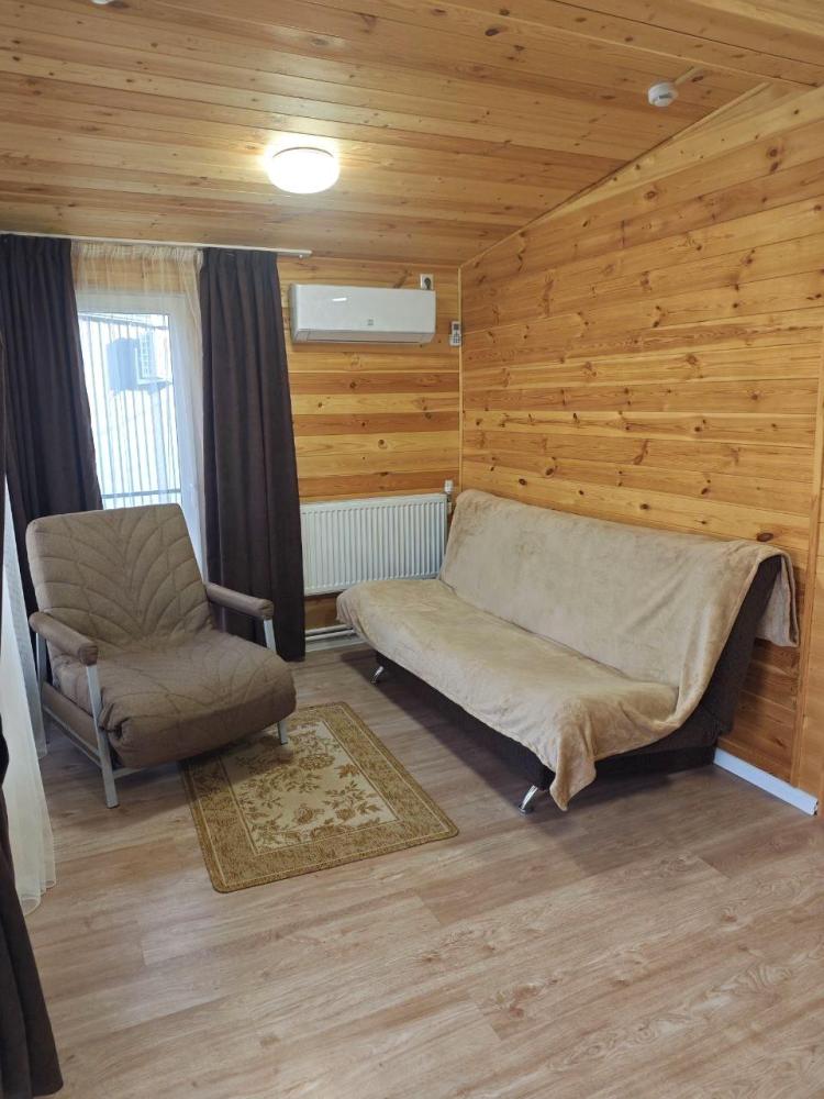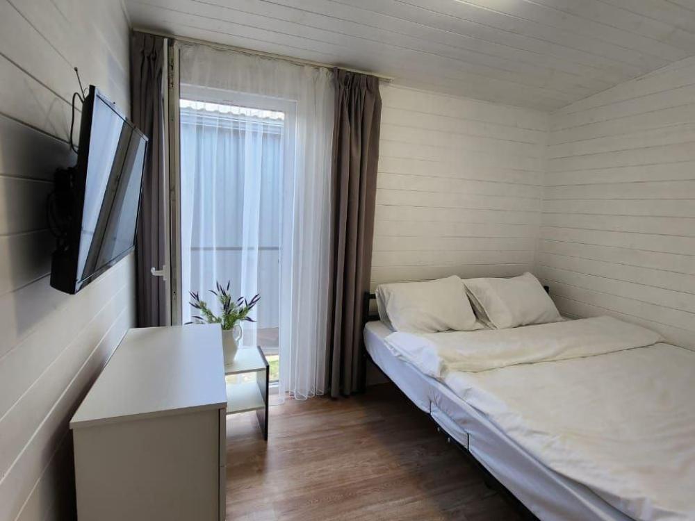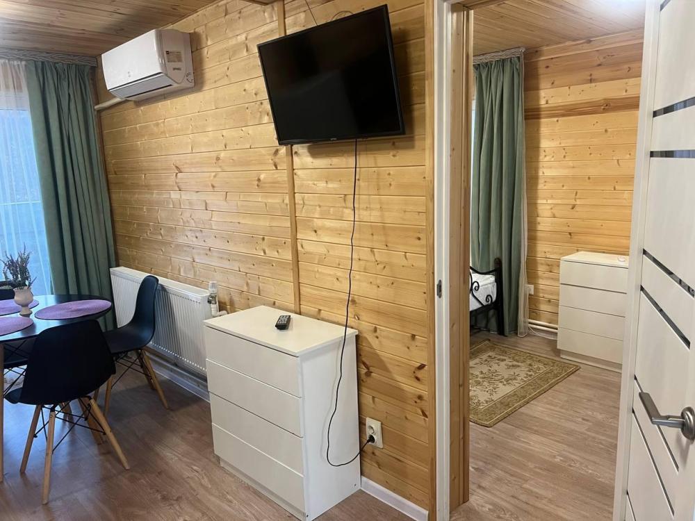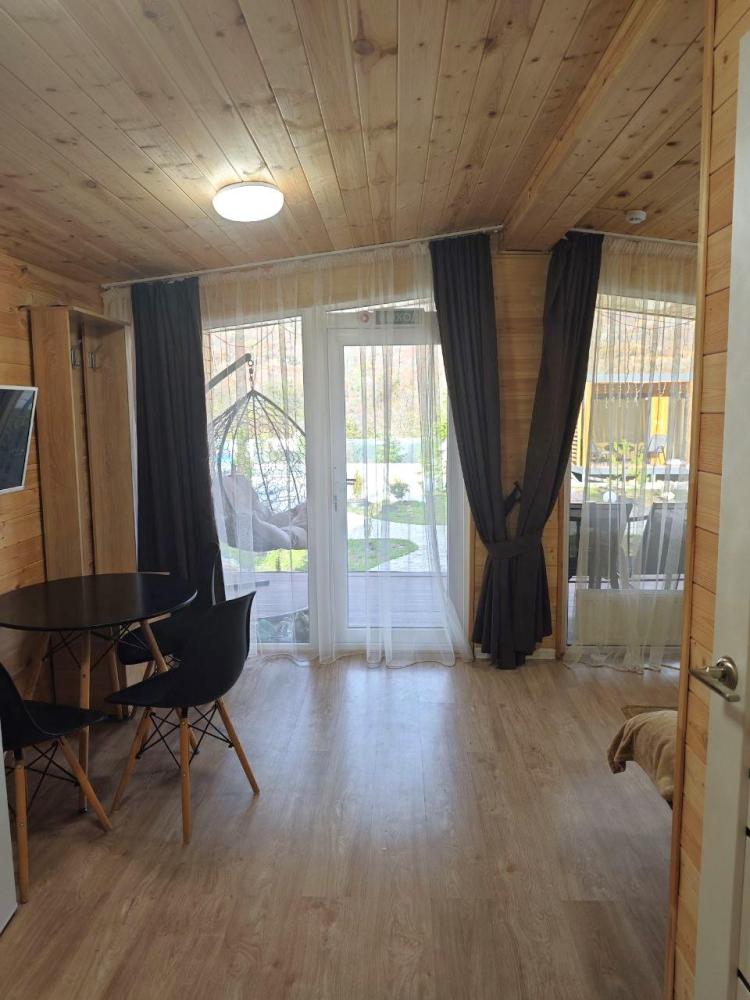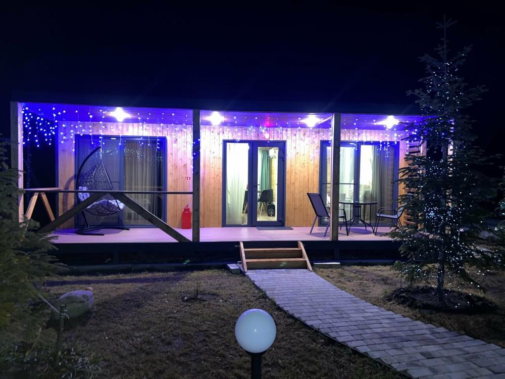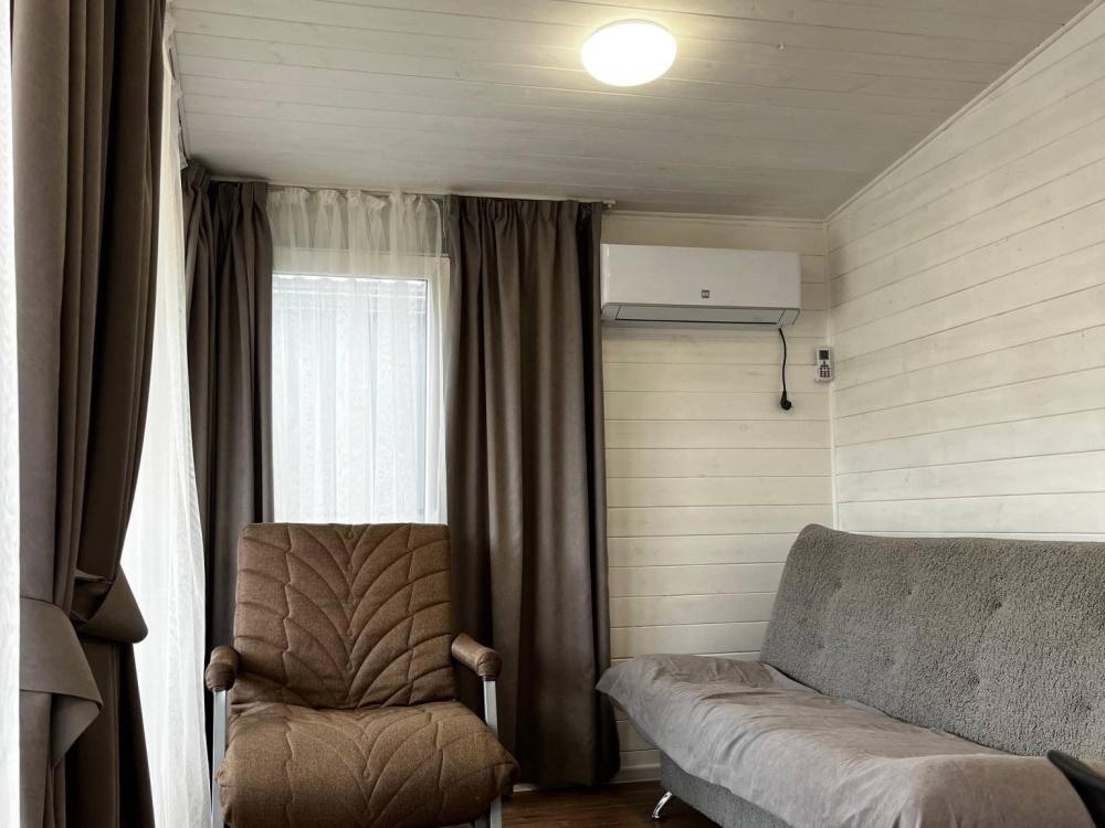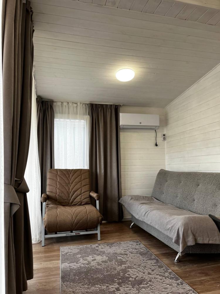 Уютный дом с террасой вместимостью до 5 гостей. Отдельная спальня и кухня-гостиная. Спальные места: двуспальная кровать, двуспальный диван-кровать, раскладное кресло. В домике всё необходимое для комфортного проживания: кухня (электрическая плита, холодильник, чайник, СВЧ-печь, посуда и принадлежности), TV, сплит-система, отопление, обеденная зона, санузел с душевой кабиной.