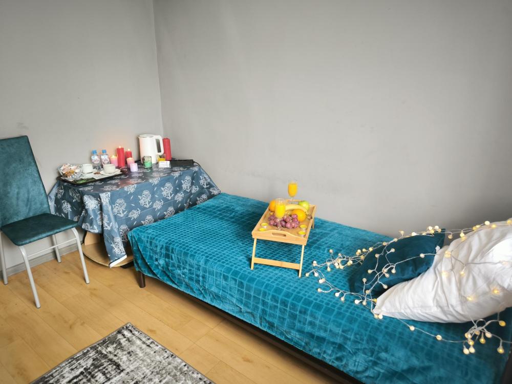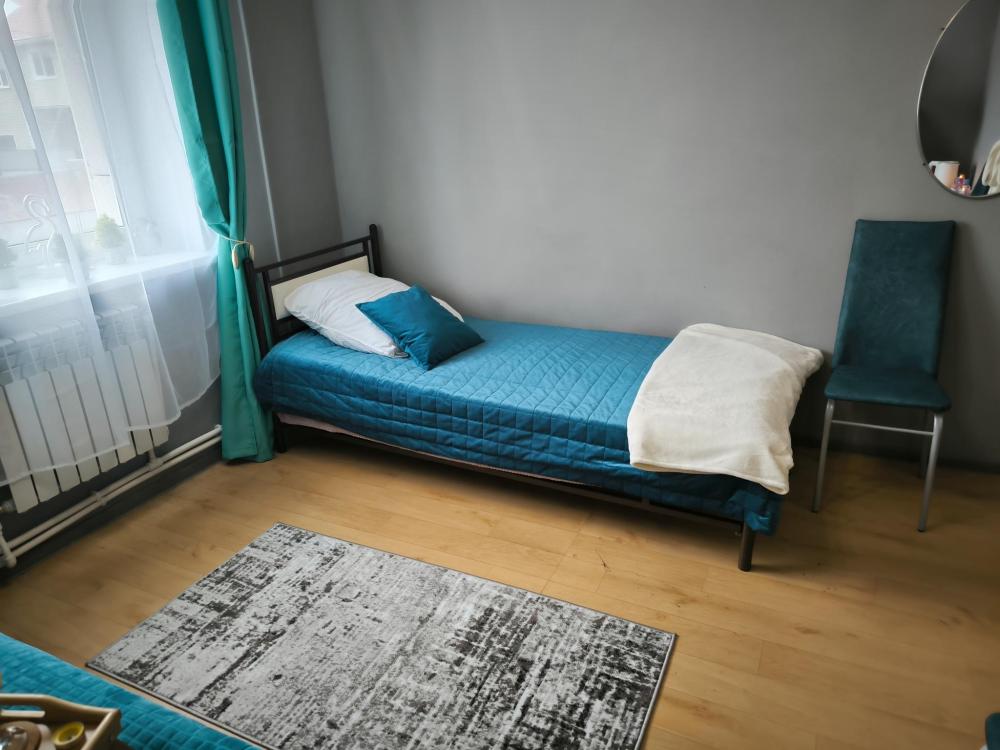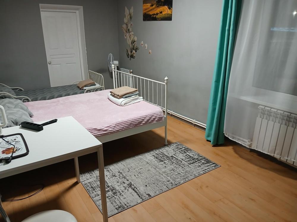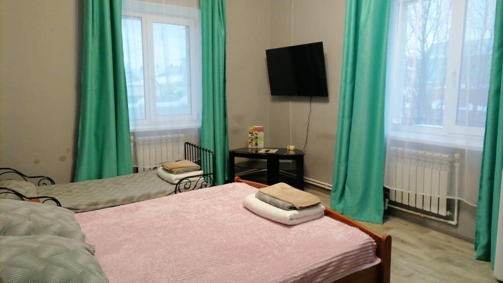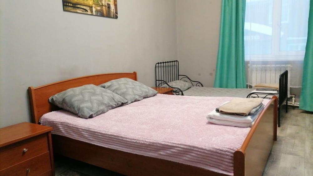 3-местный номер с двухспальной и односпальной кроватями и холодильником. Общая кухня и с/у.