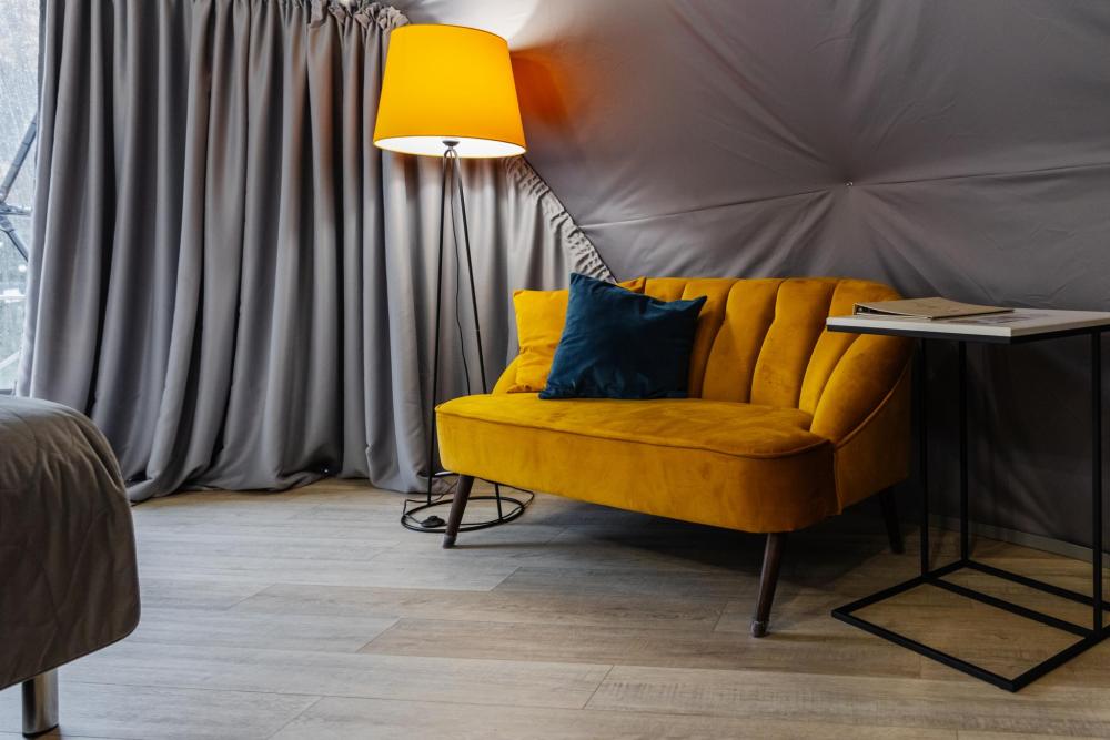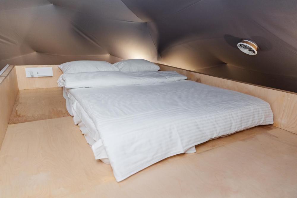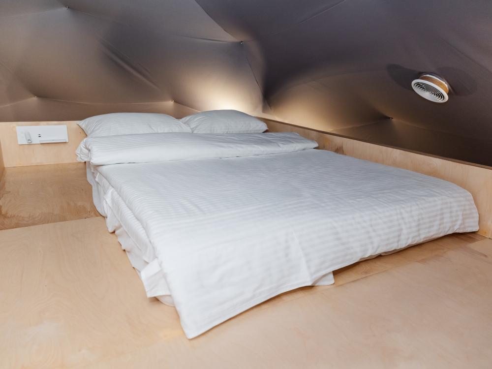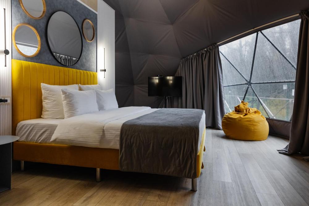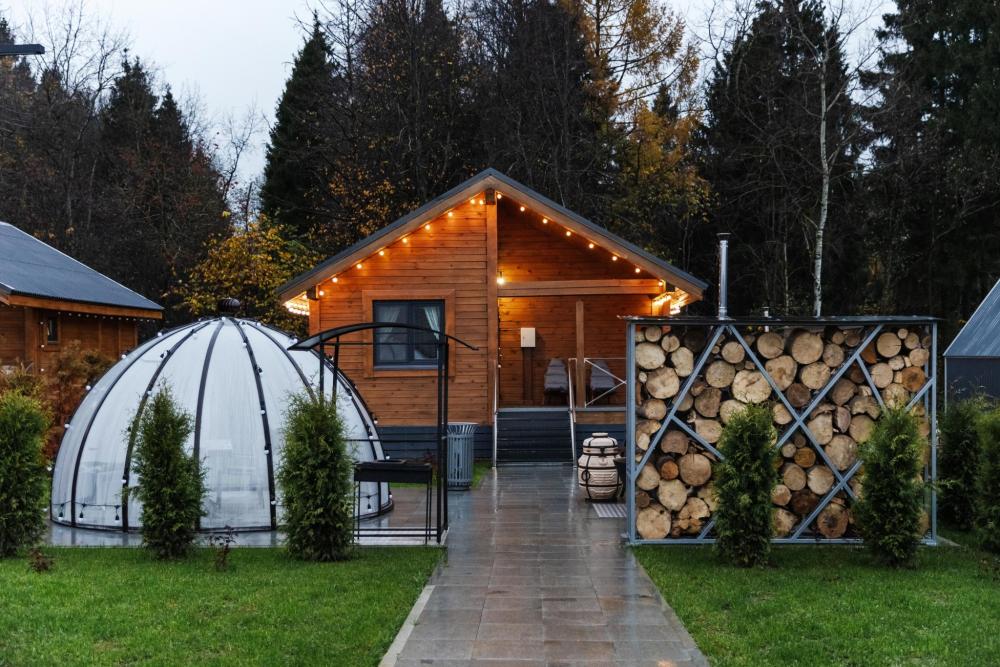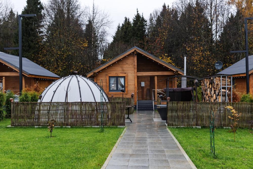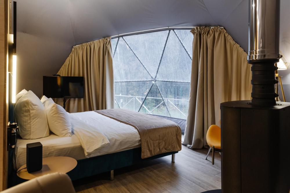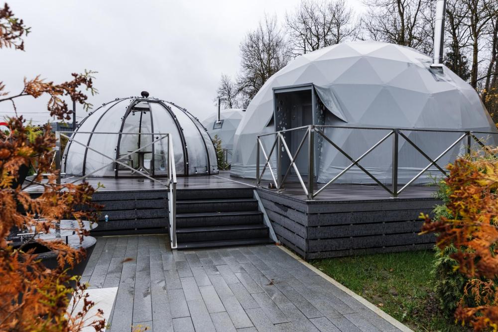 Сфера-шатер с прозрачной беседкой – ваш уютный уголок в любое время года Представьте себе просторный купол, где стильный дизайн сочетается с гармонией природы. Большие панорамные окна наполняют пространство светом, а вечером, приглушив свет, можно наблюдать за звёздами, не выходя из номера. Зимой здесь особенно волшебно: снежные шапки на деревьях, потрескивание дров в каминной печи и уют пледов. Летом – свежесть леса, пение птиц и прохлада после жаркого дня. А в любое время года вас ждёт прозрачная купольная беседка – идеальное место для завтраков с видом на рассвет или романтических ужинов под мерцающими гирляндами. После дня прогулок по лесу или активного отдыха можно расслабиться в Сибирском Банном Чане – горячая вода, ароматный пар и тишина вокруг создают ощущение настоящего спа в дикой природе. А если хочется классического пара – к вашим услугам Баня "Квадро" на дровах с живым огнём и душистыми вениками. Эта сфера-шатер создана для тех, кто ценит уединение, комфорт и близость к природе – без компромиссов.