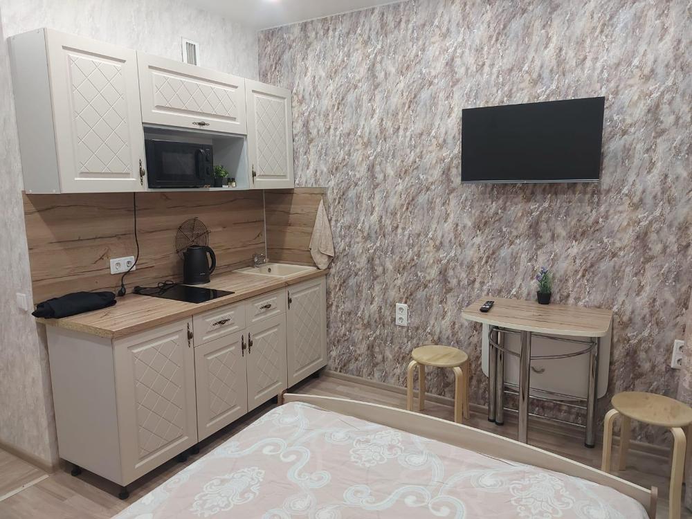 Уютные апартаменты-студия, оборудованные всем необходимым для комфортного проживания. В квартире есть всё для комфортного проживания: двуспальная кровать, чистое постельное белье и полотенца, телевизор с кабельным ТВ, Wi-Fi, холодильник, чайник, микроволновка, индукционная плита, стиральная машина, фен и посуда.