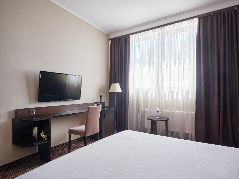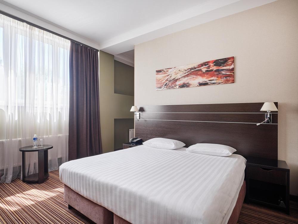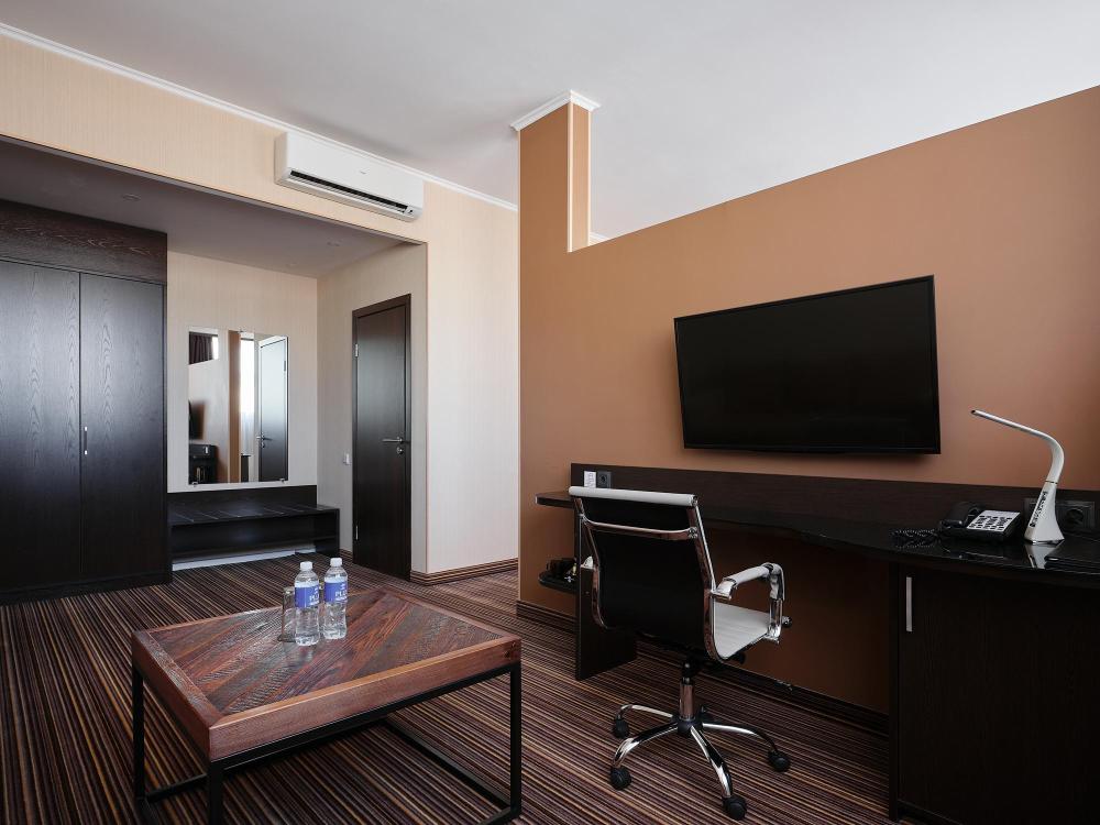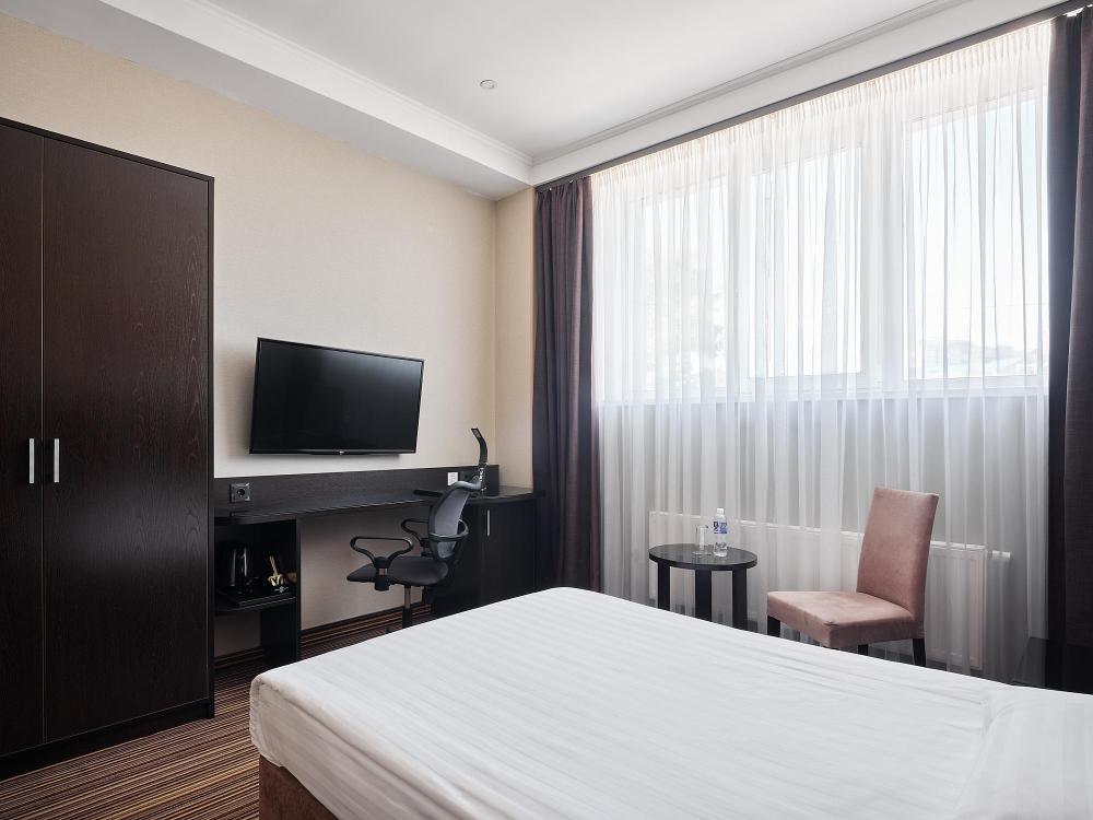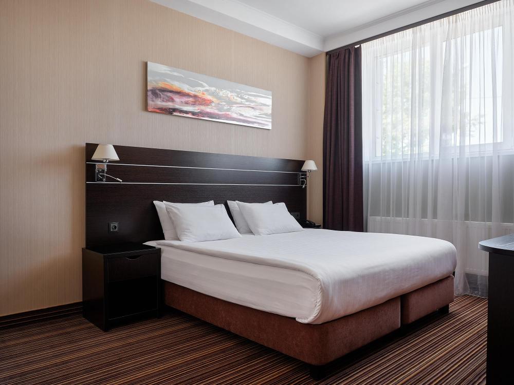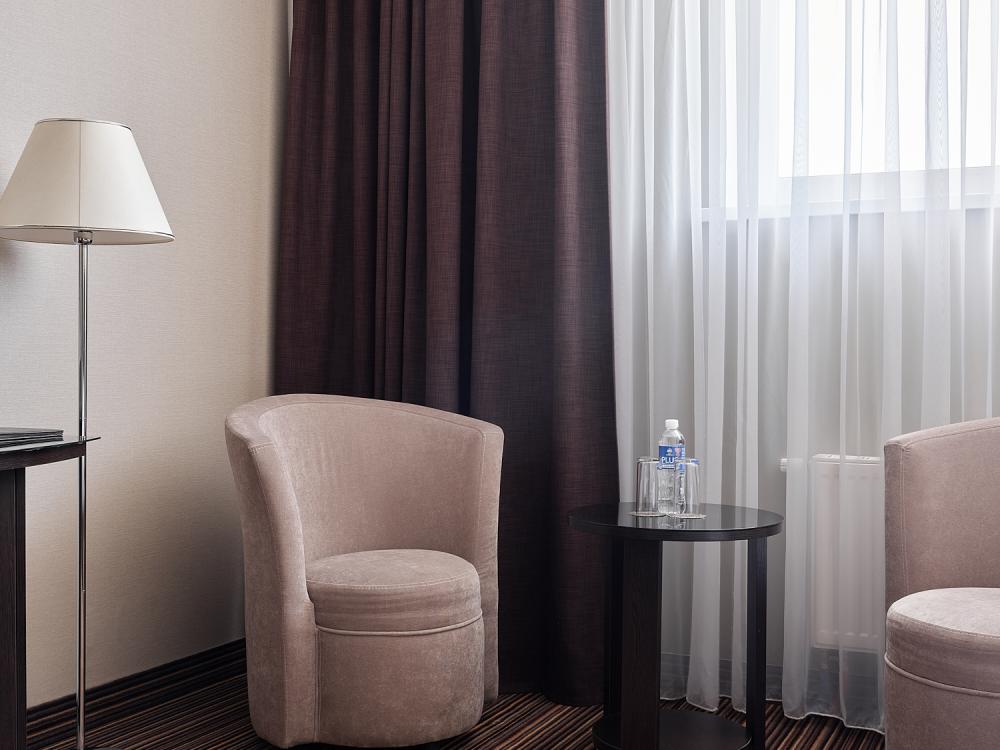 Комфортабельный, просторный полулюкс. В номере двуспальная кровать или две раздельные кровати, телевизор с плоским экраном, стационарный телефон, сейф, кондиционер, отопление, чайная станция, прикроватные тумбы, санузел с ванной, фен, халат, тапочки, косметические принадлежности.