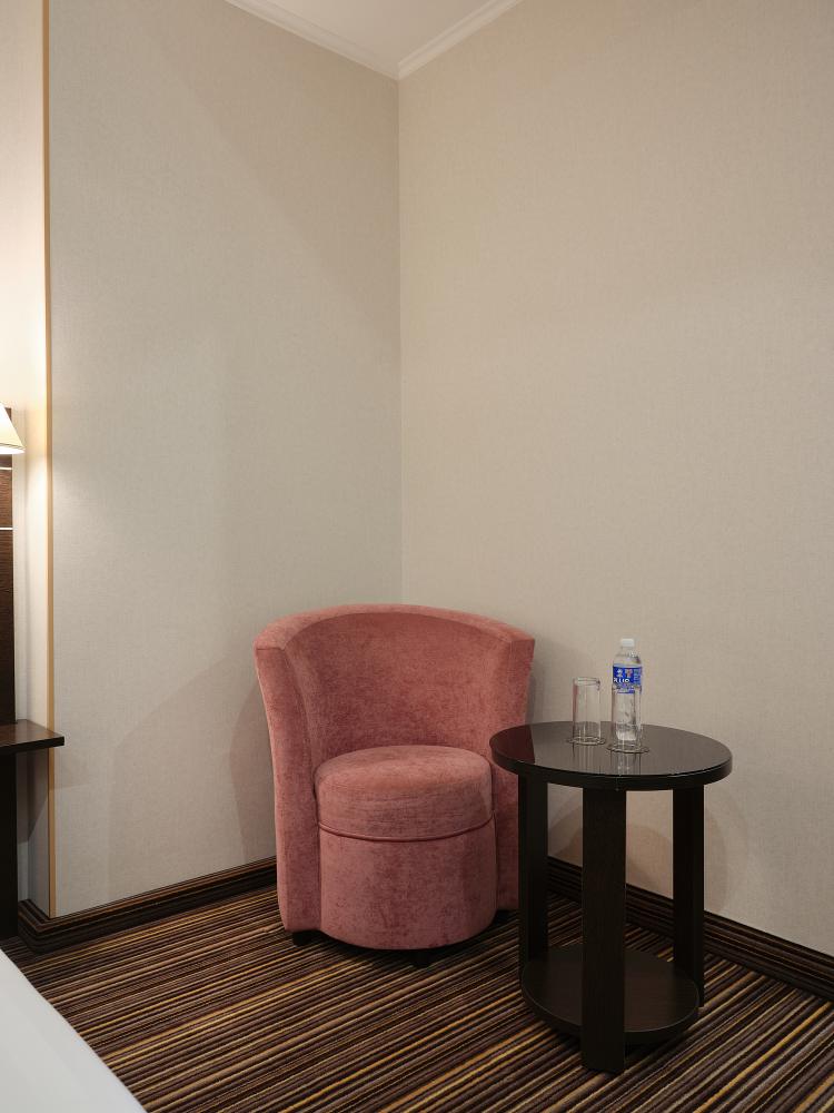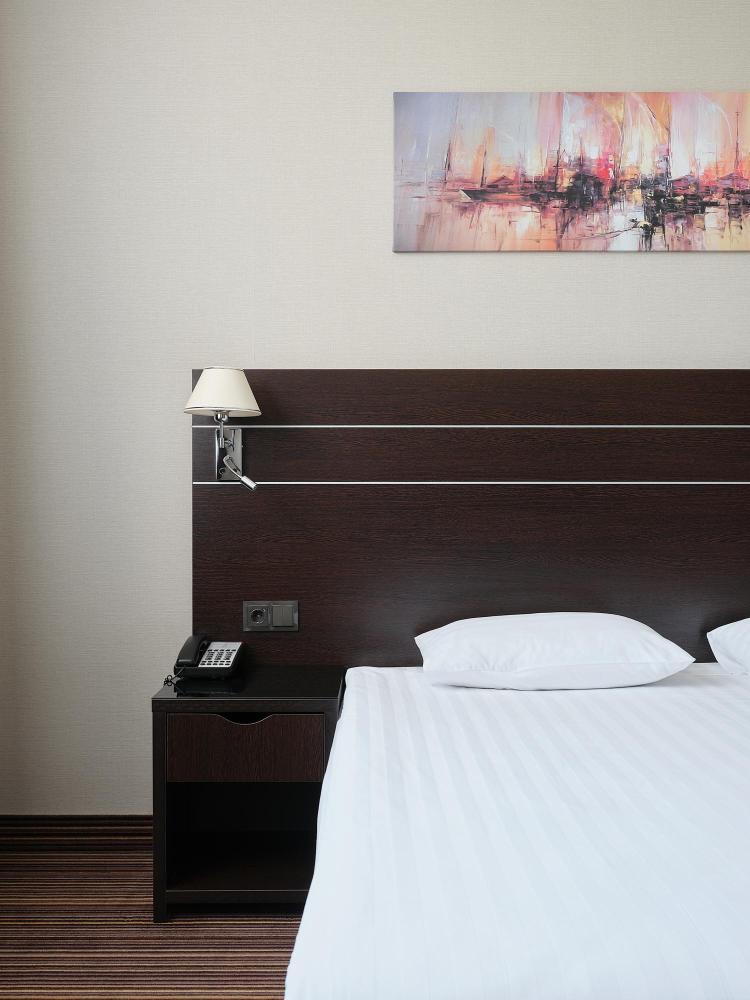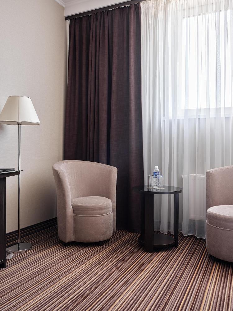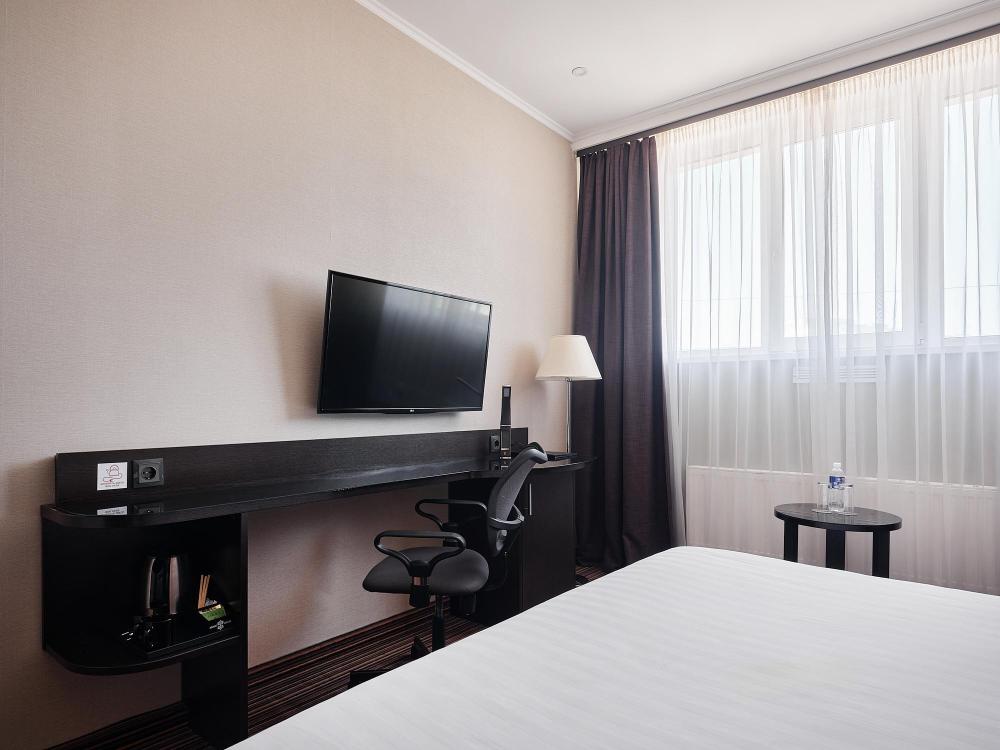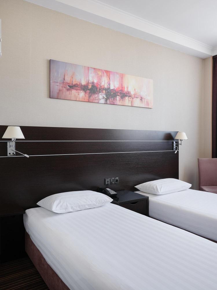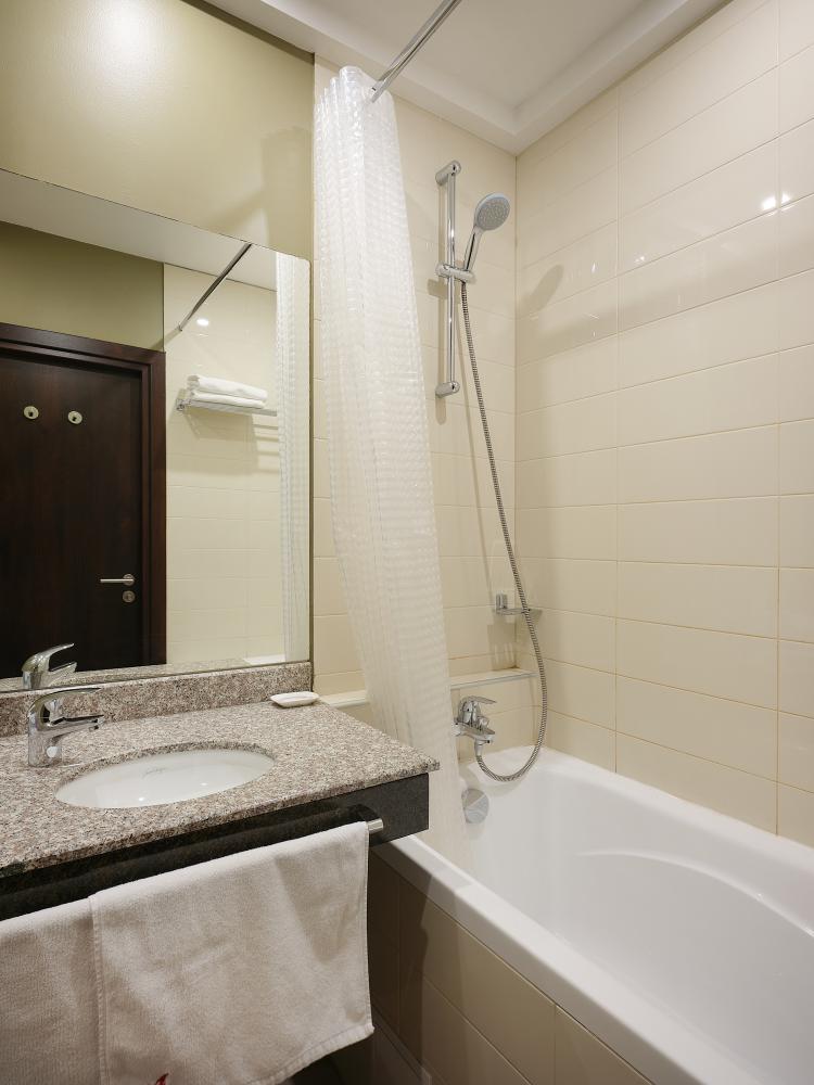 Комфортабельный, просторный полулюкс. В номере двуспальная кровать или две раздельные кровати, телевизор с плоским экраном, стационарный телефон, сейф, кондиционер, отопление, чайная станция, прикроватные тумбы, санузел с ванной, фен, халат, тапочки, косметические принадлежности.