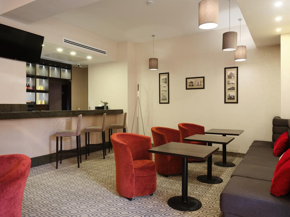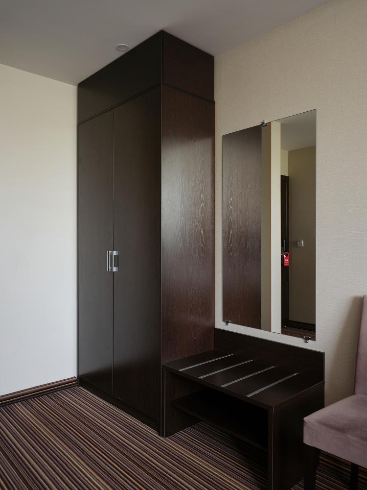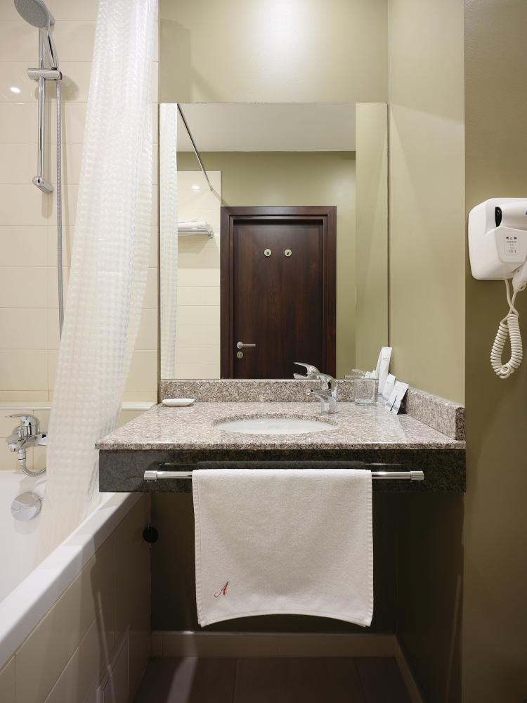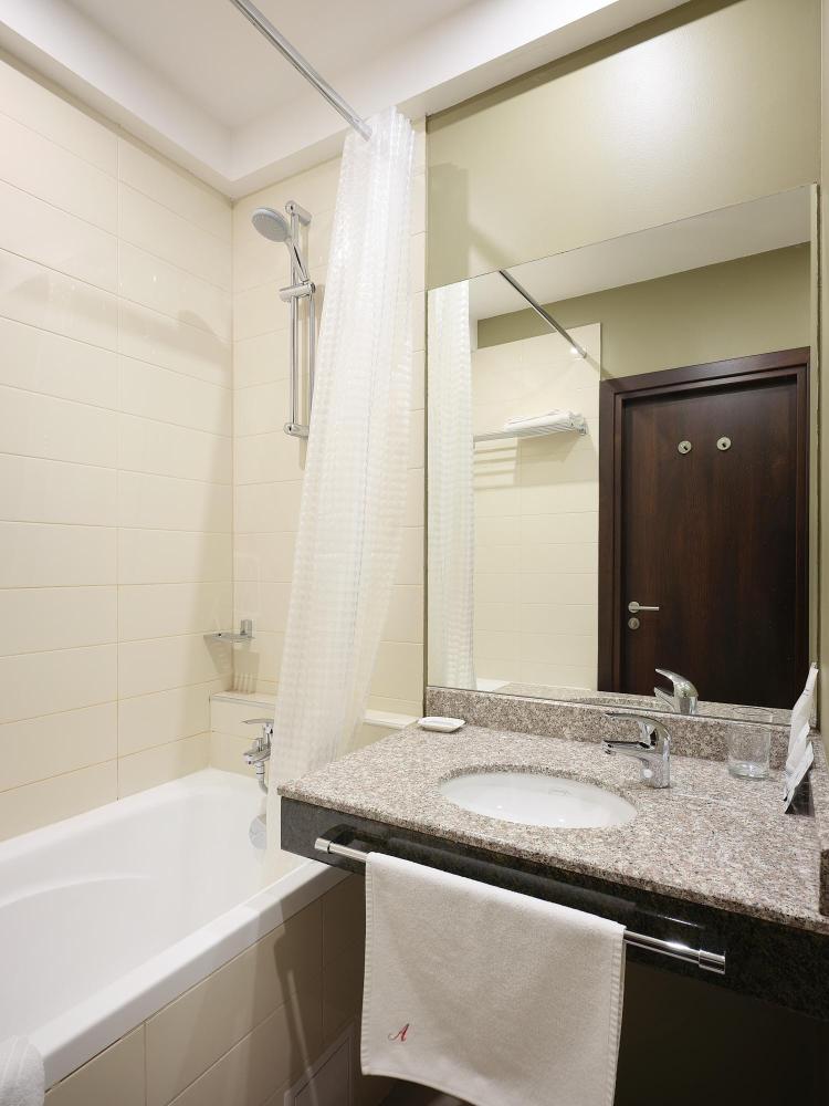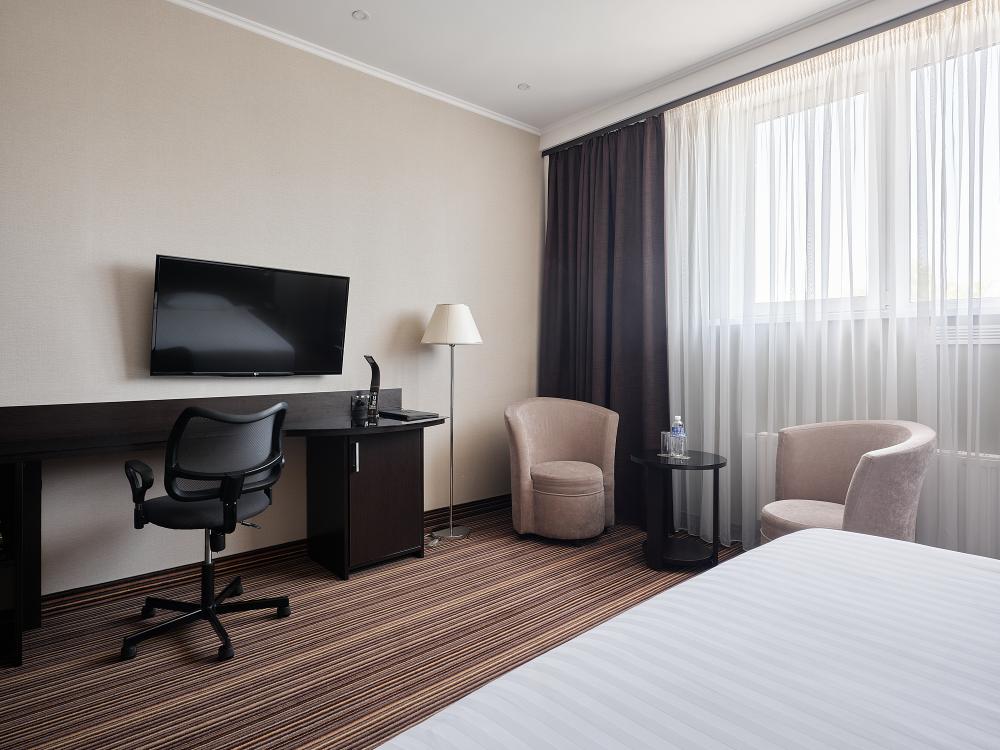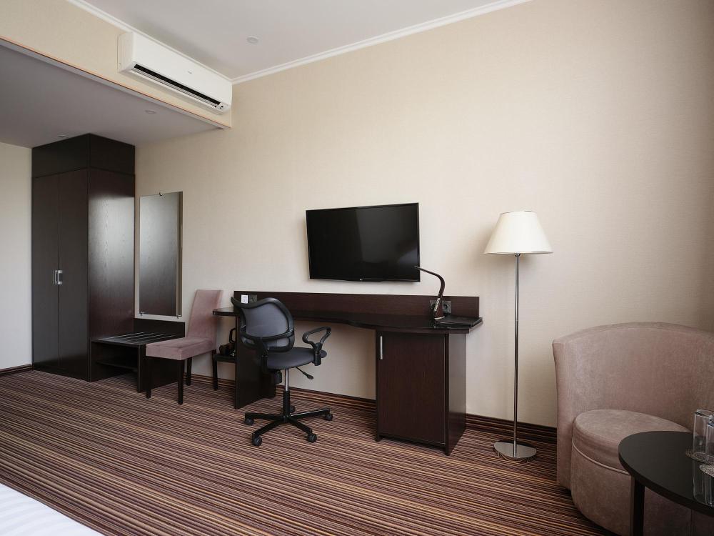 Комфортабельный, просторный полулюкс. В номере двуспальная кровать или две раздельные кровати, телевизор с плоским экраном, стационарный телефон, сейф, кондиционер, отопление, чайная станция, прикроватные тумбы, санузел с ванной, фен, халат, тапочки, косметические принадлежности.