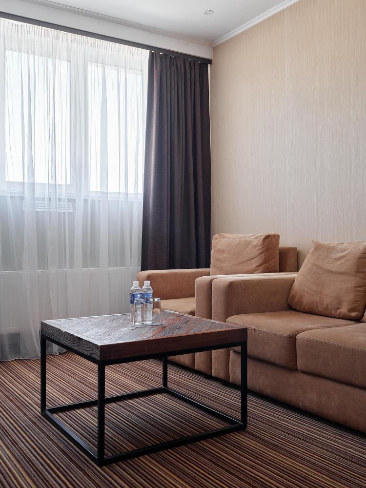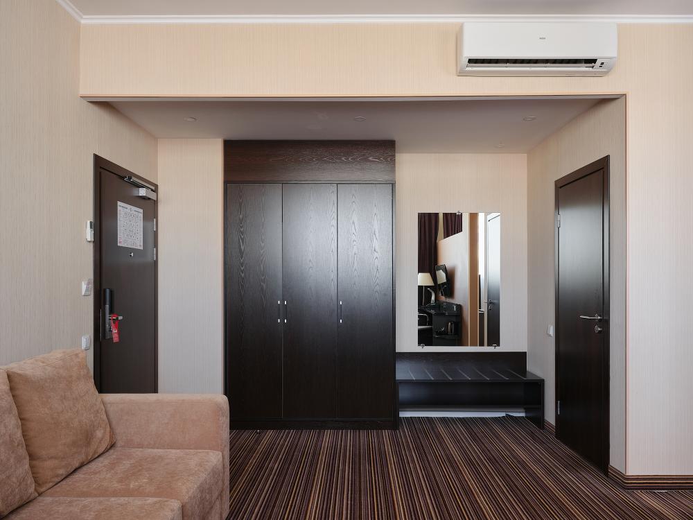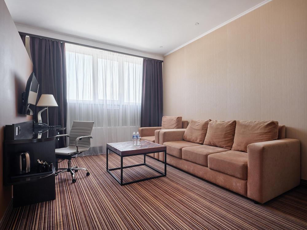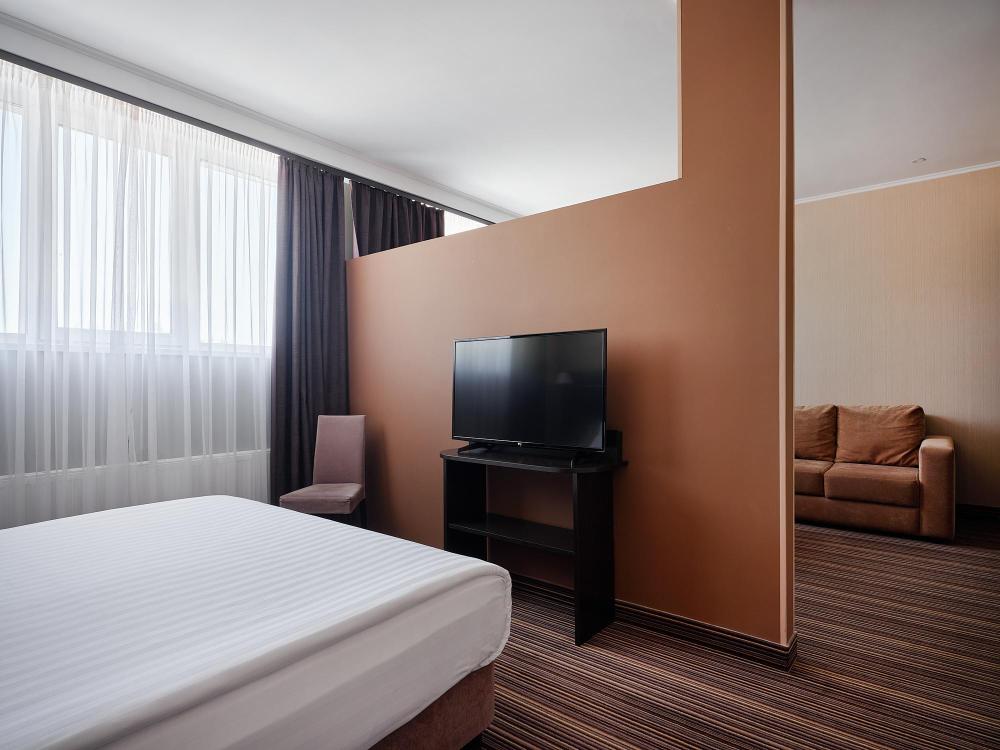 Двухкомнатный номер повышенной комфортности площадью 40 м2 с системой электронного доступа. Имеет гостиную с мягким уголком и спальню с кроватью размера king-size с ортопедическим матрасом. Оборудован эргономичной и функциональной мебелью, с использованием экологичных материалов и новейших технологий. Кофейные и чайные принадлежности. Фен, халаты, тапочки и косметический набор премиум класса для каждого гостя. Индивидуальный сейф.