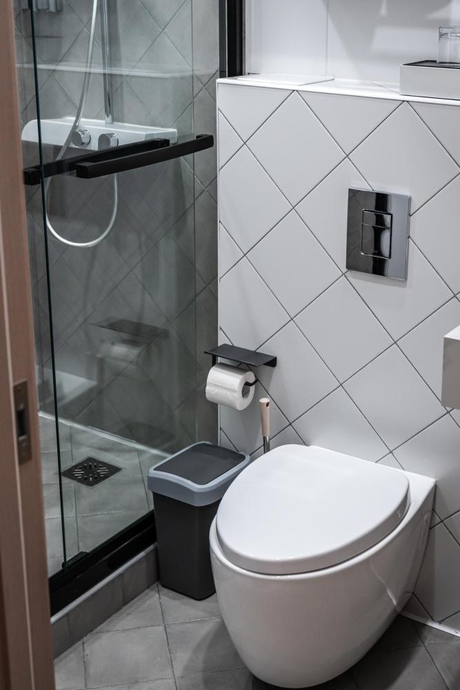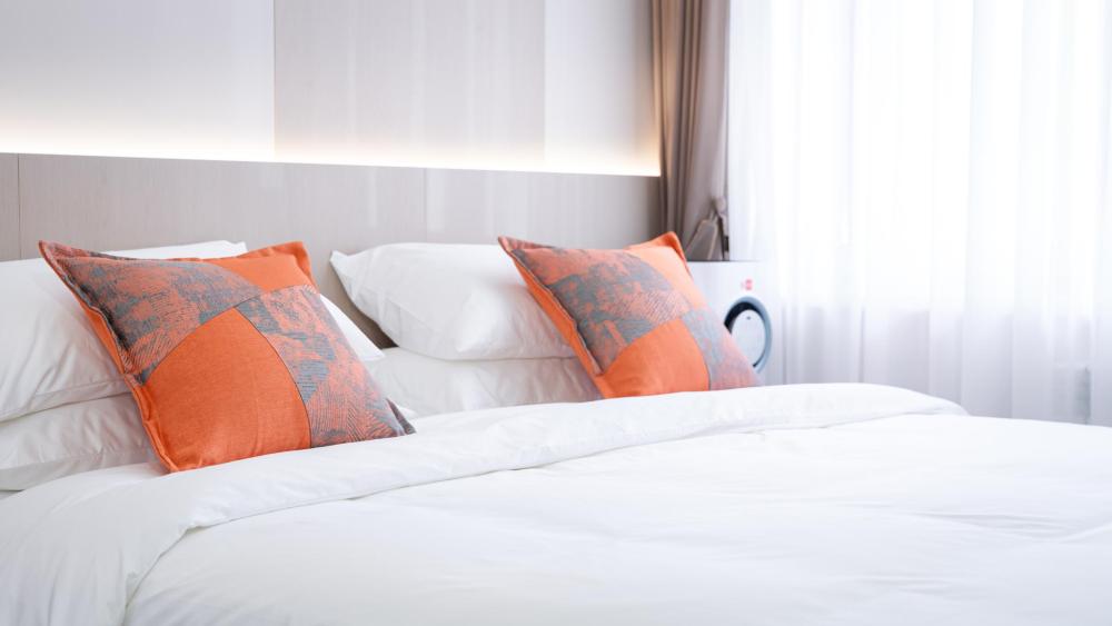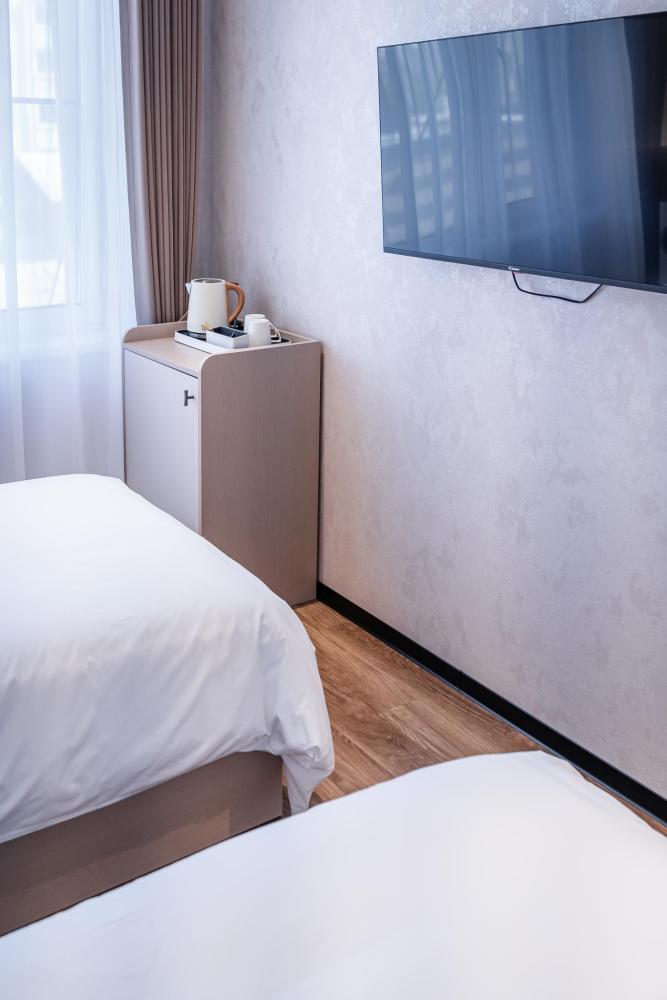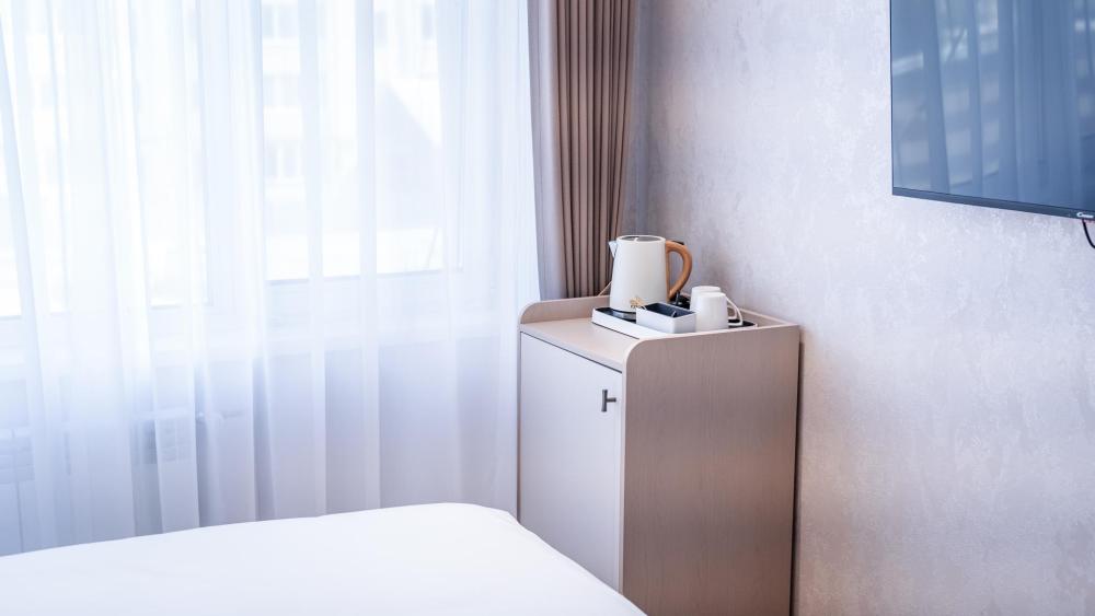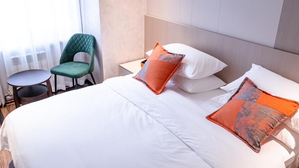 Светлый номер с двуспальной кроватью, большим окном, телевизором и собственным санузлом.
