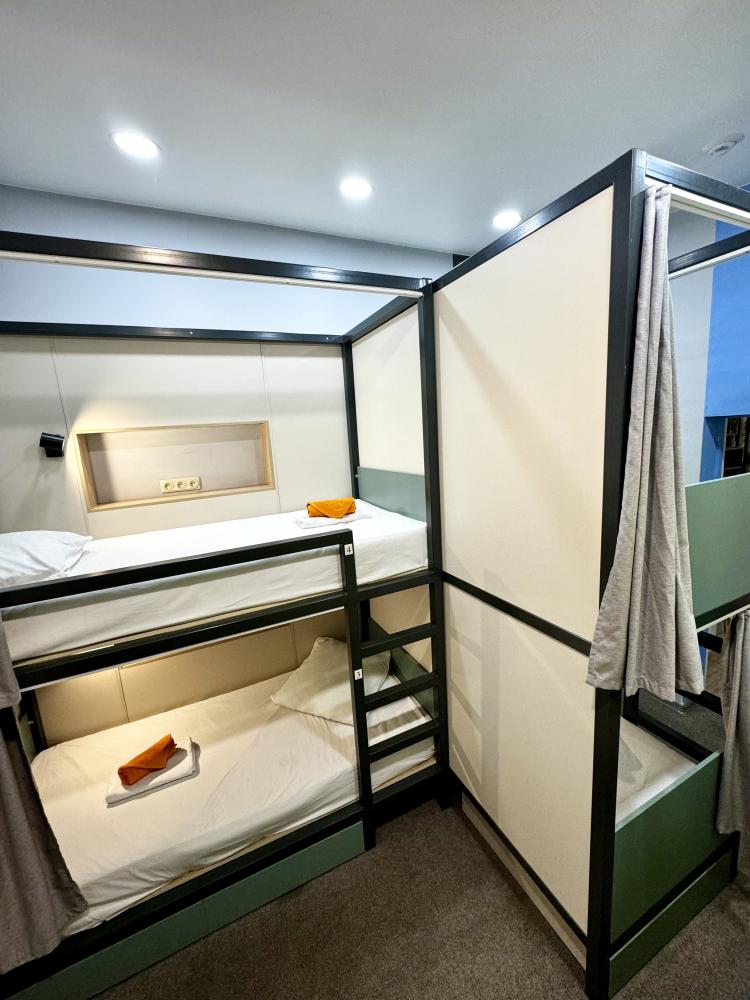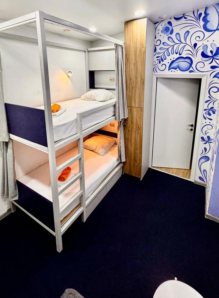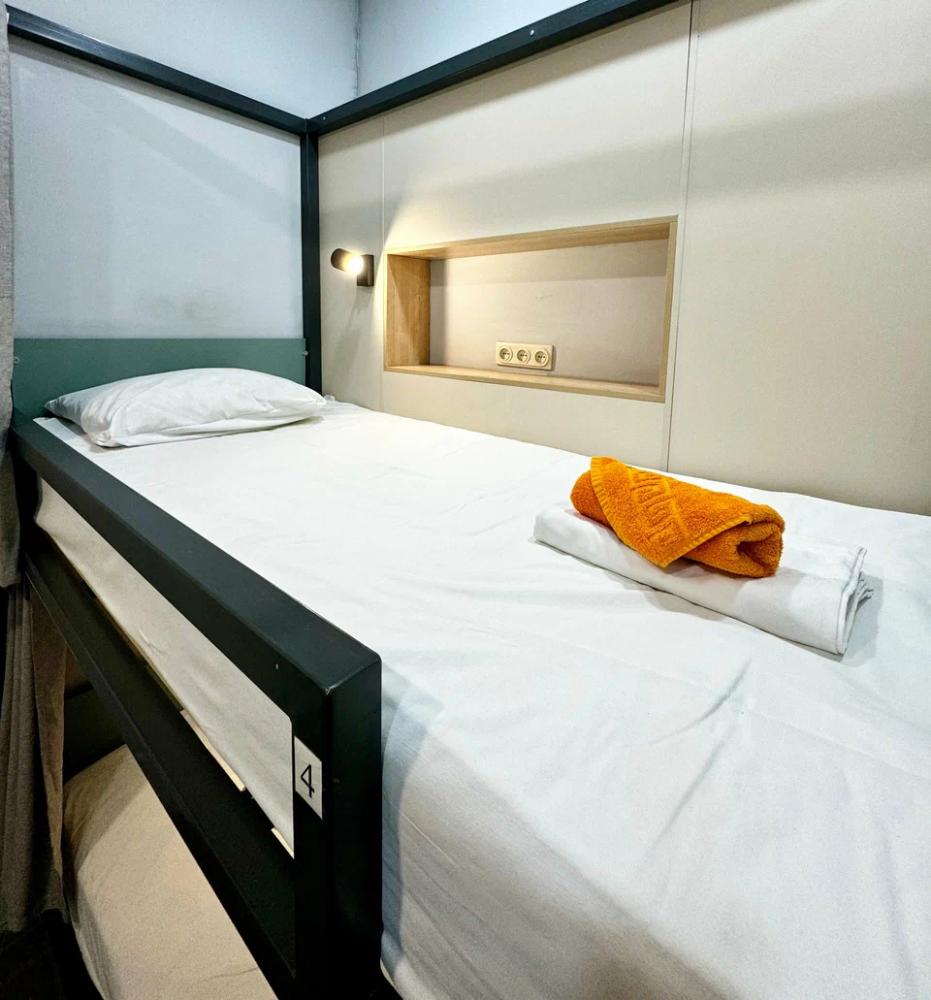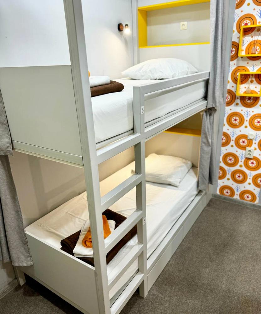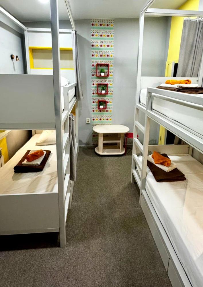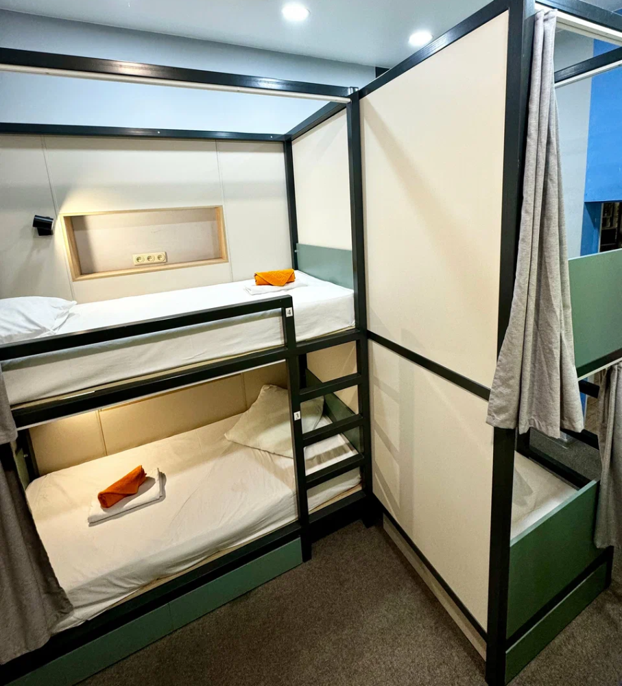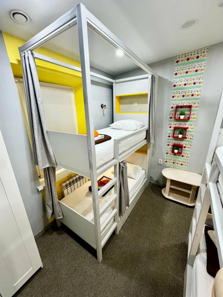 Койко-место в четырехместном, светлом и просторном женском номере с двумя двухъярусными кроватями. Для каждого спального места предусмотрена розетка, полочка для личных вещей, настенная лампа, штора, полотенце, постельное белье. В самом номере расположен туалет и умывальник.