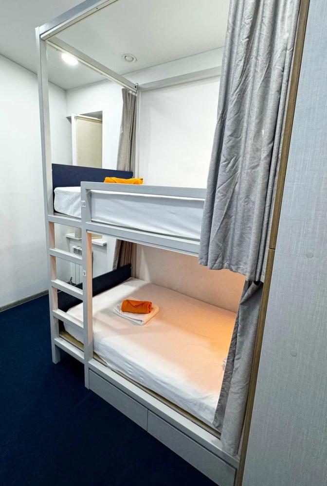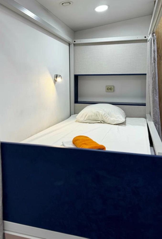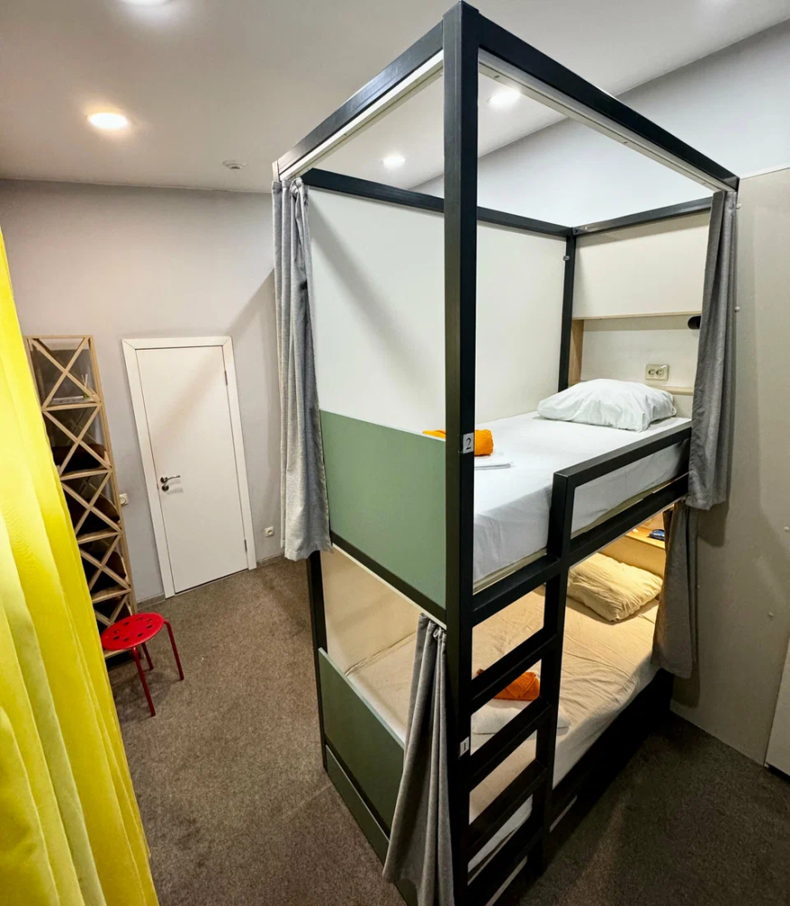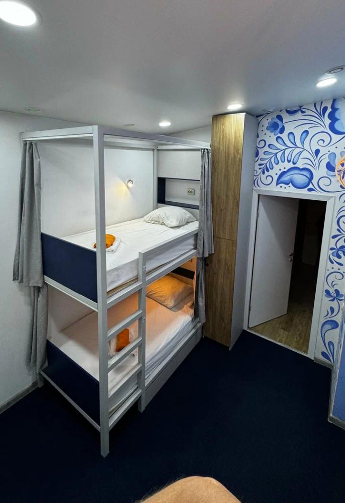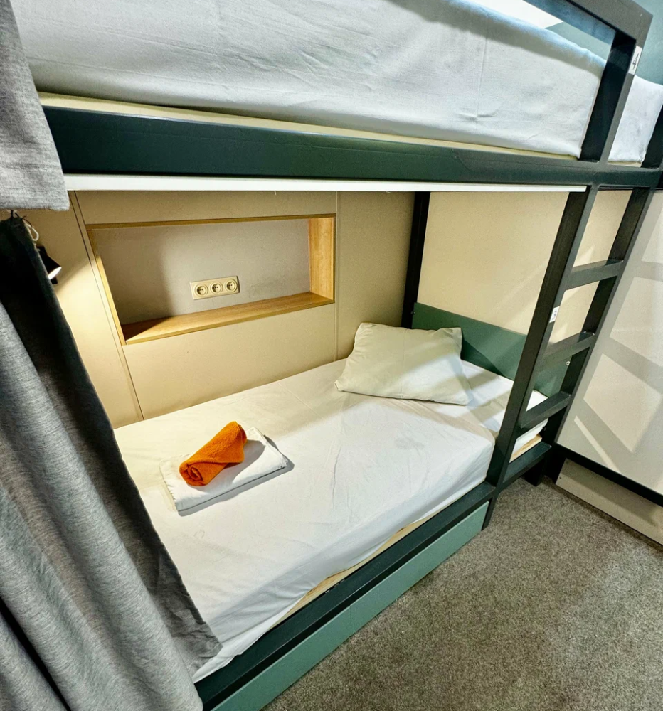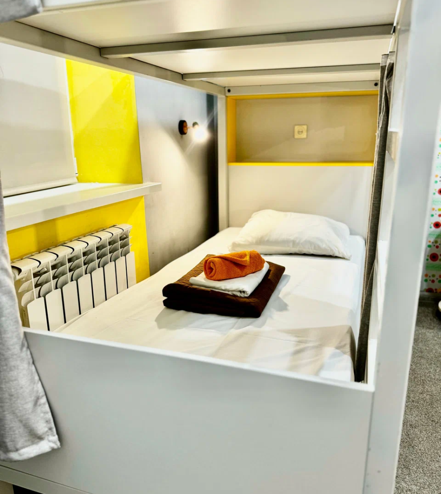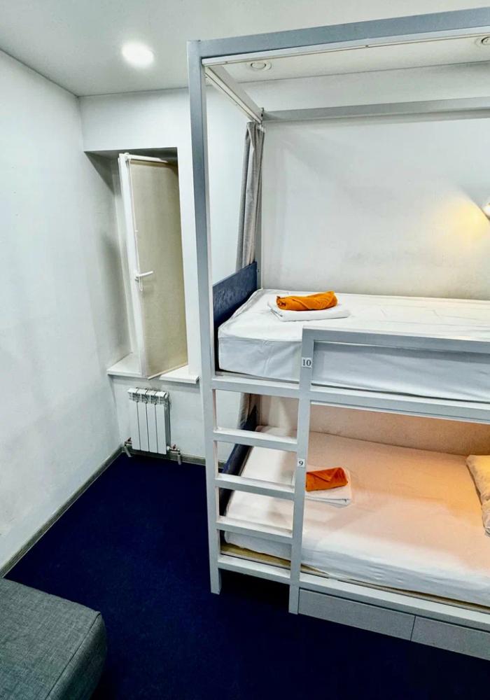 Койко-место в трехместном, светлом и просторном общем номере с двухъярусной кроватью и раскладным креслом. Для каждого спального места предусмотрена розетка, полочка для личных вещей, настенная лампа, штора, полотенце, постельное белье. В самом номере расположен туалет и умывальник.