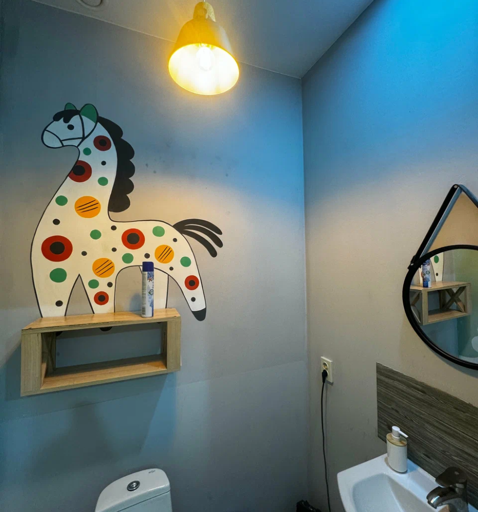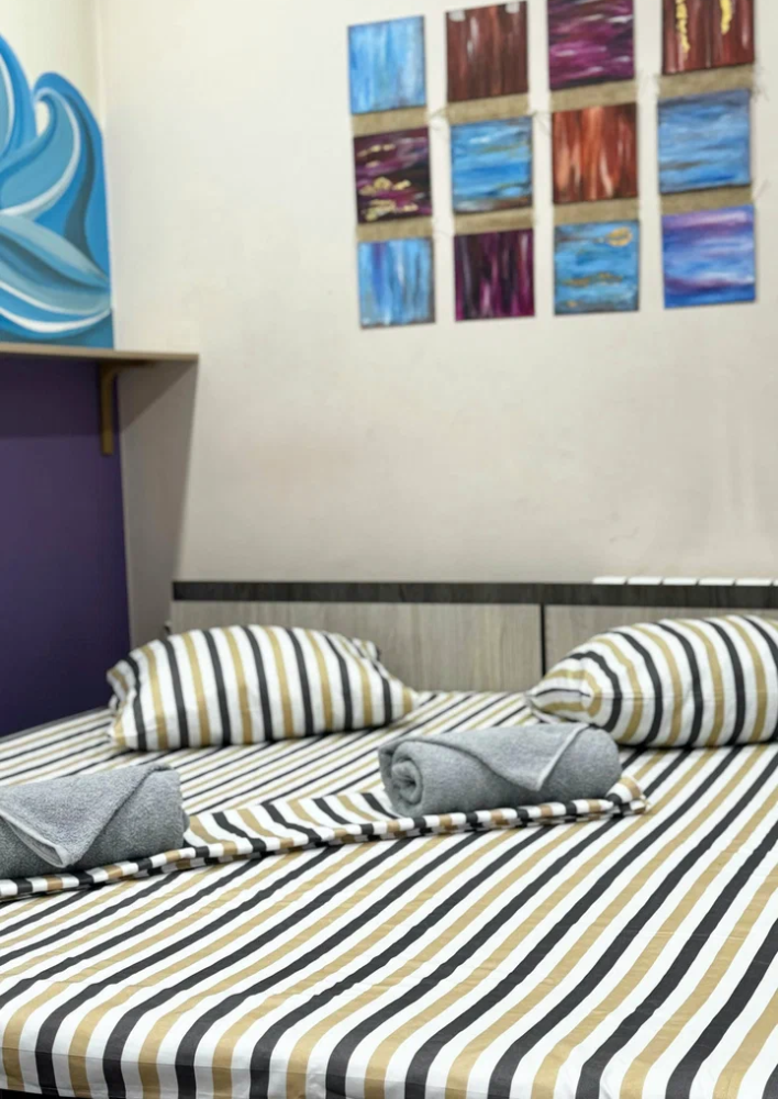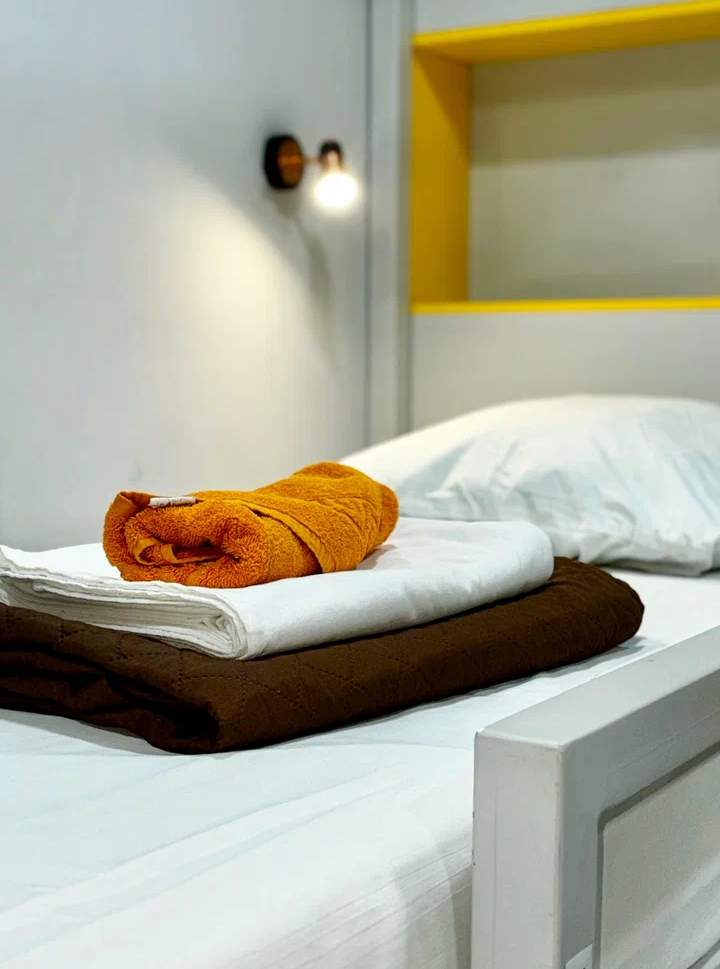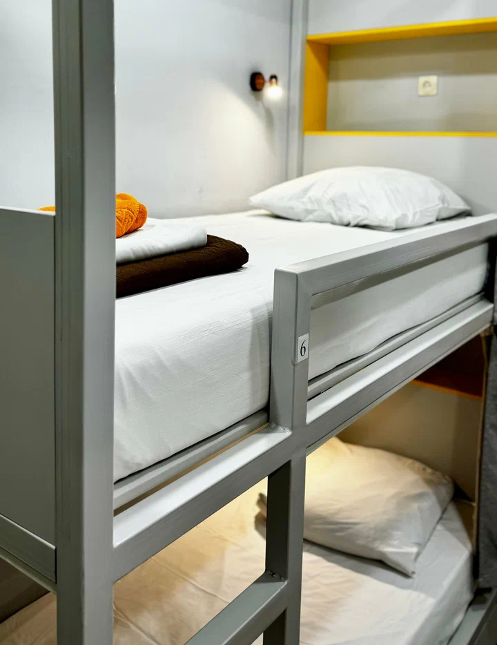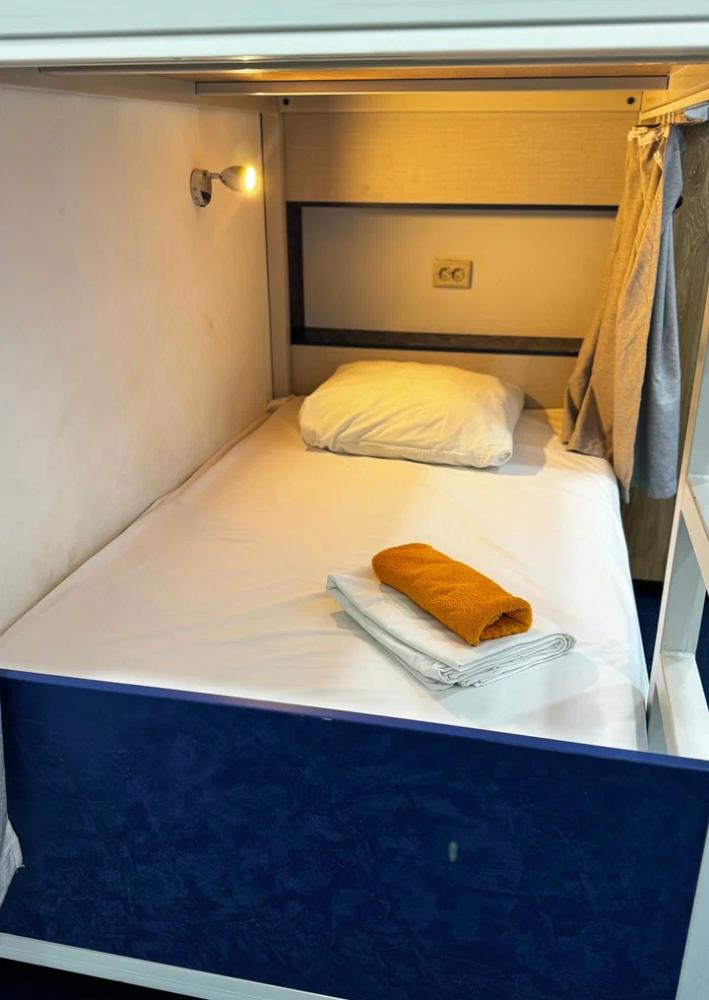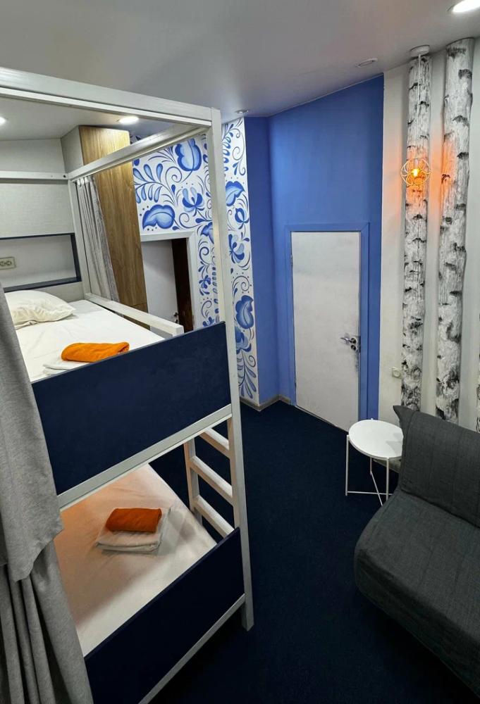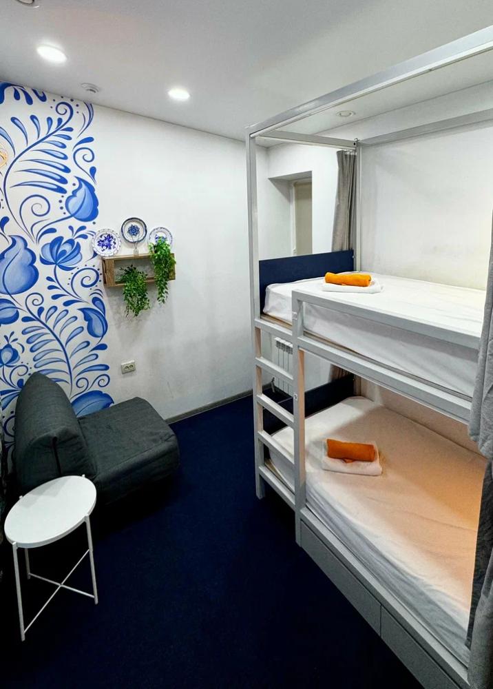 Койко-место в трехместном, светлом и просторном общем номере с двухъярусной кроватью и раскладным креслом. Для каждого спального места предусмотрена розетка, полочка для личных вещей, настенная лампа, штора, полотенце, постельное белье. В самом номере расположен туалет и умывальник.