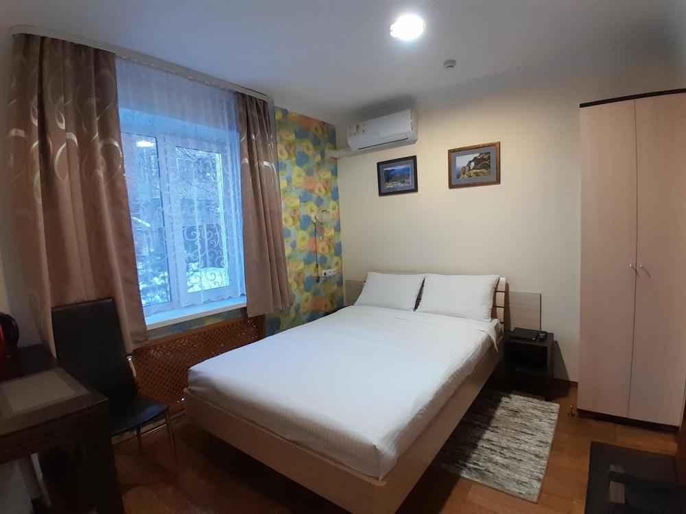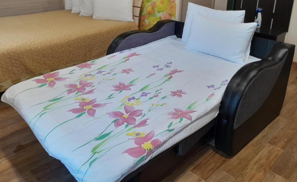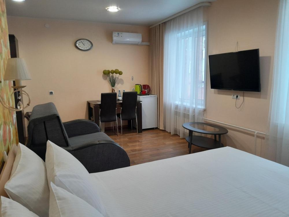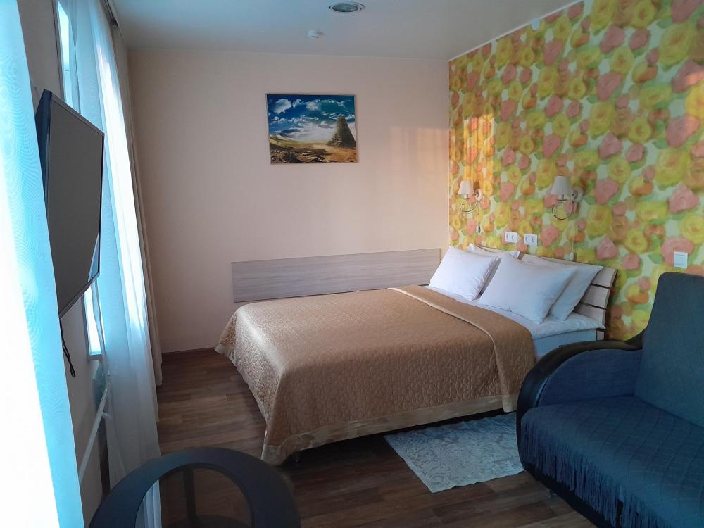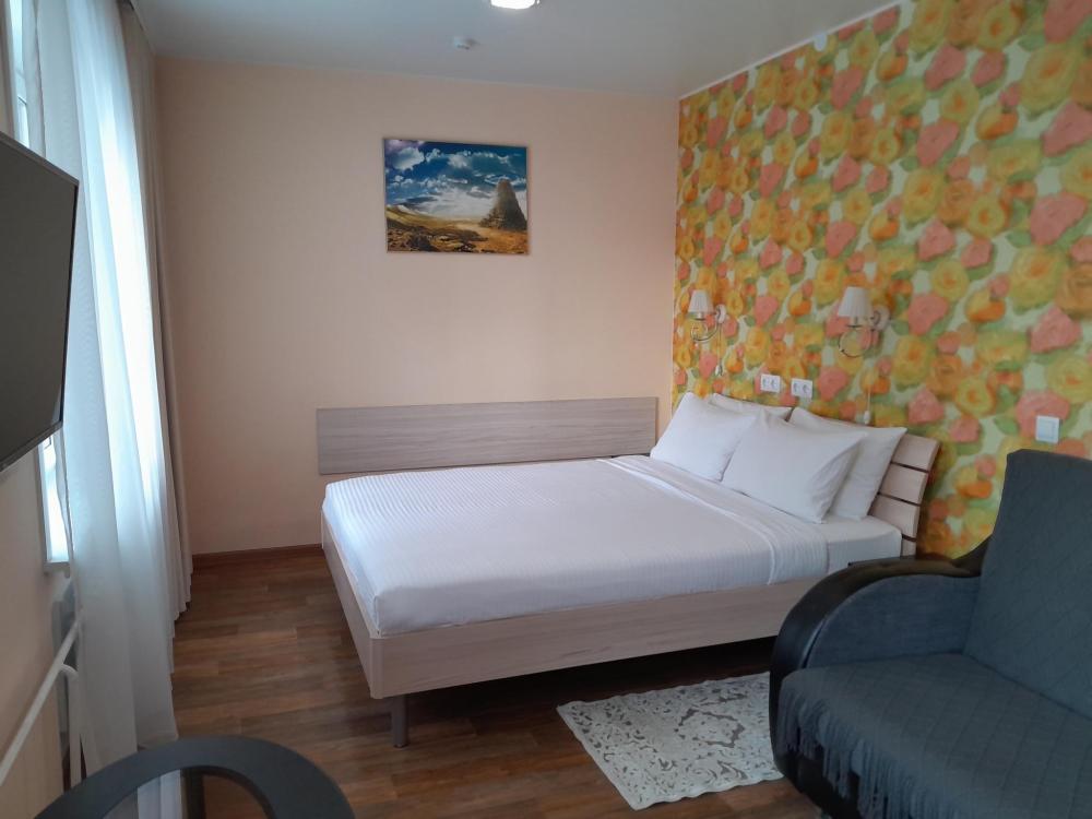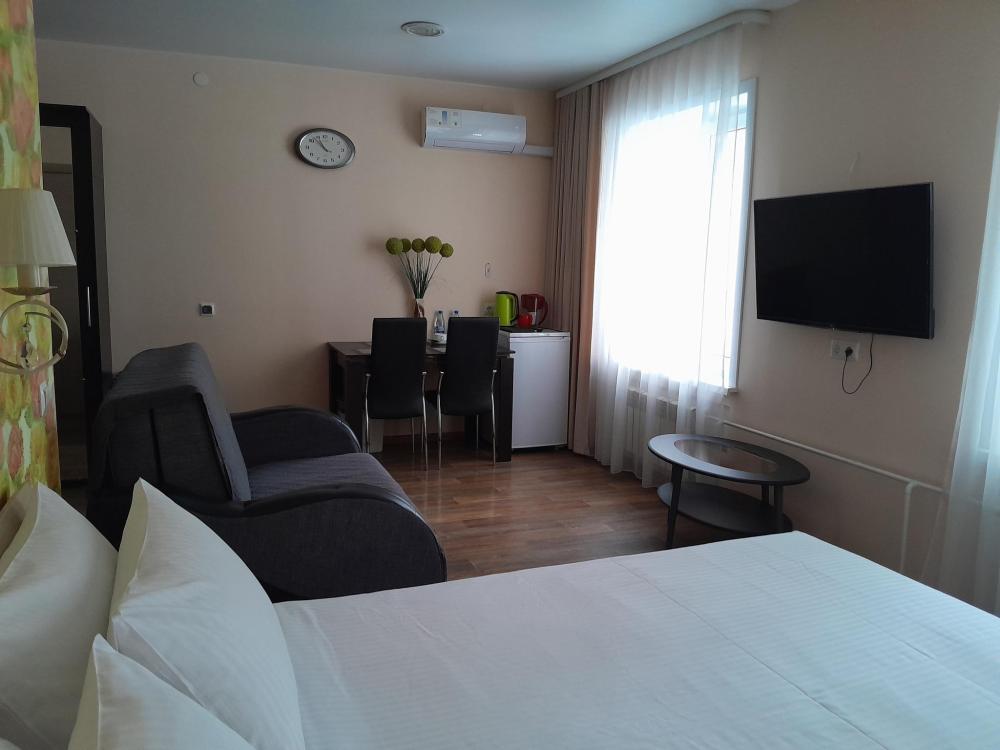 Номер 1-й категории – тёплый и уютный 22 кв.м. Однокомнатный номер с удобной кроватью размером 160*200, ортопедический матрас, кресло кровать 120*200 (возможно использование как дополнительное спальное место), ванная комната с душем, фен, рабочее место(стол), звуконепроницаемые окна, бесплатный скоростной Wi-Fi, телевизор с плоским экраном, кондиционер, чайник, холодильник, платяной шкаф/вешалка с багажной полкой, набор банных принадлежностей. В стоимость проживания включено. Проводится ежедневная уборка номера со сменой полотенец.