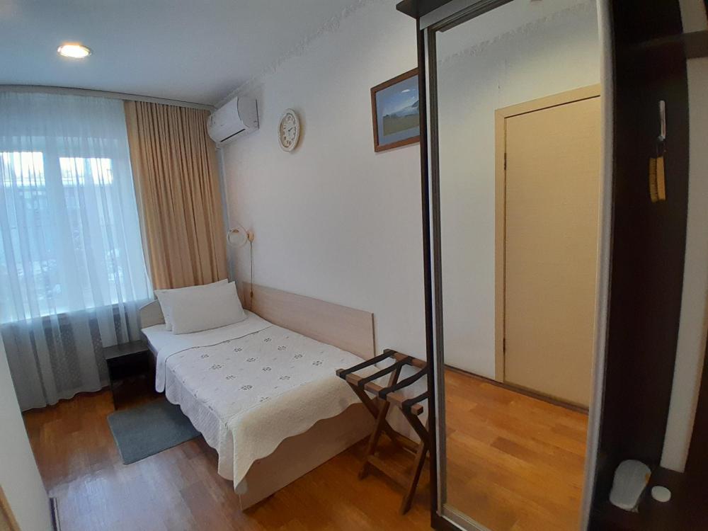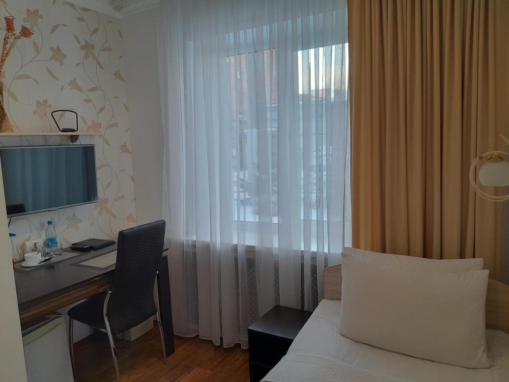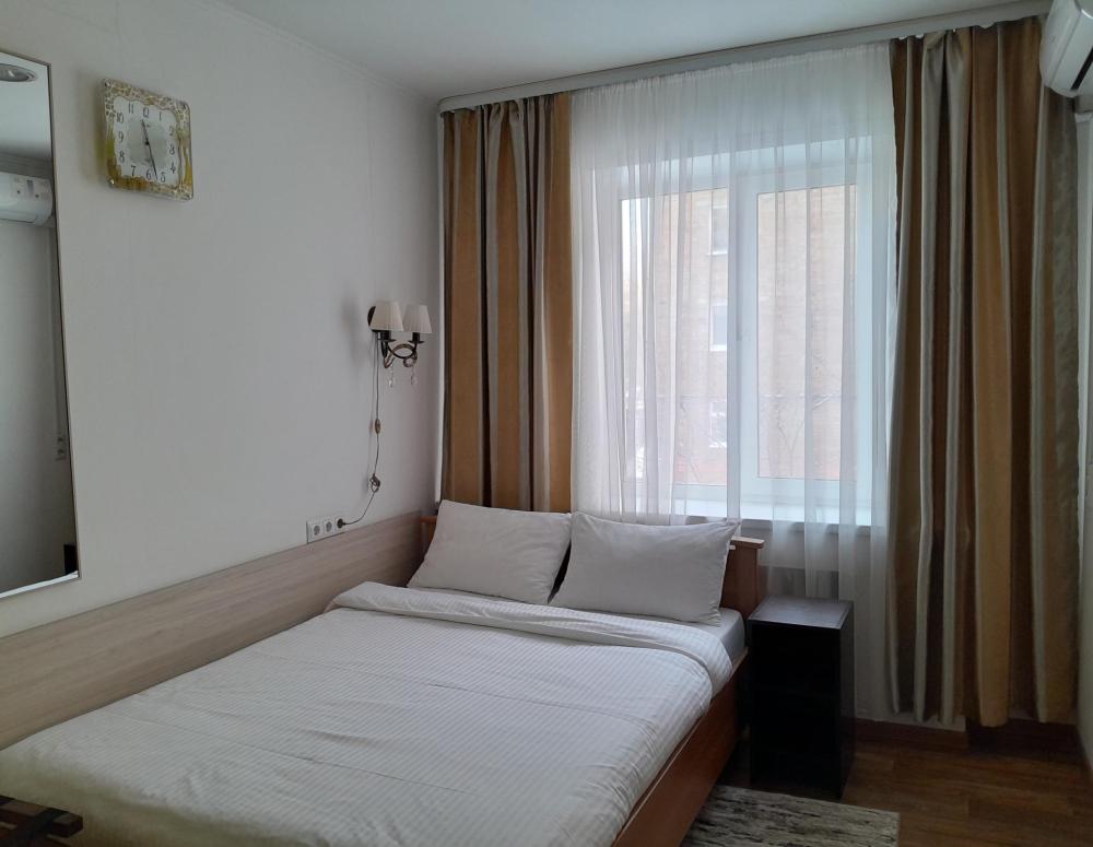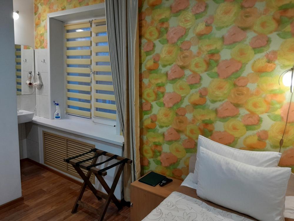 Номер 1-й категории – "Стандартный одноместный с полутораспальной кроватью" тёплый и уютный. Однокомнатный номер с удобной кроватью размером 130*200, прикроватная тумба, ванная комната с душем, фен, рабочее место(стол), звуконепроницаемые окна, бесплатный скоростной Wi-Fi, телевизор с плоским экраном, кондиционер, чайник, холодильник, платяной шкаф/вешалка с багажной полкой, набор банных принадлежностей. В стоимость проживания включено.