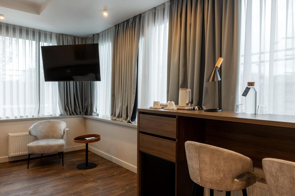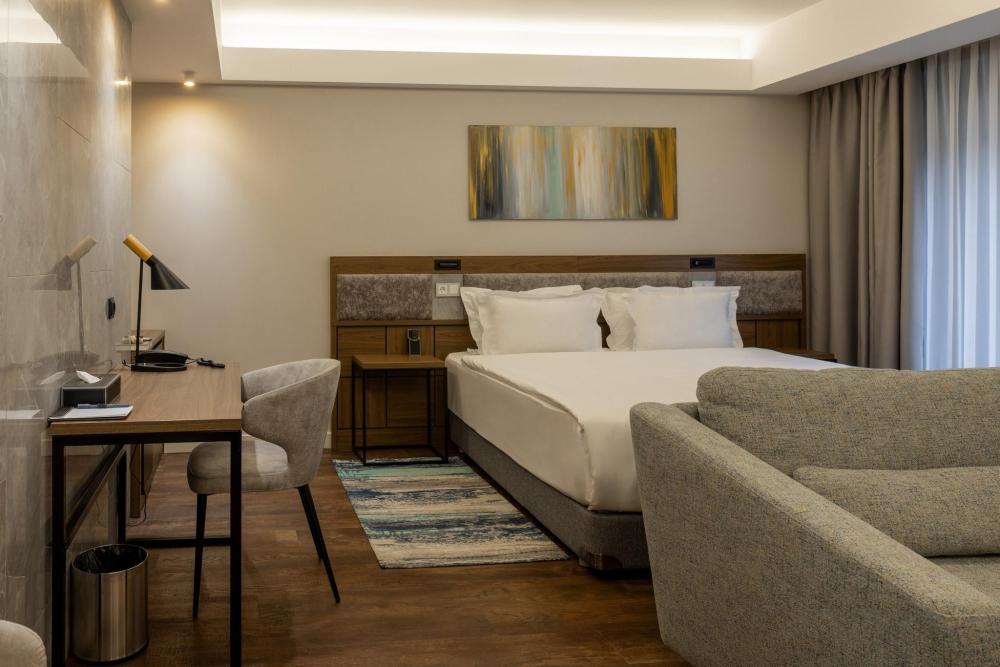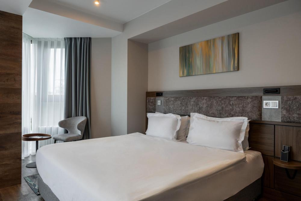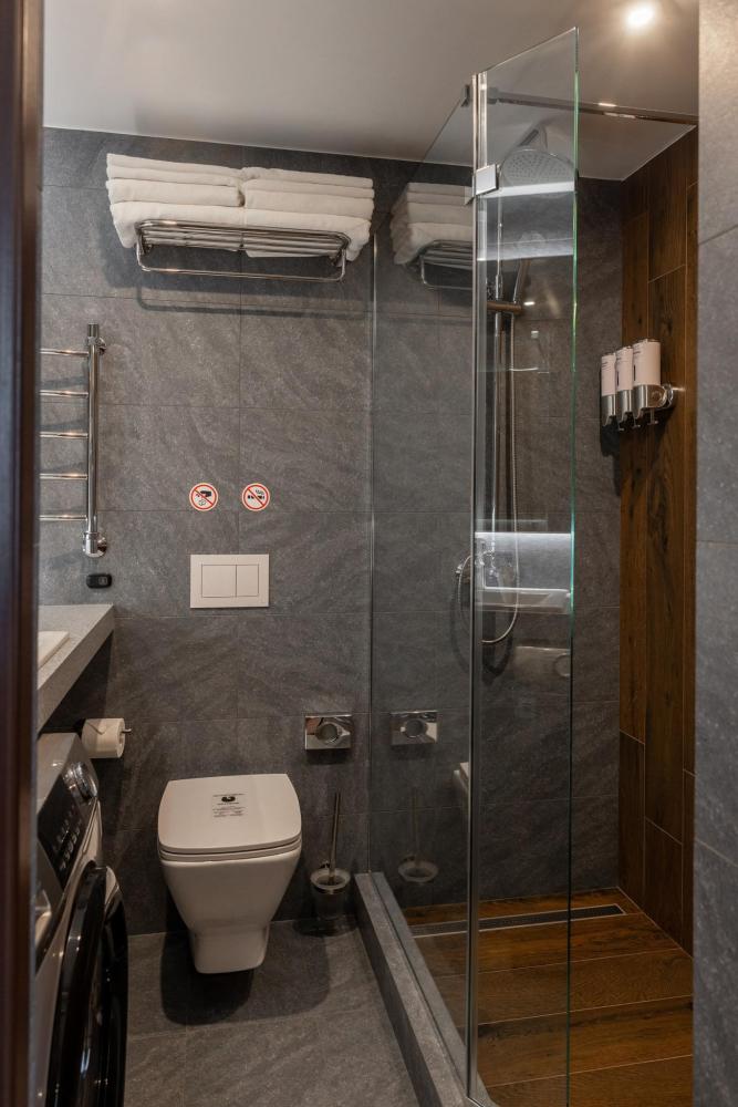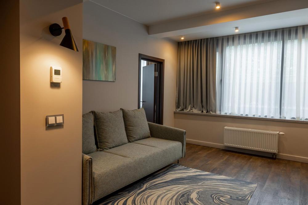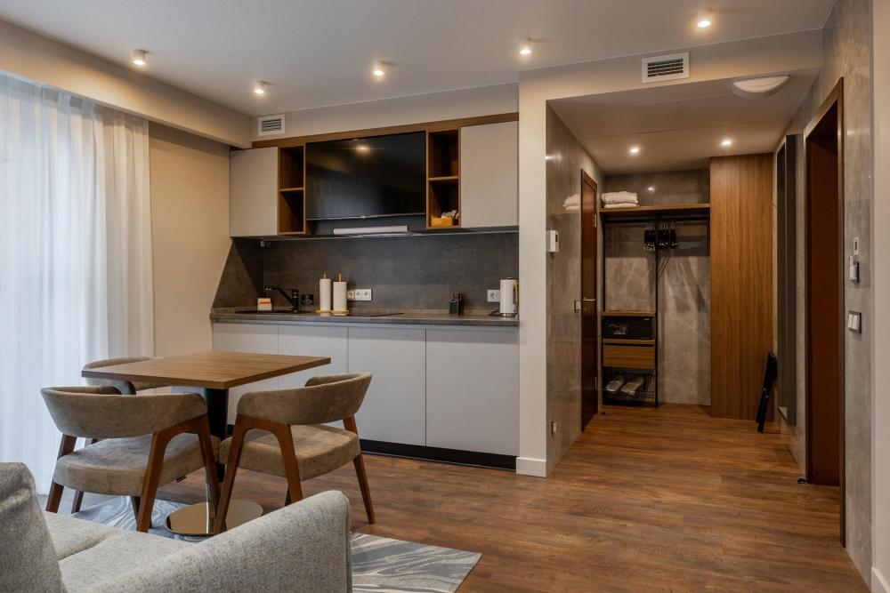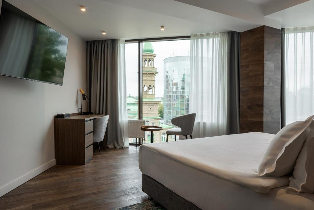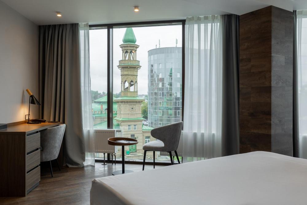 Номер высшей категории - Апартаменты площадью 40 кв.м. с панорамными окнами, кухней-гостиной и видом на историческую часть города. Стиль и эргономичность бизнес-класса вместе с особенным уютом домашней обстановки оценят как деловые путешественники, так и большие семьи. Вместимость до 4-х человек.