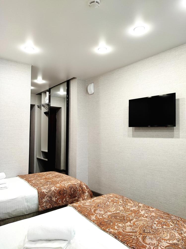 Удобный двухместный номер с двумя раздельными односпальными кроватями или с одной двуспаспальной кроватью, с видом из окна на исторический центр города или во двор.