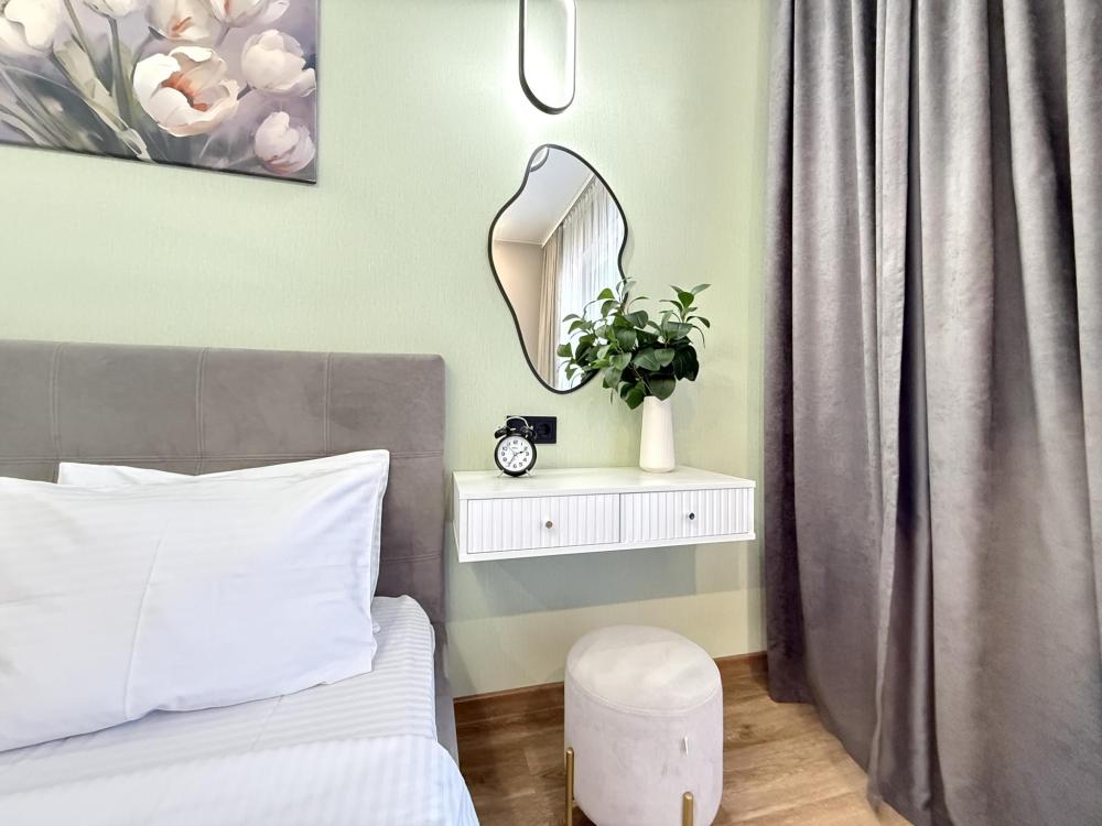 Уютная, чистая 1-комнатная квартира на 5 этаже с шикарным видом с окна у ТЦ Смайл Молл Приветствуем! Наша квартира — это место, где вы сможете насладиться чистотой, комфортом и уютом! Квартира подходит для размещения максимум 2 гостей - Широкая двуспальная кровать...