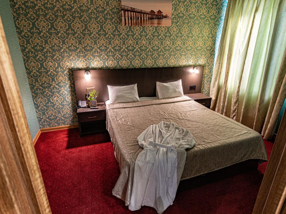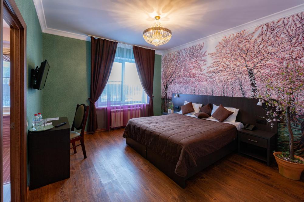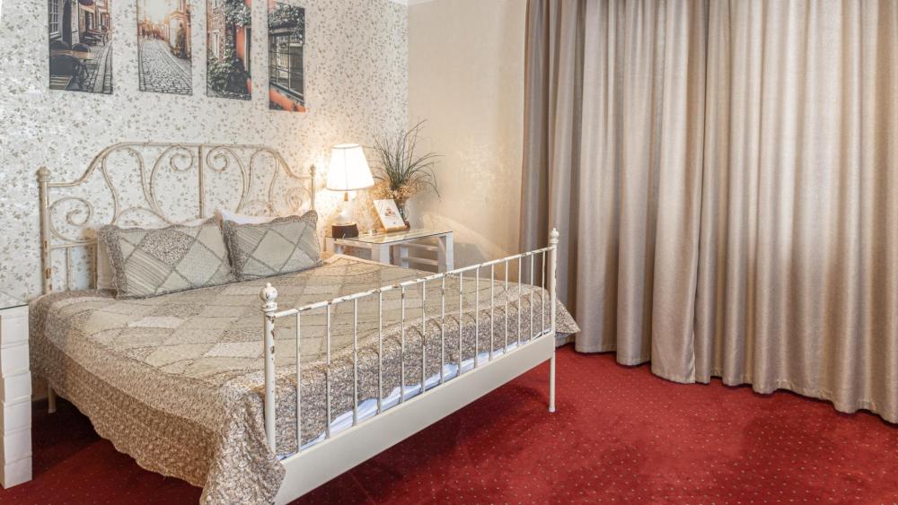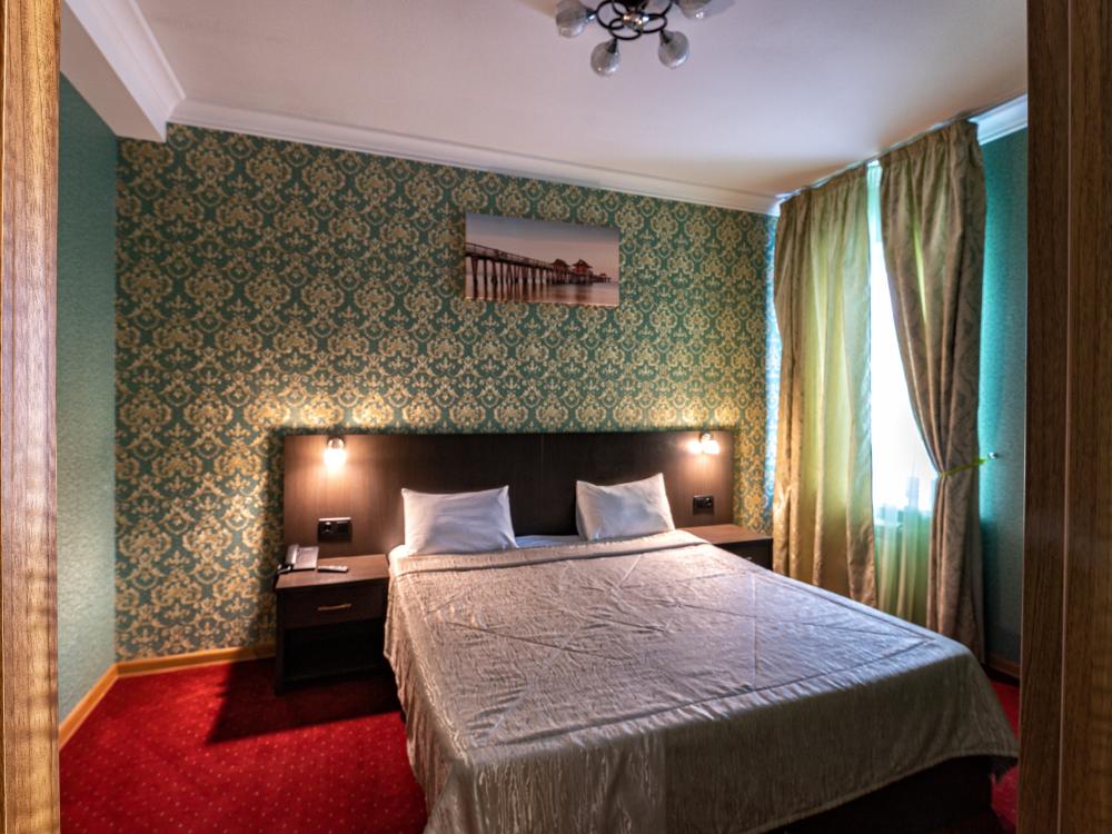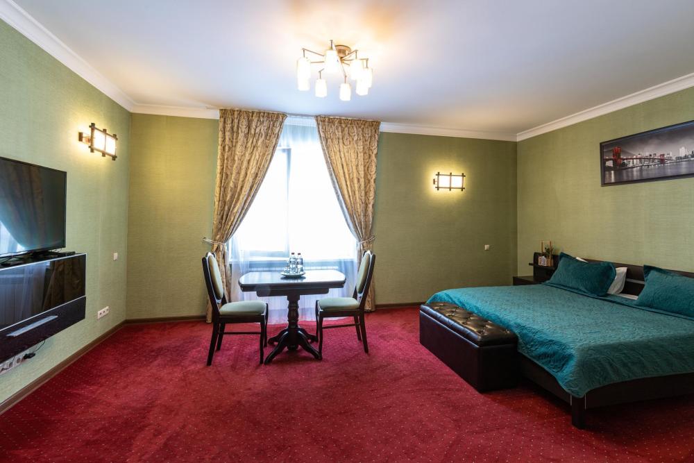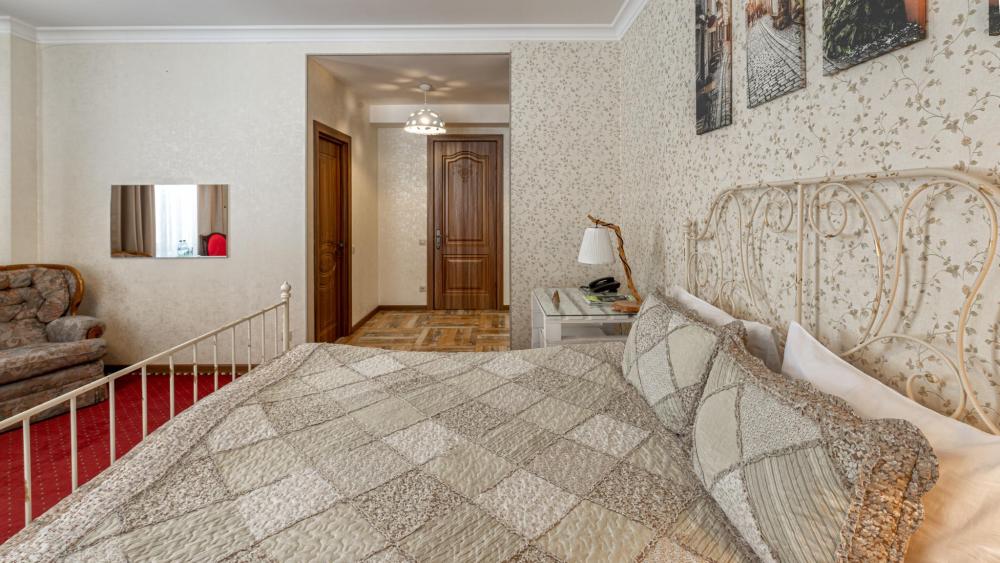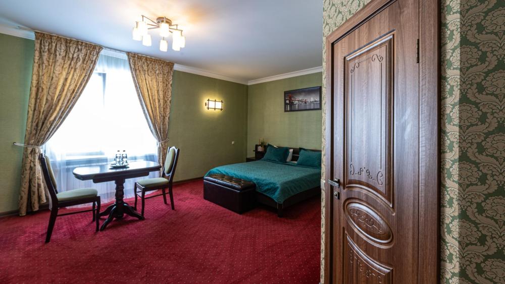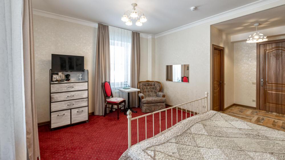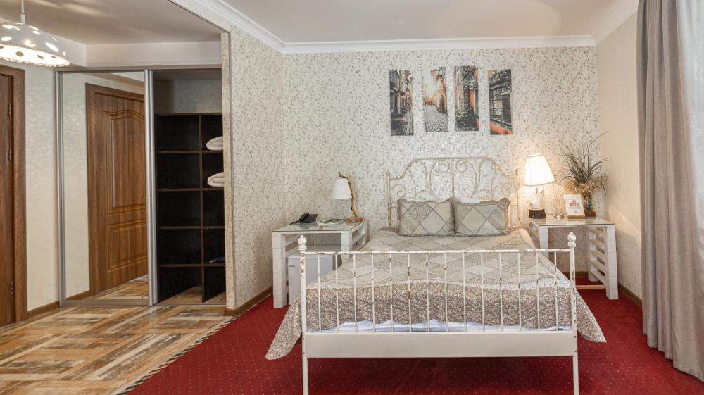 Номер люкс с двухспальной кроватью общей площадью 45 кв.м. для размещения до 2-х гостей. Оснащение номера: двухспальная кровать, прикроватные тумбочки, телевизор, шкаф, ванная комната с душем, санузел, косметические средства, набор полотенец.