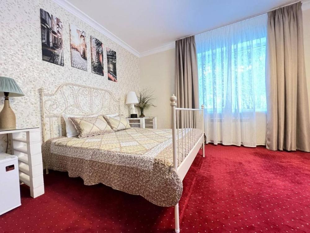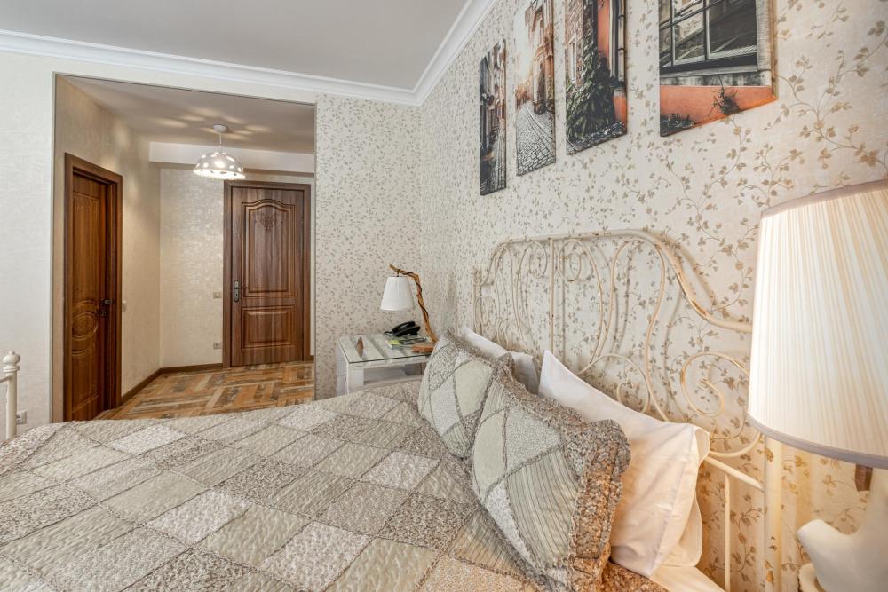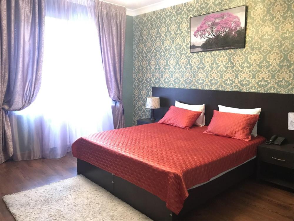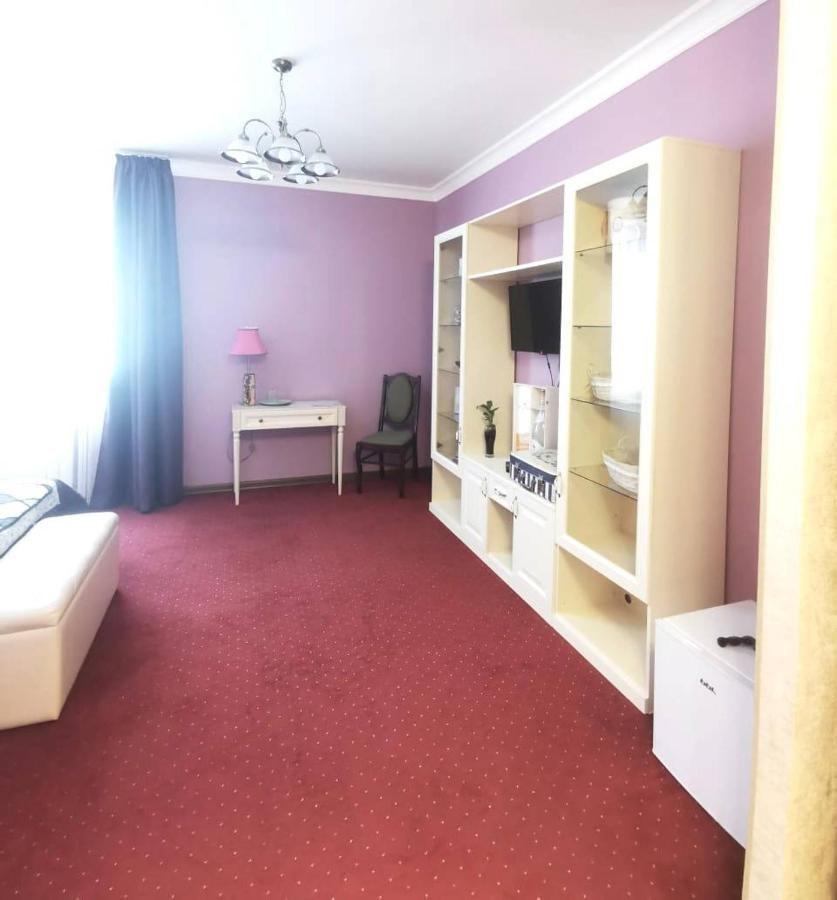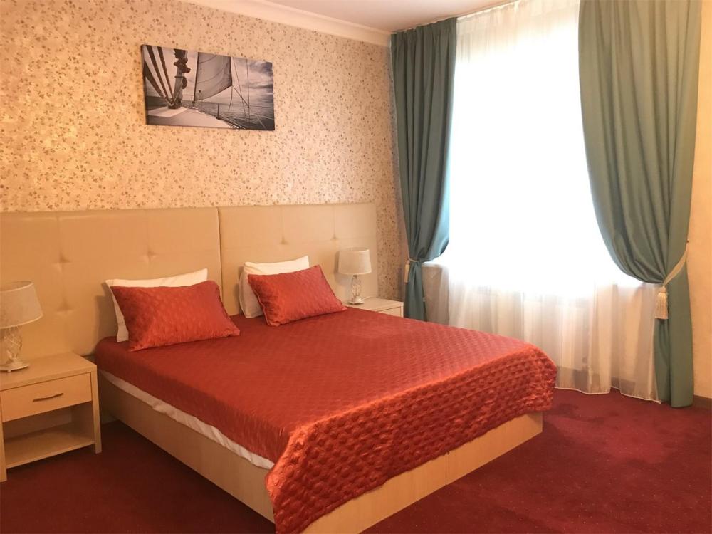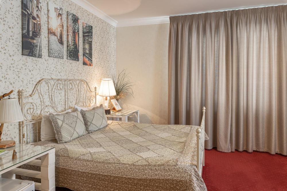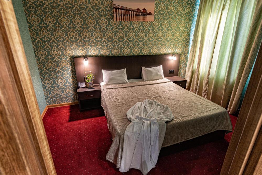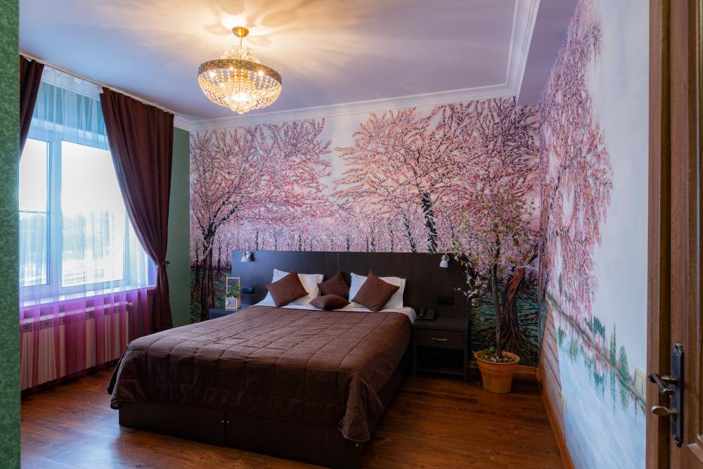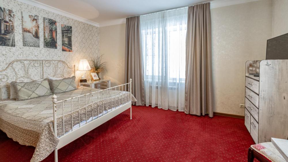 Номер люкс с двухспальной кроватью общей площадью 45 кв.м. для размещения до 2-х гостей. Оснащение номера: двухспальная кровать, прикроватные тумбочки, телевизор, шкаф, ванная комната с душем, санузел, косметические средства, набор полотенец.