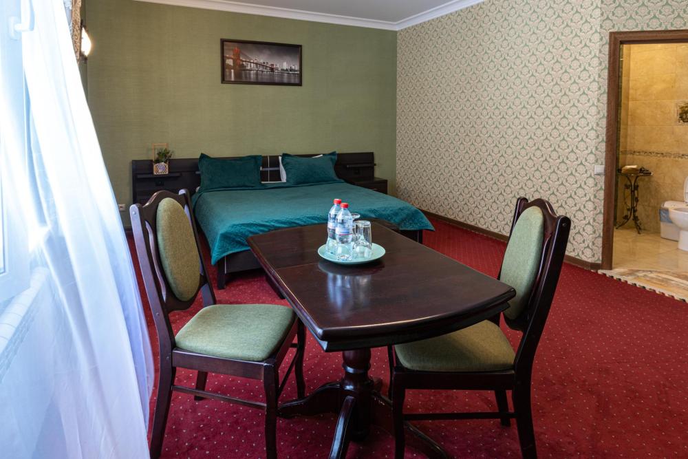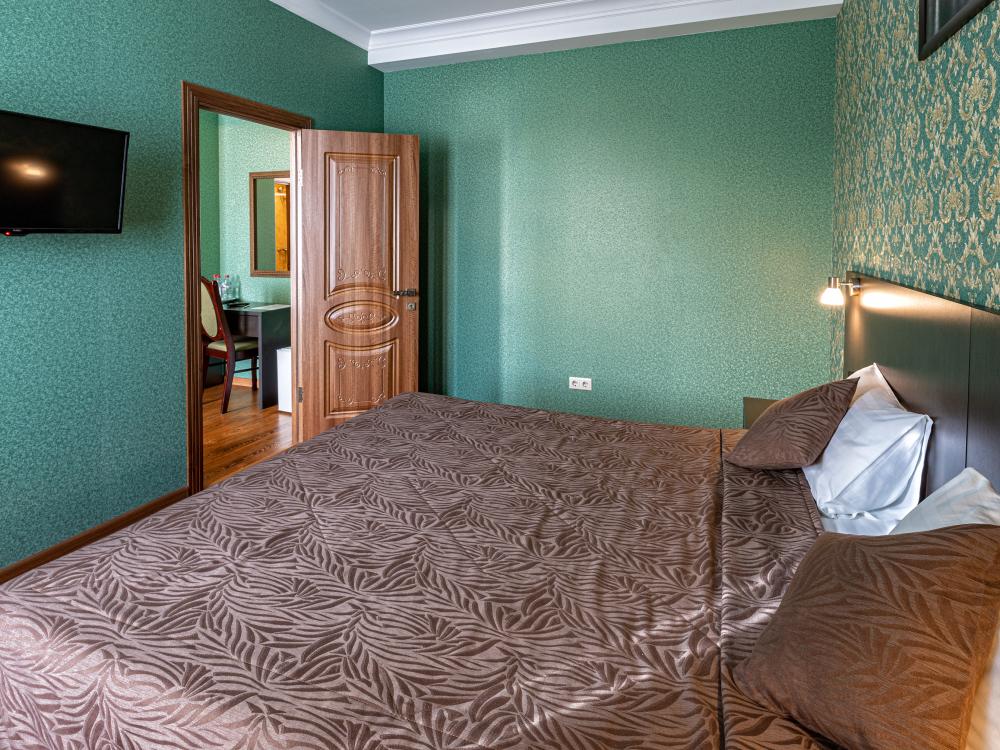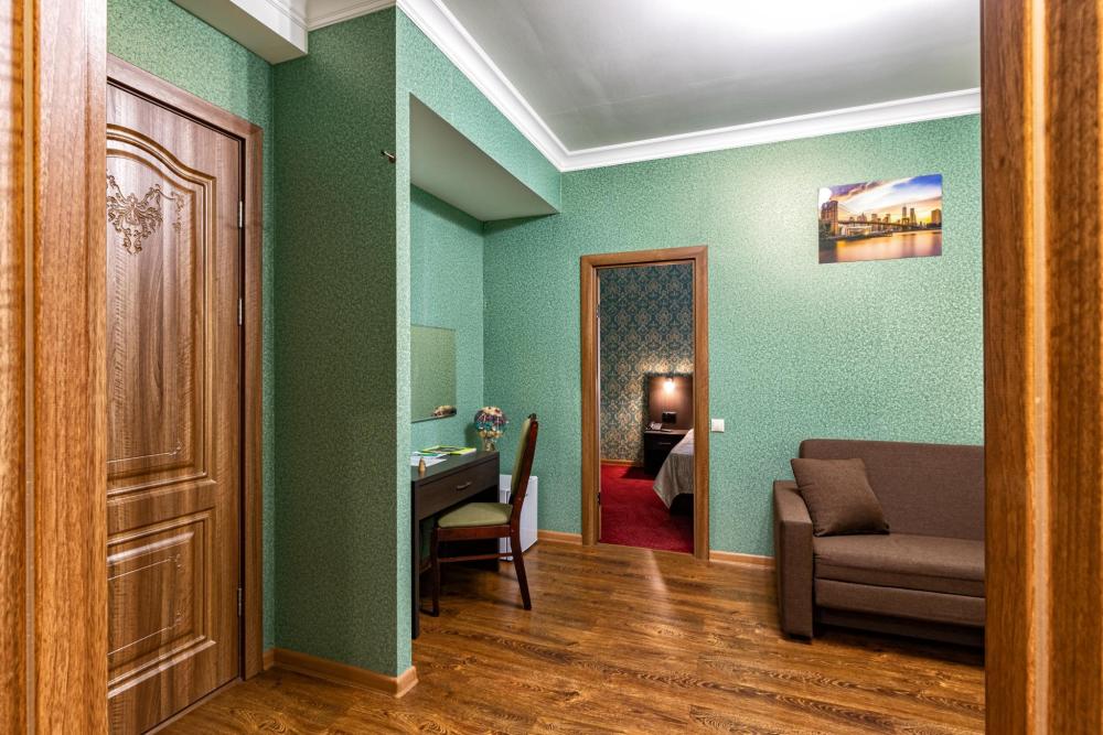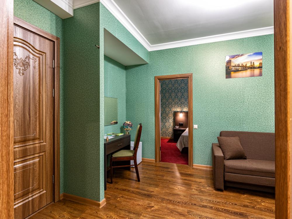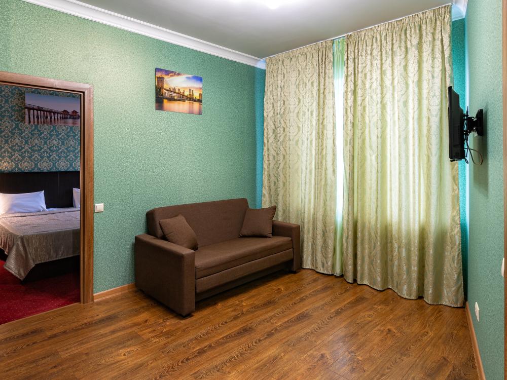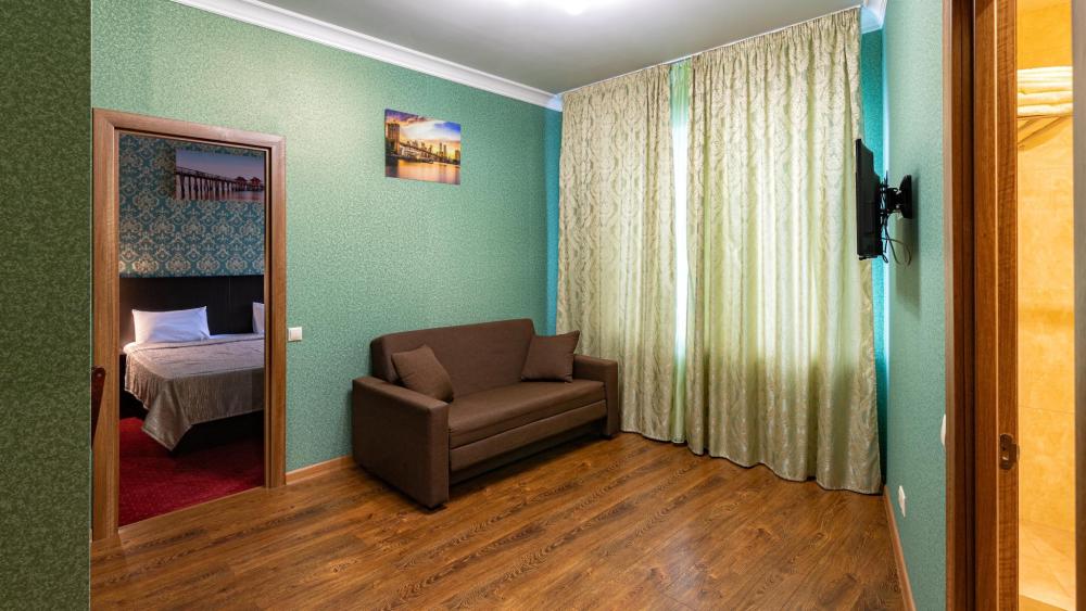 Двухкомнатный номер полулюкс общей площадью 38 кв.м. для размещения до 4-х гостей. Оснащение номера: двухспальная кровать, раскладной диван, прикроватные тумбочки, телевизор, мини-холодильник, шкаф, ванная комната с душем, санузел, косметические средства, набор полотенец.