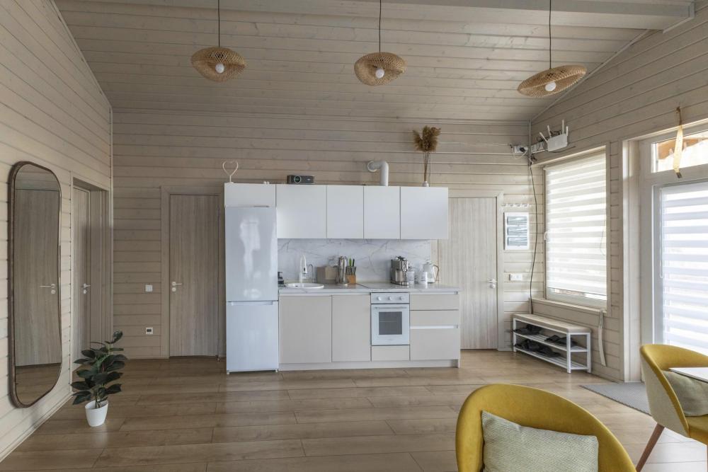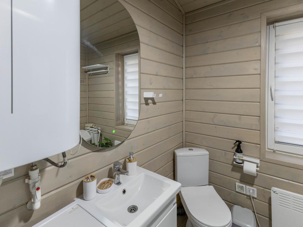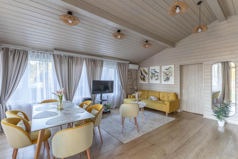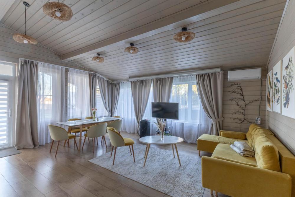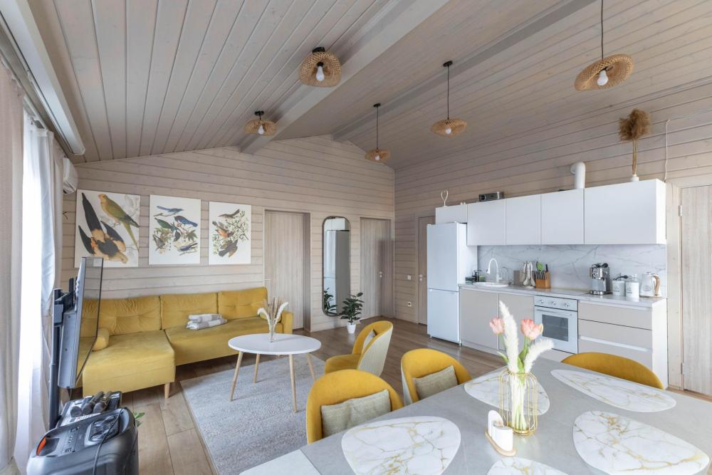 Дизайнерский домик общей площадью 88 кв.м. c огороженной территорией для размещения до 8-ми гостей. Для комфортного проживания гостей дом оснащен всем необходимым: большая гостиная, 3 спальные комнаты, кухня-гостиная с обеденной зоной и удобным диваном, вся посуда для приготовления и приема пищи (ножи, столовые приборы на 8 человек, кастрюли, сковородки, тарелки, бокалы), караоке и домашний кинотеатр для веселой компании, детская кроватка - манеж, кофе-машина, холодильник, микроволновая печь, обогреватель, чайник, плита, духовка, стиральная машина, кондиционер, теплые полы, WI-FI, ванная комната, стиральная машина. Для гостей есть просторная терраса, на территории мангальная зона, чтобы приготовить шашлык. Также есть парковка на 3-4 автомобиля.