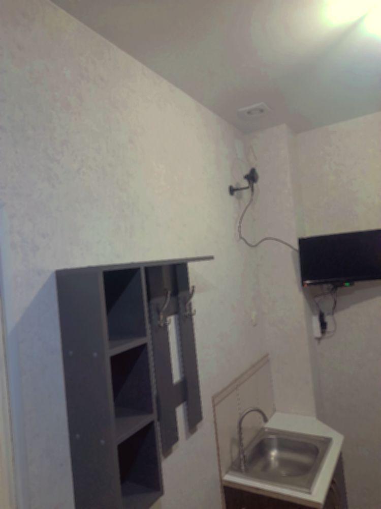 Номер с одной большой кроватью. Номер с душем и туалетом. В номере есть телевизор, шкаф, стол, стулья, чайник.