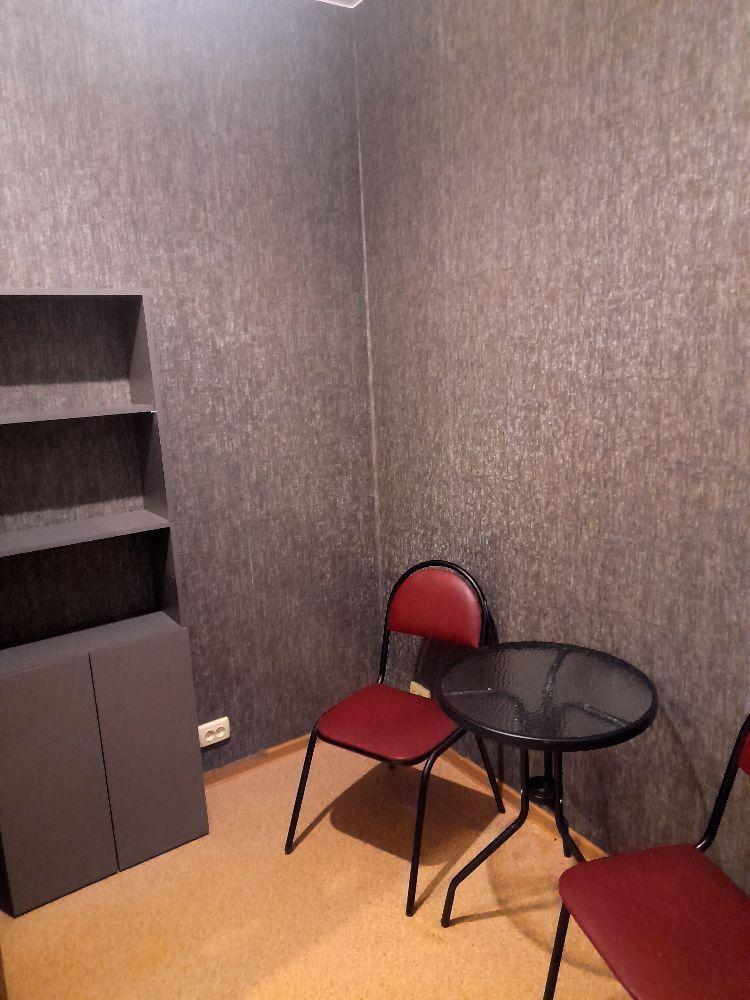 Большой светлый номер для родителей с ребенком. В номере душ, туалет, шкаф, стол, стулья, чайник.
