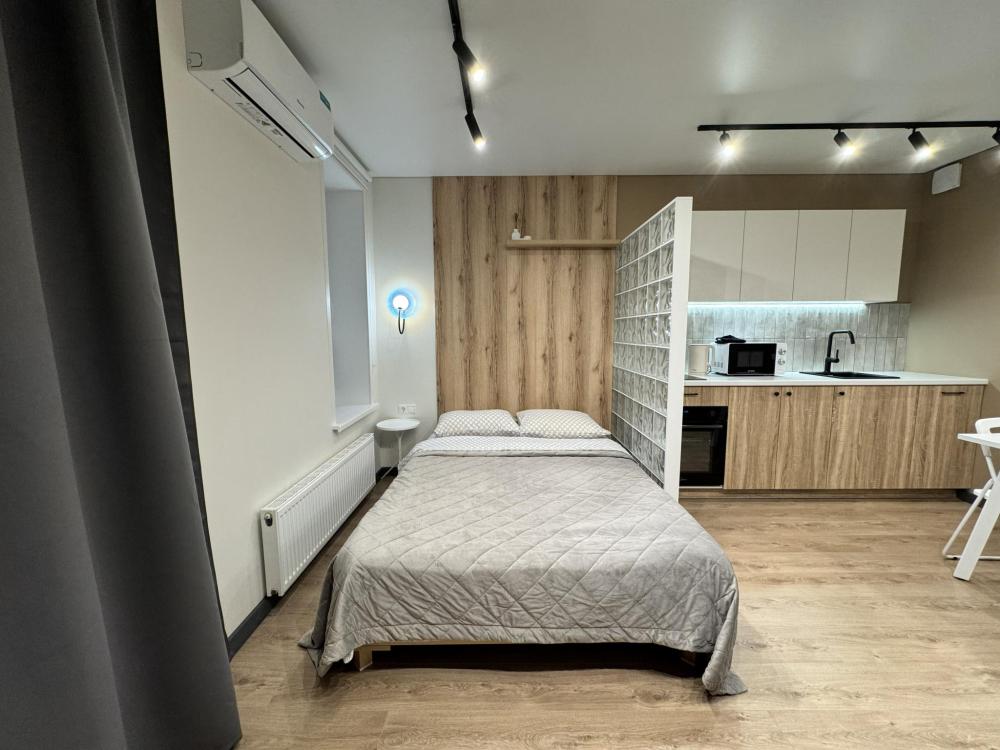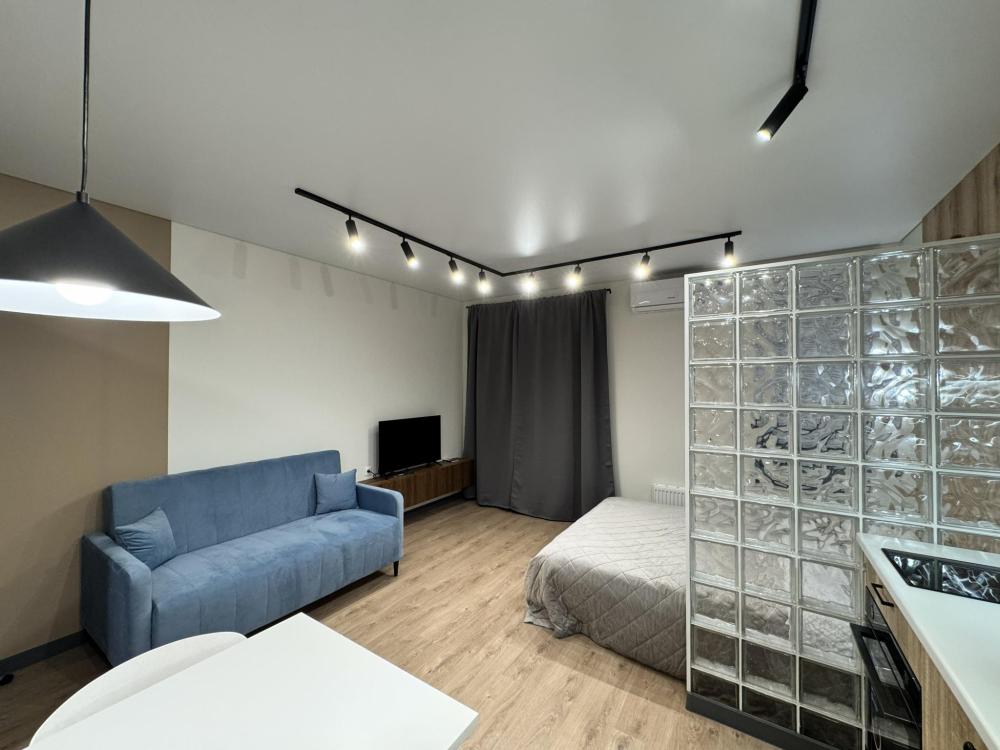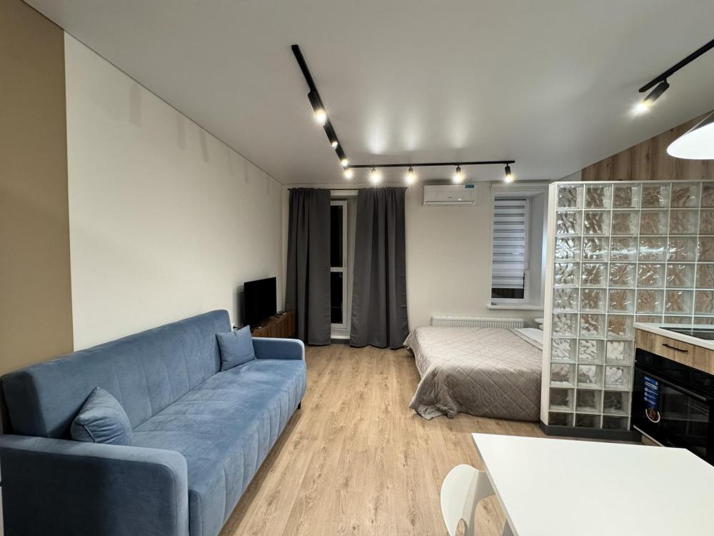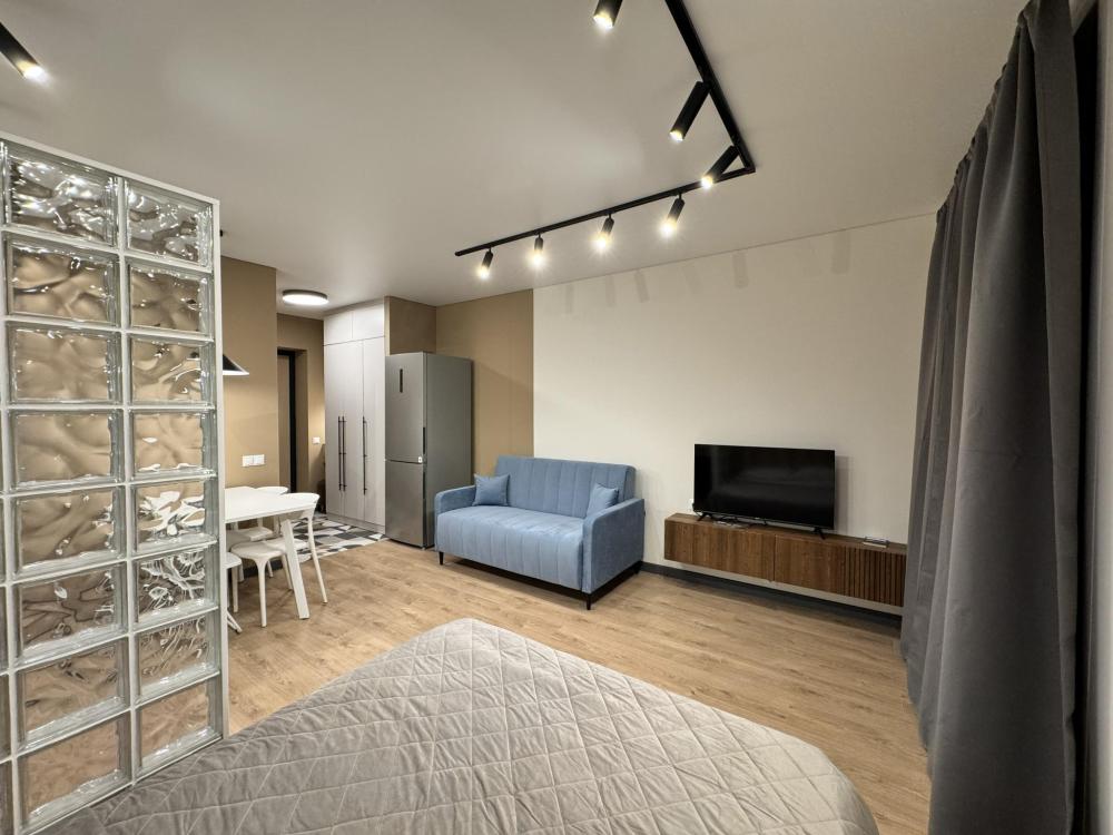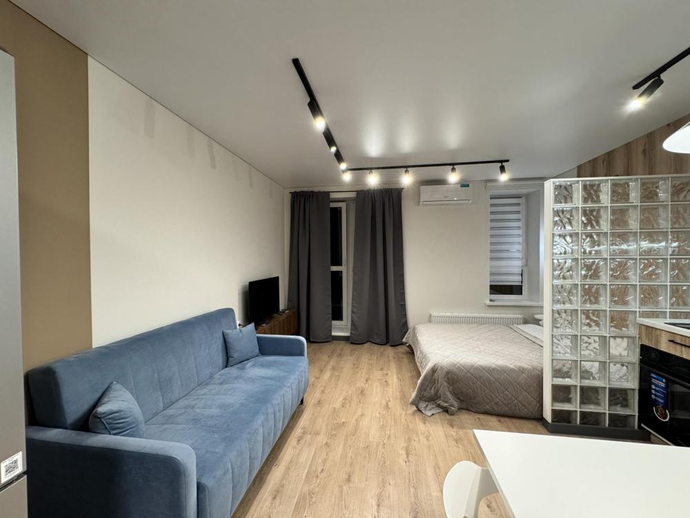 Просторная студия с кроватью на 2 спальных места и раскладным диваном, что идеально подходит для отдыха.