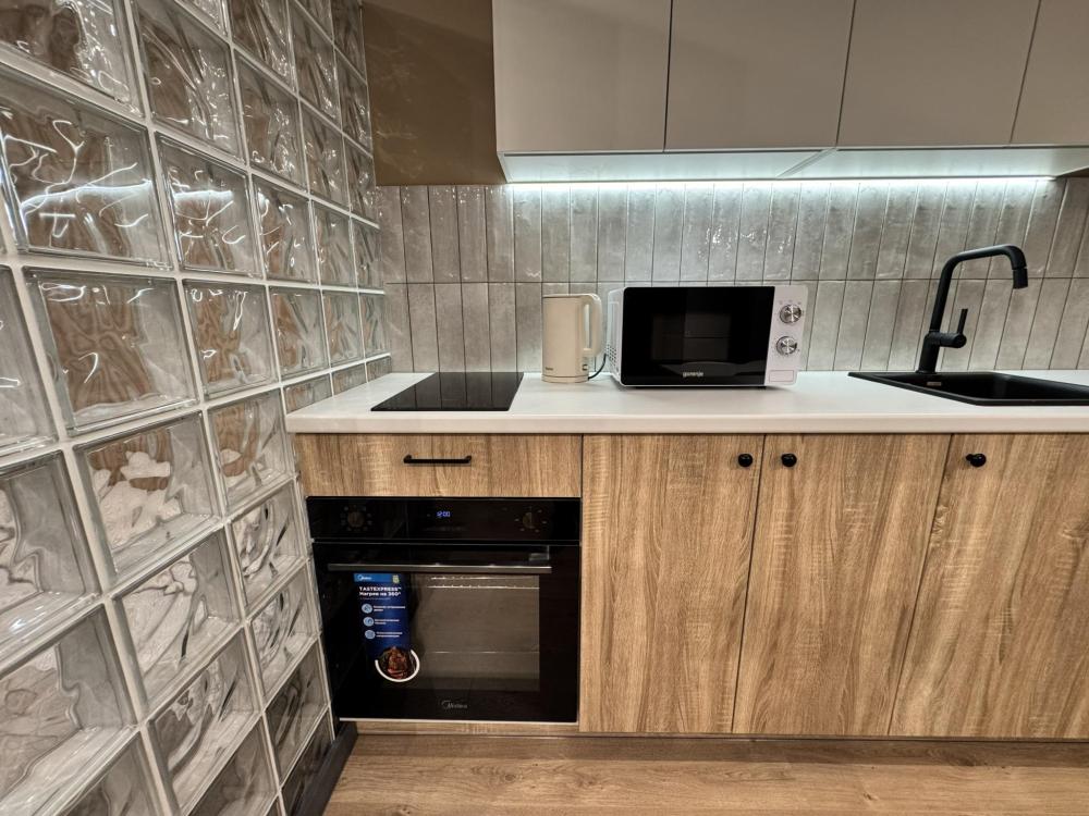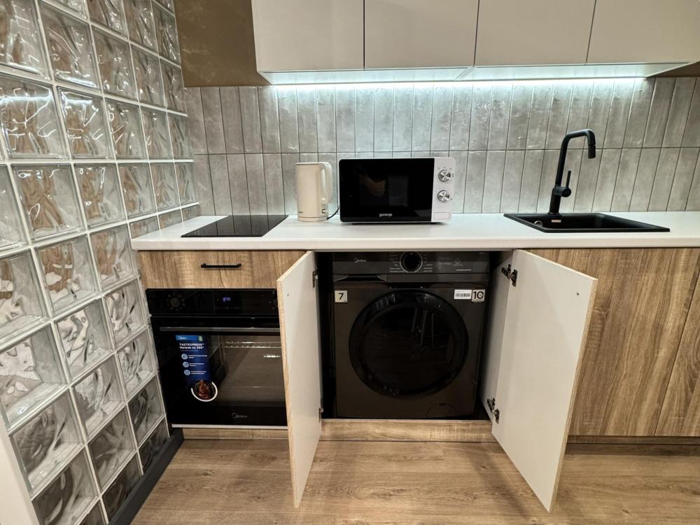 Полностью оборудованная кухня: плита, микроволновка, духовой шкаф, посудомоечная машина и вся необходимая посуда для комфортного приготовления пищи.