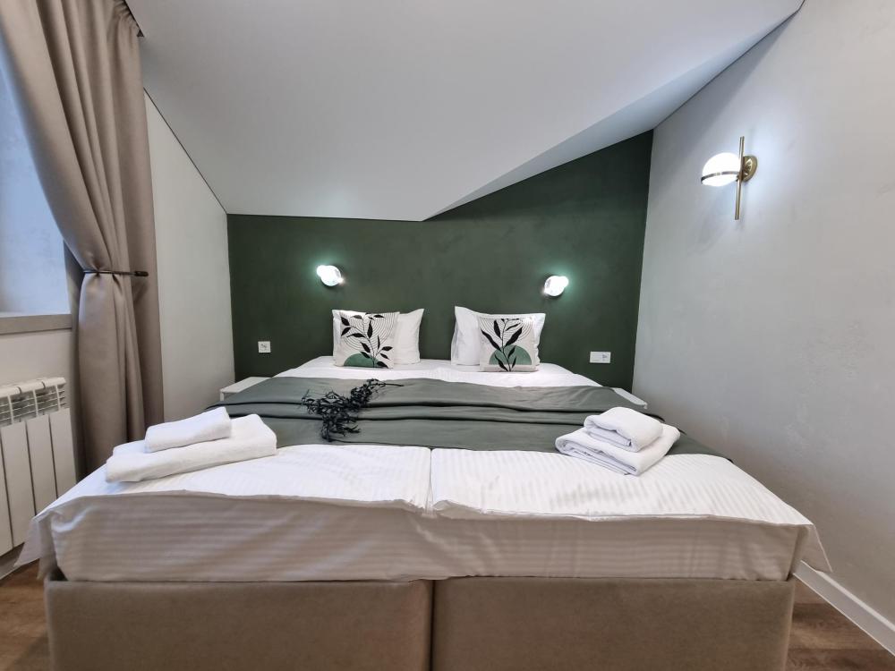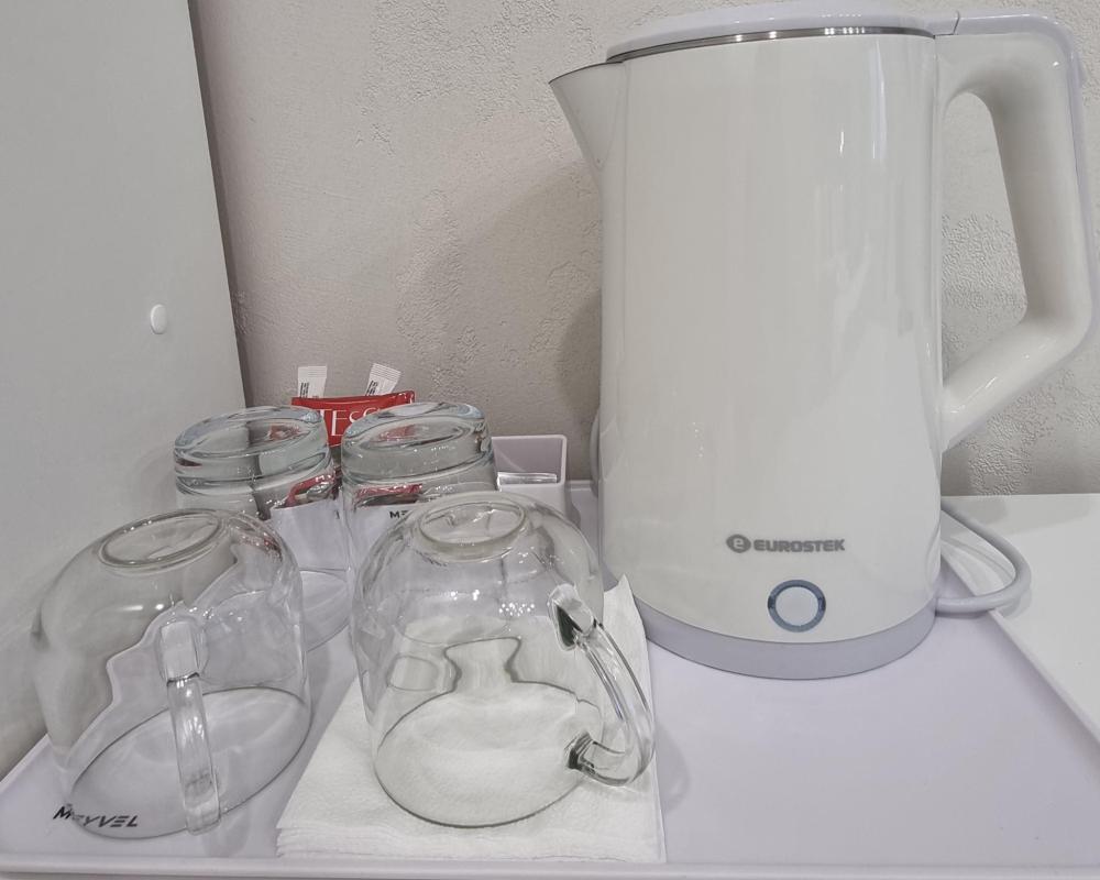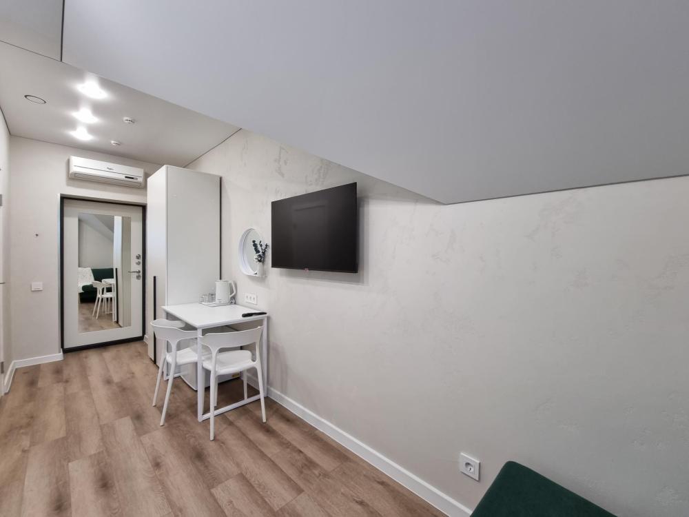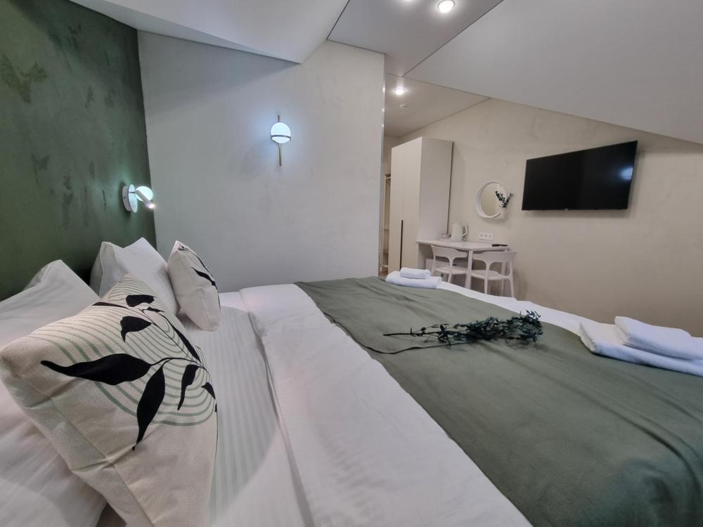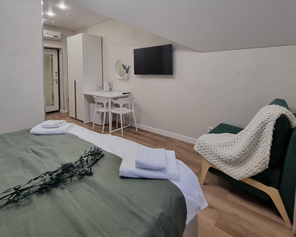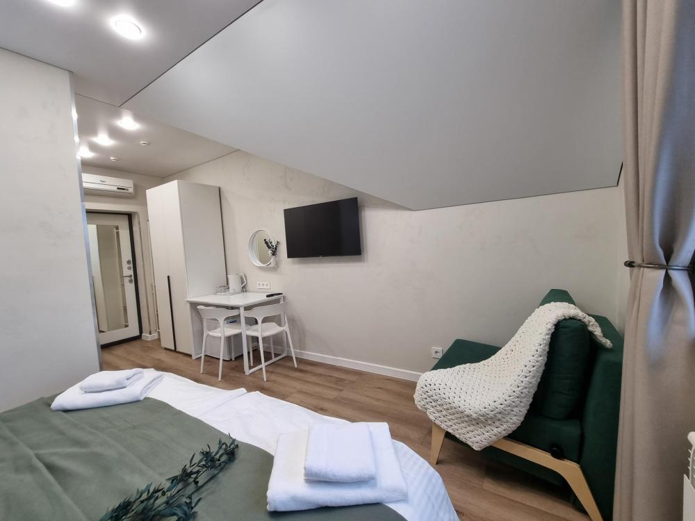 Двухместный супер люкс. Вместимость: 2 человека. + одно спальное место за дополнительную оплату В комнате: двуспальная кровать, шкаф, стол, кресло - кровать, стулья, холодильник, посуда, кондиционер, чайник. Техника: кабельное ТВ, бесплатный Wi-Fi. Ванная комната: раковина, унитаз, душ, средства индивидуальной гигиены, одноразовые тапочки, халаты.