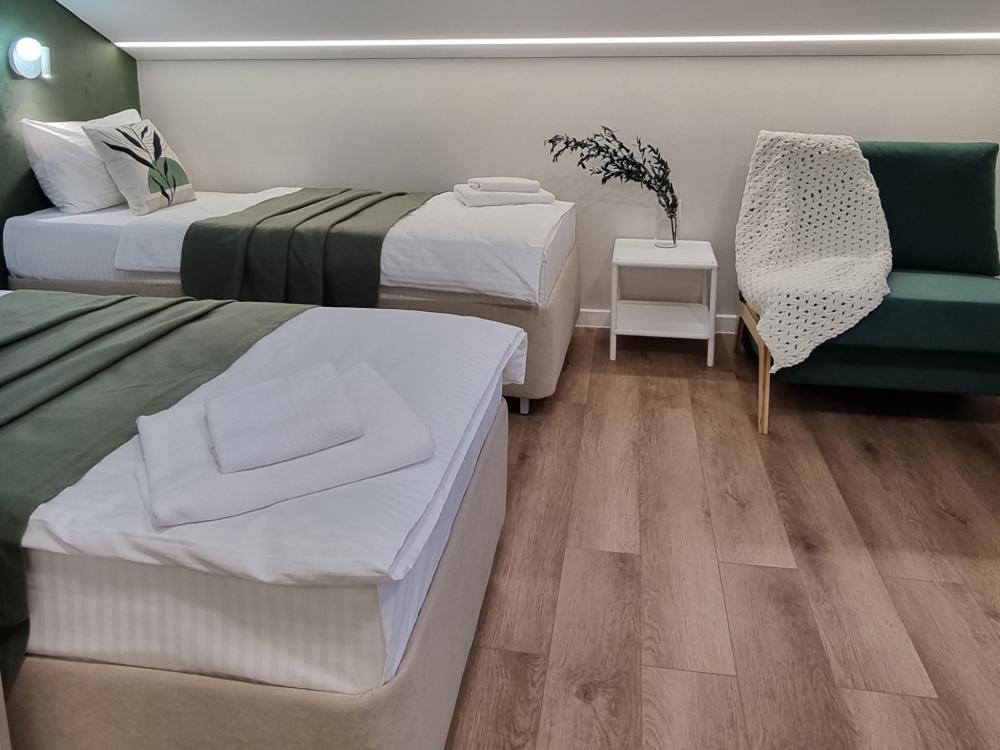 Вместимость: 2 человека. + одно спальное место за дополнительную оплату В комнате: две односпальные кровати, , кресло-кровать, шкаф, стол, стулья, чайник, посуда. Техника: Телевизор, бесплатный Wi-Fi. Ванная комната: раковина, унитаз, душ, средства индивидуальной гигиены, одноразовые тапочки.
