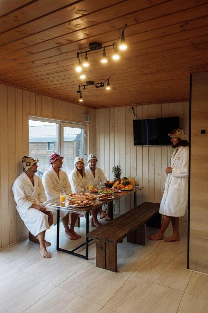 Большой дом с сауной рассчитан на 10 спальных мест (1 этаж: 6 односпальных кроватей + диван-кровать; Мансарда: 2 полутороспальные кровати) Дневное пребывание гостей, включая проживающих до 15 человек без доплат (в будни до 22:00, в выходные до 23:00). Свыше 15 человек доплата за каждого гостя - 1000руб. В аренду дома входит ГОРЯЧАЯ САУНА на 3 часа с прекрасным видом на лес и озеро В большом доме имеется всё для комфортного проживания: Кухня: – микроволновая печь – мини-холодильник с морозилкой – чайник – чай, сахар и кофе 3в1 (по запросу) – тарелки, кружки, стаканы – столовые приборы – обеденный стол, стулья – средства для мытья посуды Гостиная: – панорамные окна с видом на лес, пруд и церковь – телевизор со смарт-TV – wi-fi – диван – кондиционер – обувница и вешалка – настольные игры (по запросу) 2 комнаты на 1 этаже, в каждой из них: – 3 односпальные кровати – 3 прикроватные тумбы – сушилка для белья – кондиционер – гладильная доска и утюг (по запросу) Мансардная комната: – 2 односпальные кровати 2 туалетные комнаты, в каждой из них: – раковина с зеркалом – унитаз – мыло в дозаторе – полотенца банные и для рук – туалетно-косметические принадлежности (по запросу) – фен (по запросу) 2 душевые системы и сауна На территории дома вы можете воспользоваться мангальной зоной. Решетка, шампура, опахало, кочерга находятся у администратора На территории глэмпинга: – банный комплекс с бассейном (за отдельную плату) – батут – футбольная и волейбольная площадки – спортивный уголок – бадминтон (у администратора) – тропа здоровья с живописными видами, а также место силы - огромная могущественная сосна, которой более 245 лет, её можно обнять и загадать самое заветное желание С удовольствием, ждём Вас в нашем уютном глэмпинге!