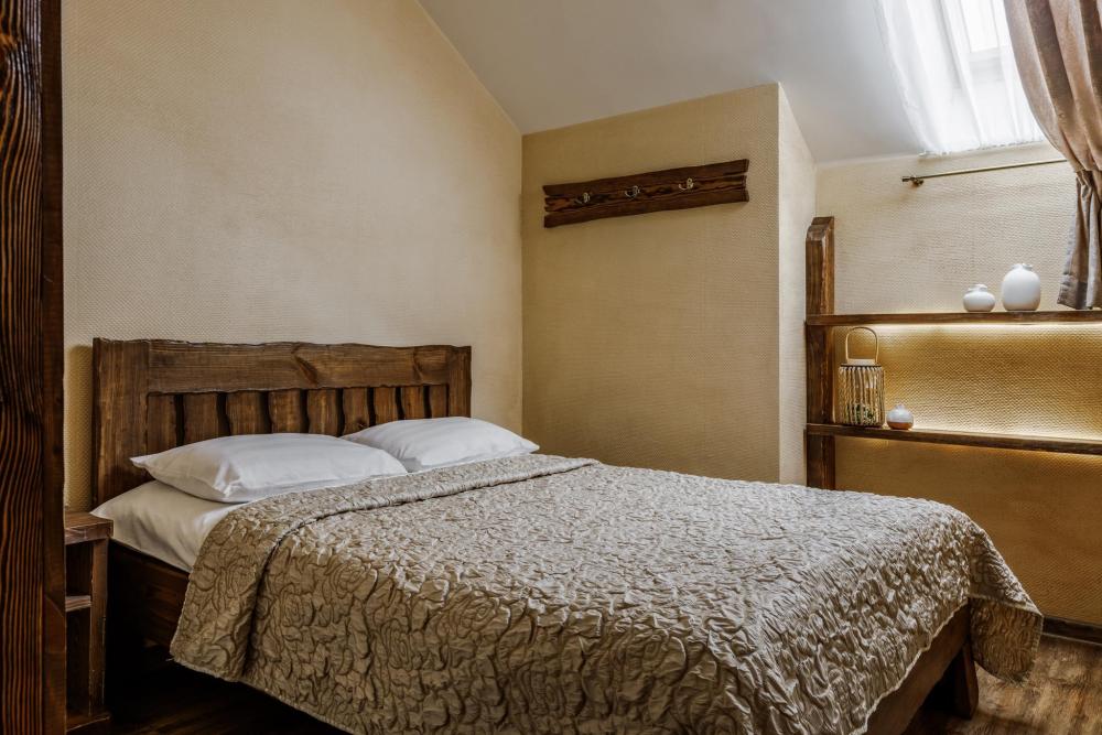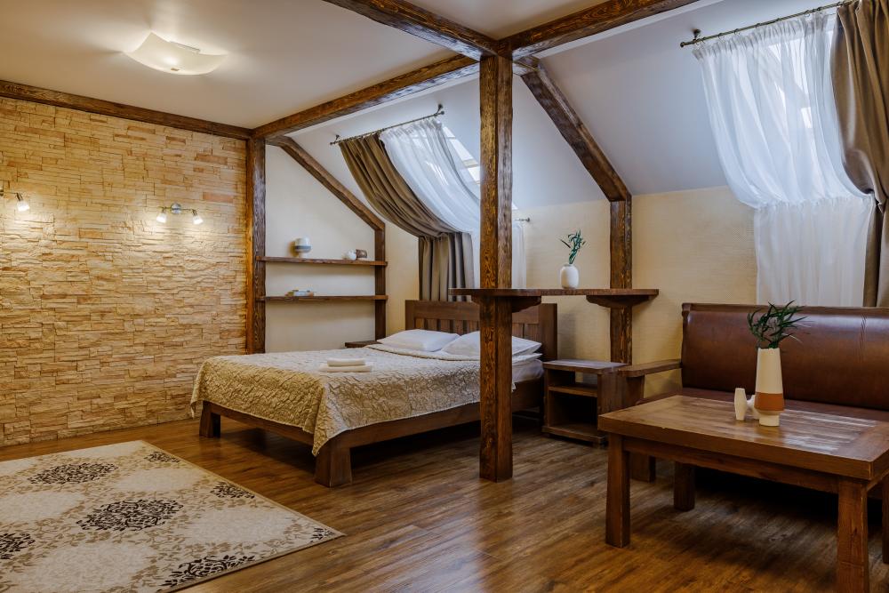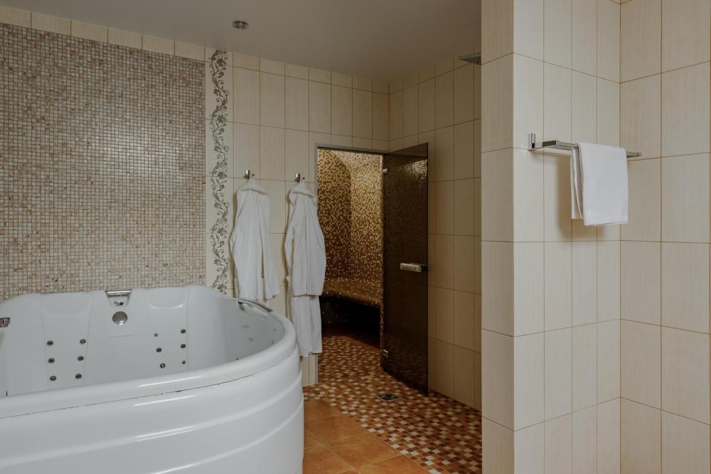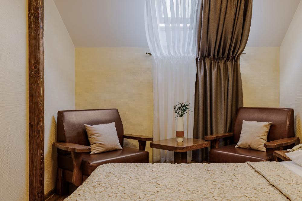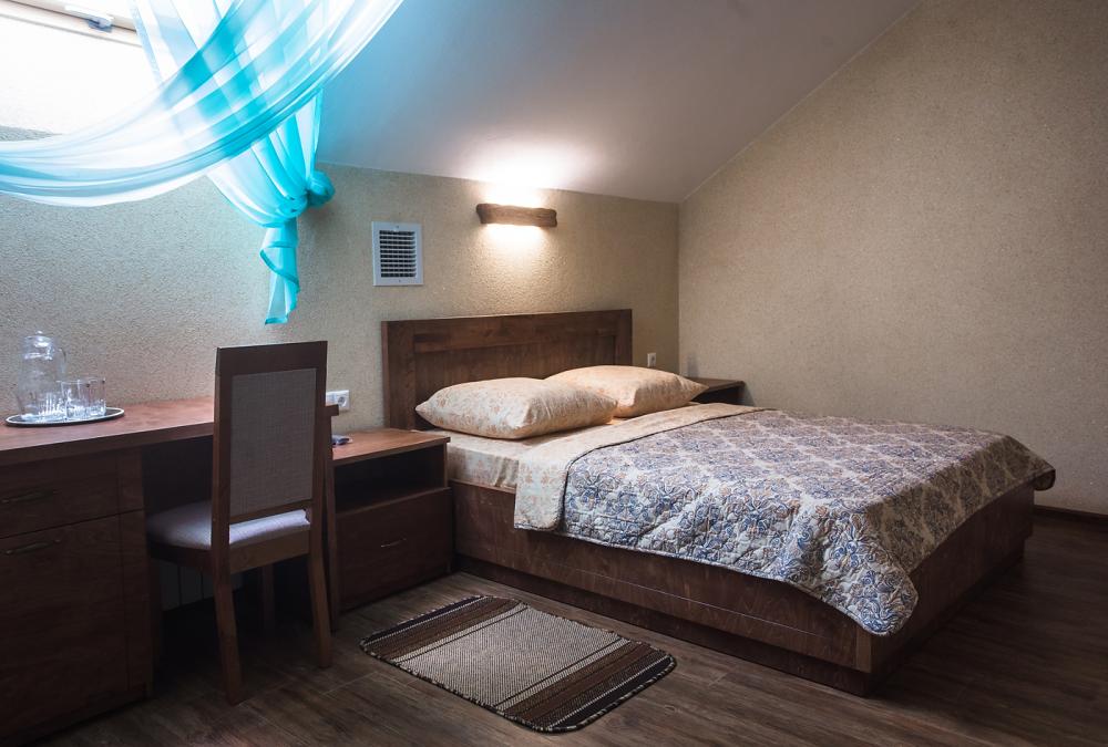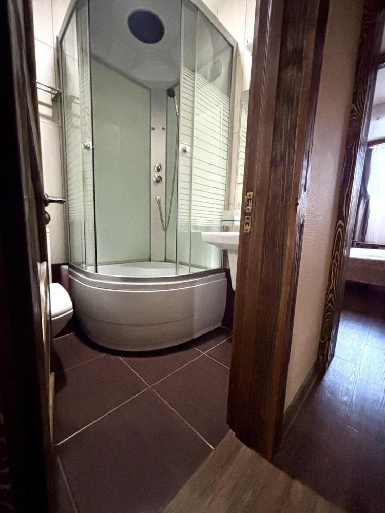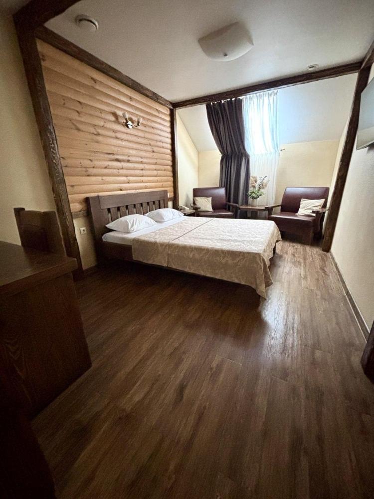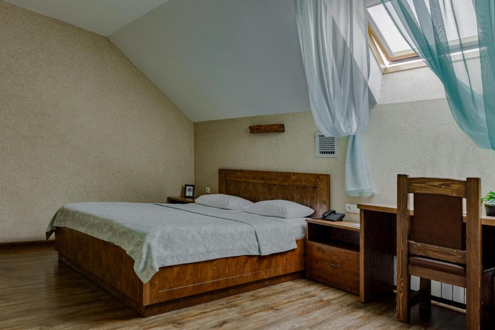 просторный однокомнатный номер 20 м² В номере: чайный столик; письменный стол, стул; большой плазменный телевизор; спутниковое тв; бесплатный WI-Fi; холодильник; кондиционер; теплые полы; двуспальная кровать 2×1.6 м.; ортопедический матрас; прикроватные тумбы. шкаф для одежды Санузел: душевая кабина; унитаз.