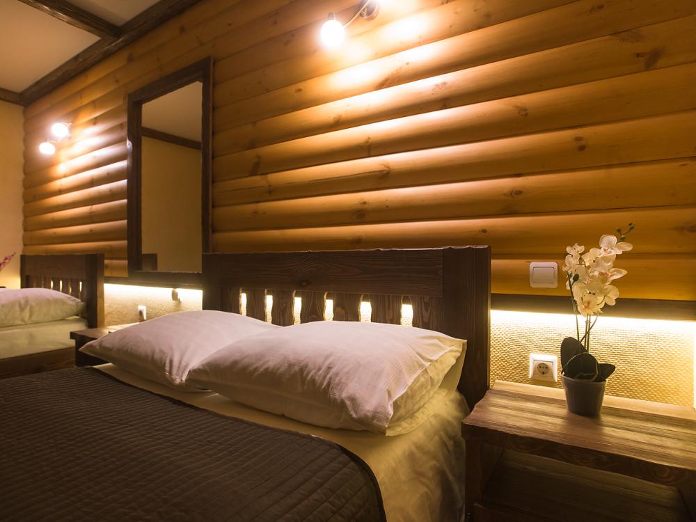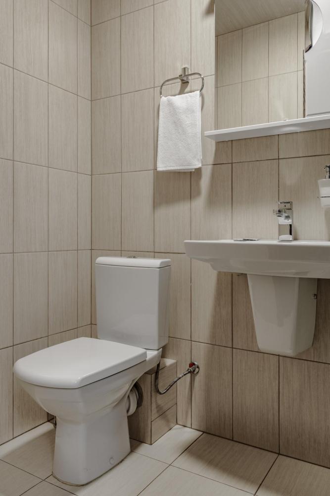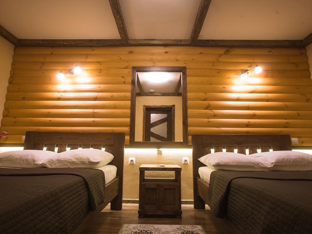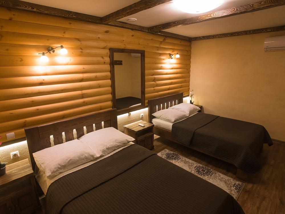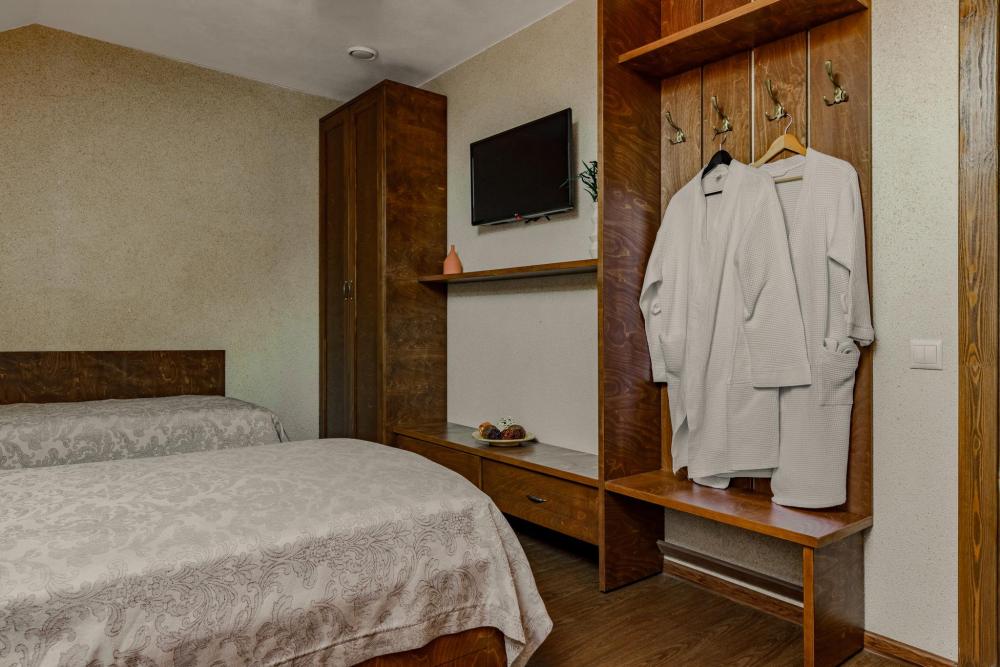 Однокомнатный номер 18 м² В номере: письменный стол, стул; большой плазменный телевизор; спутниковое тв; бесплатный WI-Fi; холодильник; кондиционер; теплые полы; две двуспальные кровати 2×1.0 м.; ортопедический матрас; прикроватные тумбы. шкаф для одежды Санузел: душевая кабина; унитаз.