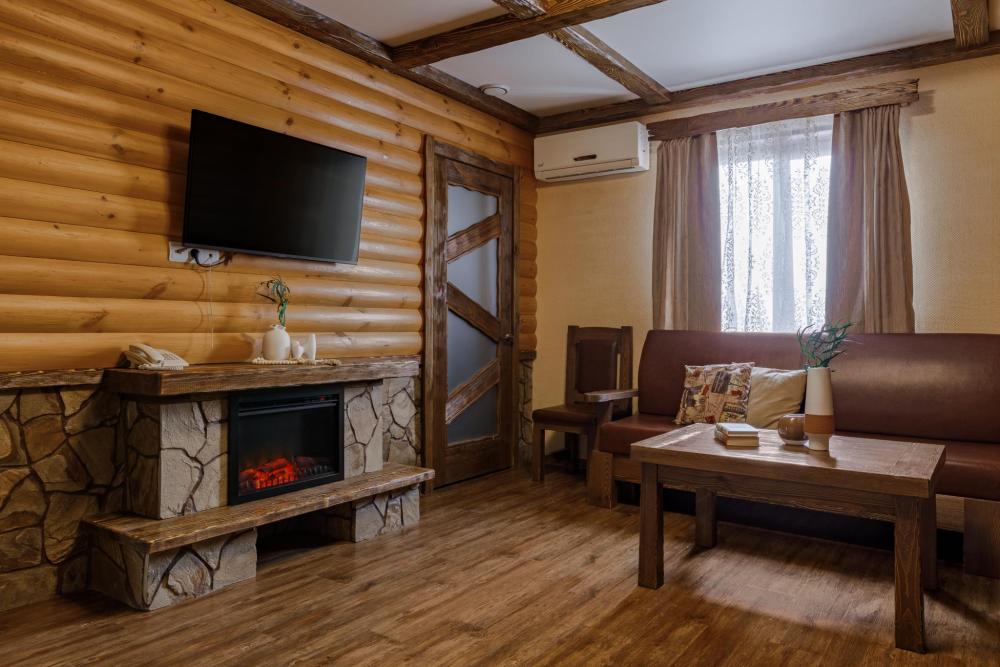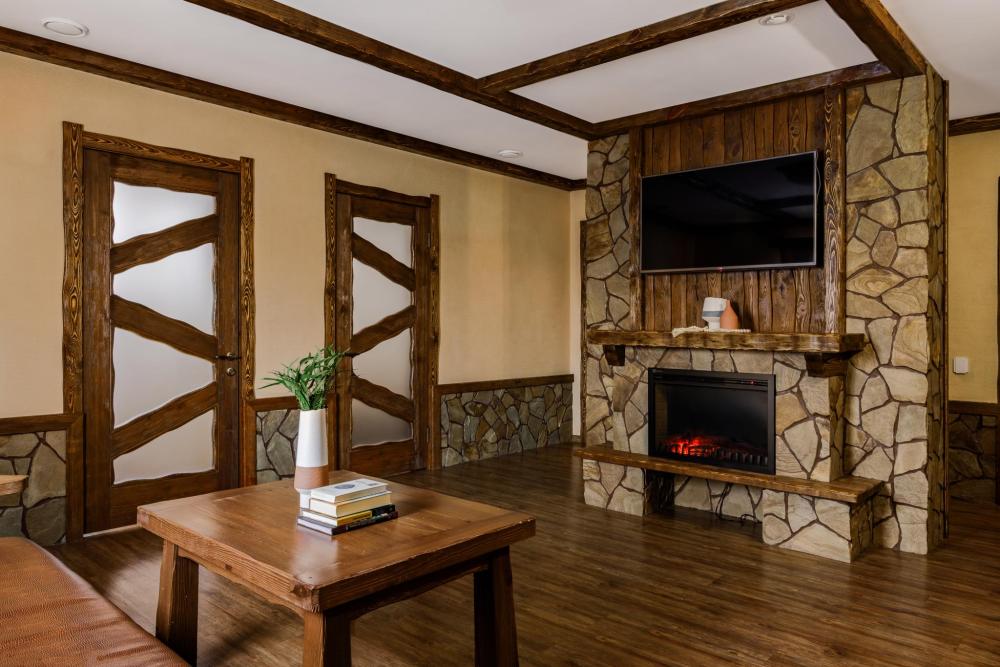 Большая гостиная: диван, чайный столик, камин (электрический), большой плазменный телевизор, спутниковое тв, смарт тв, бесплатный WI-Fi, кондиционер, теплые полы, холодильник. Спальная комната: двуспальная кровать 2×1.6 м., ортопедический матрас, прикроватные тумбы. Аква-зона: хамам, гидромассажная ванна, душевая стойка.