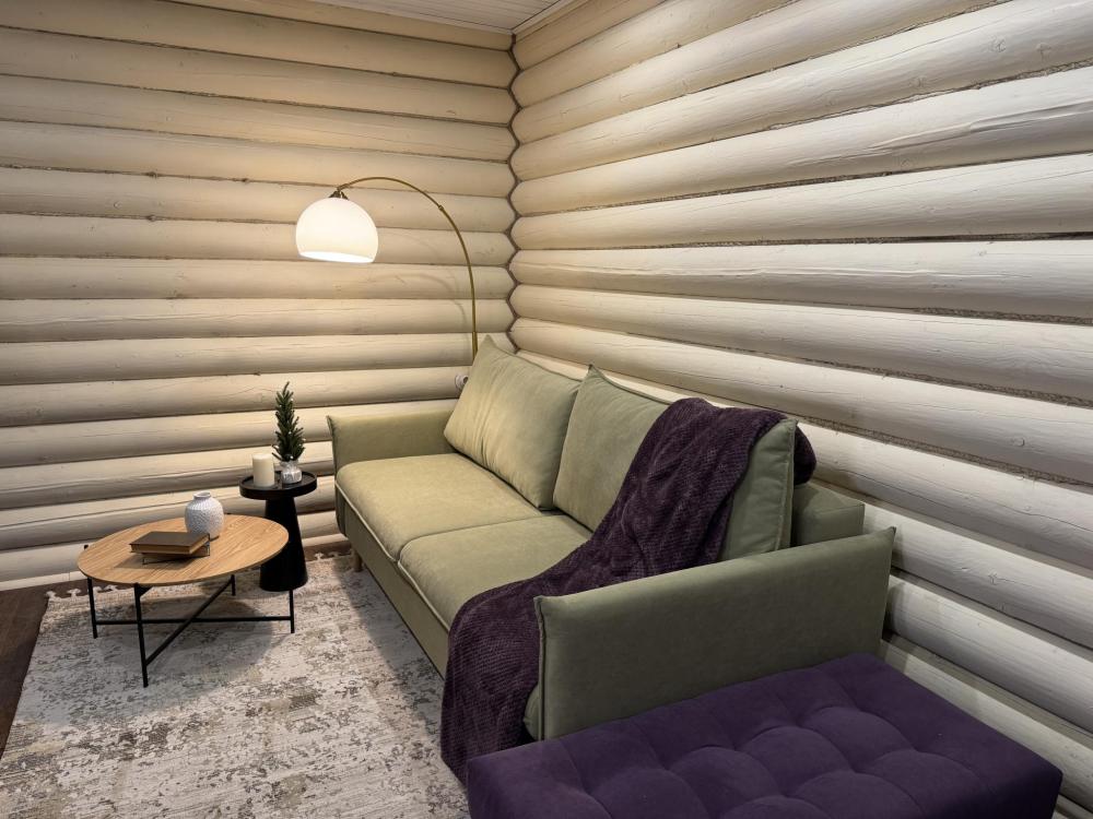 В гостиной: Мягкая мебель (кресло, диван: раскладывается при оформлении доп.места только для одного взрослого человека или для двоих детей), Журнальный столик, Внутренний телефон (связь между домиками), TV, Чайник, СВЧ-печь, Набор посуды (2 стакана, 2 чашки, 2 бокала, открывалка, штопор, разделочная доска, нож, одноразовые тарелки и приборы), мангальная зона (стол, скамейки, мангал). В спальне: Двуспальная кровать с одним матрасом, Две тумбочки, Шкаф + вешалки, Тапочки. В ванной комнате: Душ, Раковина, Набор полотенец, Зубной набор, Гигиенический набор: ватные палочки, ватные диски, Набор для душа: гель, шампунь.