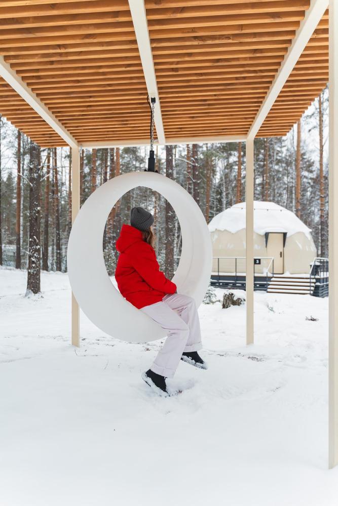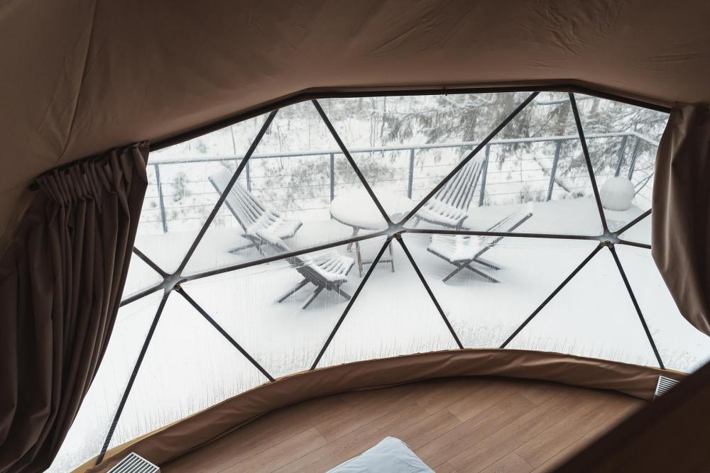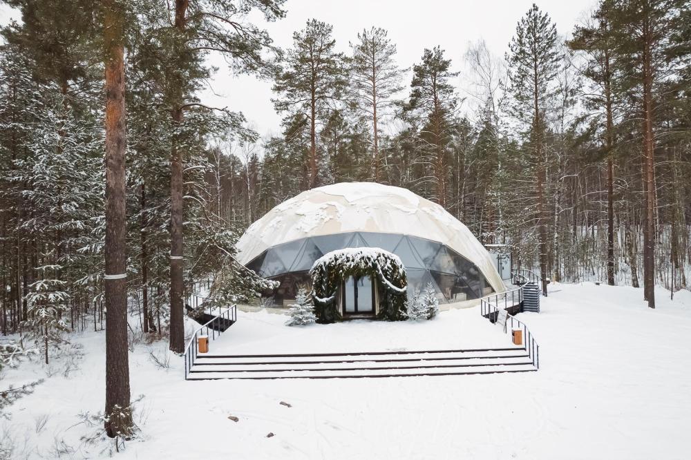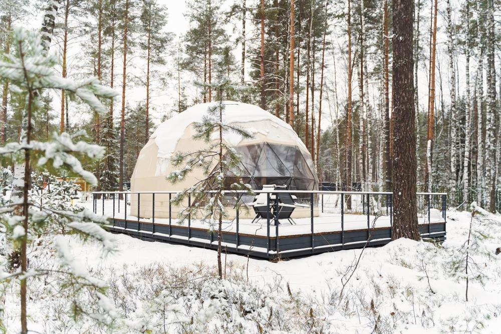 Уютные модули площадью 36 кв.м. вместимостью до 4-х гостей (2 основных места и 2 дополнительных оплачиваются отдельно, без дополнительного места может проживать 1 ребенок до 2 лет включительно) с террасой и панорамными окнами расположены в окружении соснового леса. Геокупол оснащен всем необходимым для максимально комфортного проживания: двухспальная кровать, или две односпальные кровати, дополнительные спальные места (160*200 см) на втором ярусе — для двух человек, прикроватные тумбочки, настенные светильники, шторы блэкаут, кондиционер, теплый пол, журнальный столик, стол, 4 стула, мини-холодильник, система хранения, посуда для приготовления и приема пищи, микроволновка, электрическая плитка на одну конфорку, чайник, платяной шкаф с вешалками, полками для одежды и полочкой для обуви, сейф, зеркало в полный рост, гладильная доска и утюг, ванная комната с душем, туалетно-гигиенические принадлежности.
