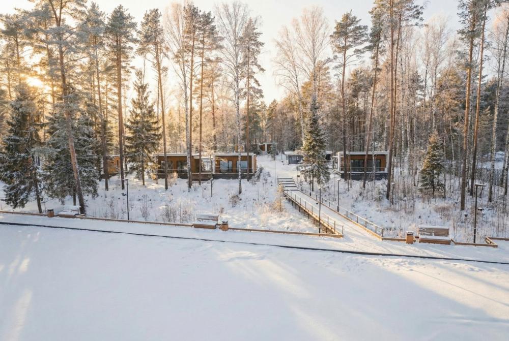 Отдельно стоящий стильный дом общей площадью 36 кв.м. вместимостью до 4 человек (2 основных места и 2 дополнительных оплачиваются отдельно, без дополнительного места может проживать 1 ребенок до 2 лет включительно). Имеет собственную террасу. Расположен на первой линии у озера Шап. В доме собственная терраса, панорамные окна дома открывают вид на сосновый лес и наполняют помещение естественным светом. Интерьер выполнен в светлых нейтральных оттенках, а дом оснащен качественной техникой и мебелью. Дом оснащен всем необходимым для комфортного проживания гостей: двухспальная кровать или две односпальные кровати, раскладной диван на 2 чел. (150×190 см), подушки - 4 шт., одеяла - 4 шт., прикроватные тумбочки, настенные светильники, шторы блэкаут, телевизор SMART-TV, кондиционер, теплый пол, журнальный столик, стол, 4 стула, мини-холодильник, система хранения, посудомоечная машина, микроволновка, электрическая плитка на одну конфорку, чайник, посуда для приготовления и приема пищи, ванная комната с душем, туалетно-гигиенические принадлежности.