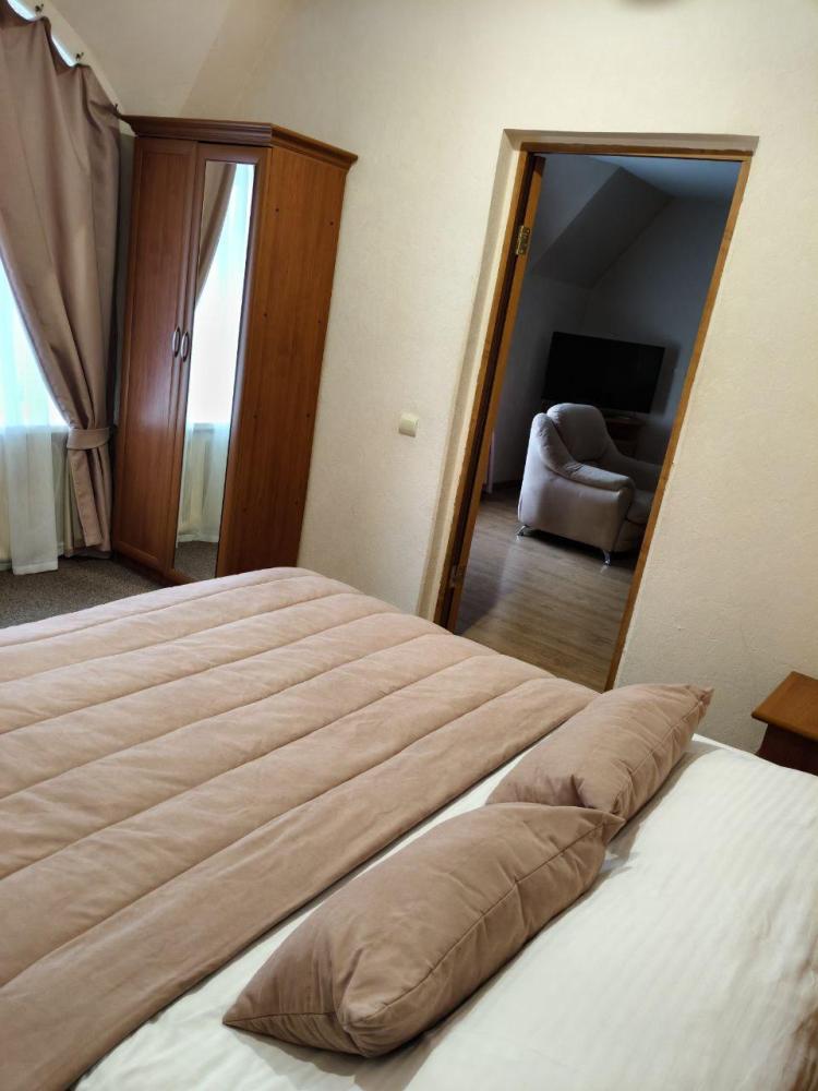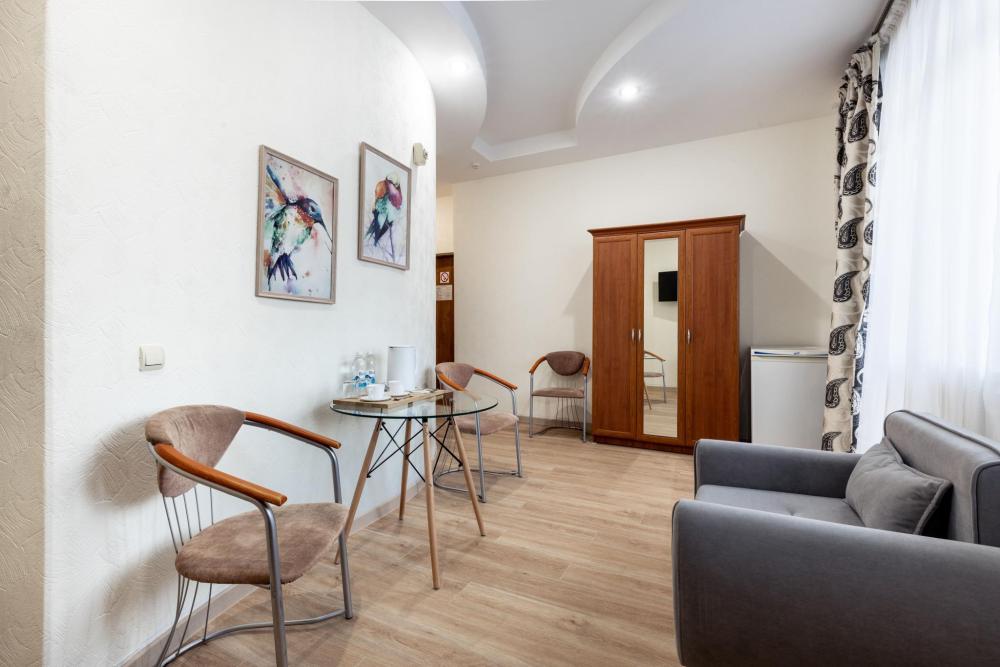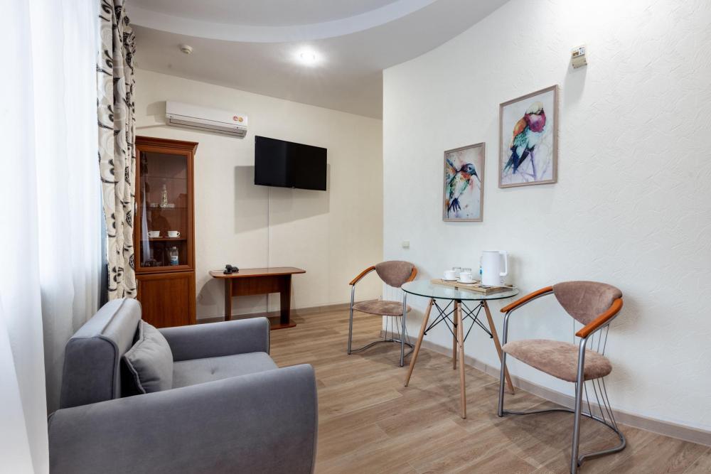 Двухкомнатный номер с двумя односпальными или с двуспальной кроватью и гостиной с мягкой мебелью. Во всех номерах есть телевизор, холодильник, шкаф‑купе для одежды. Полностью укомплектованная ванная комната. Площадь номера: 42‑49 кв.м.