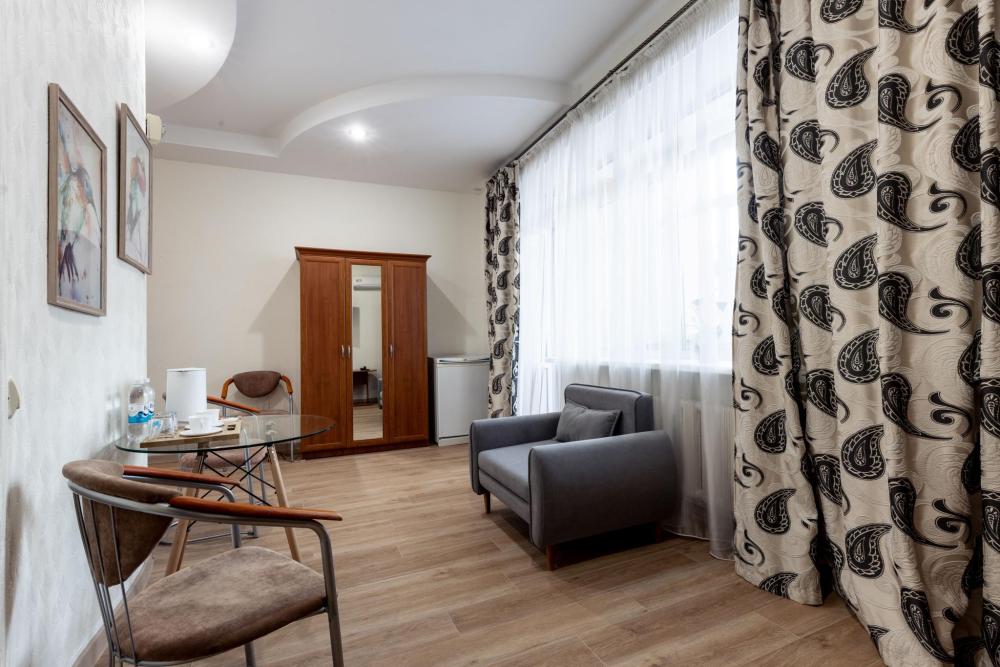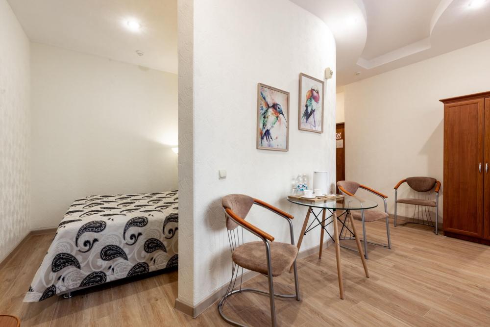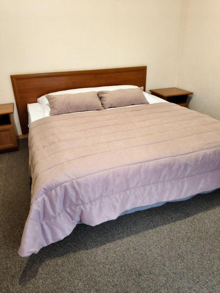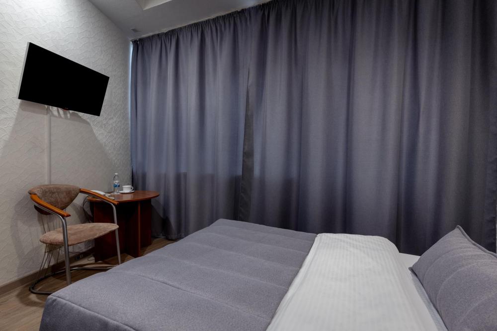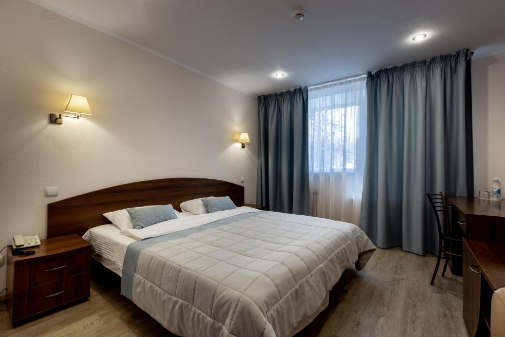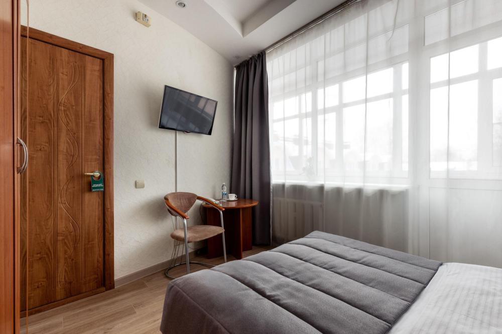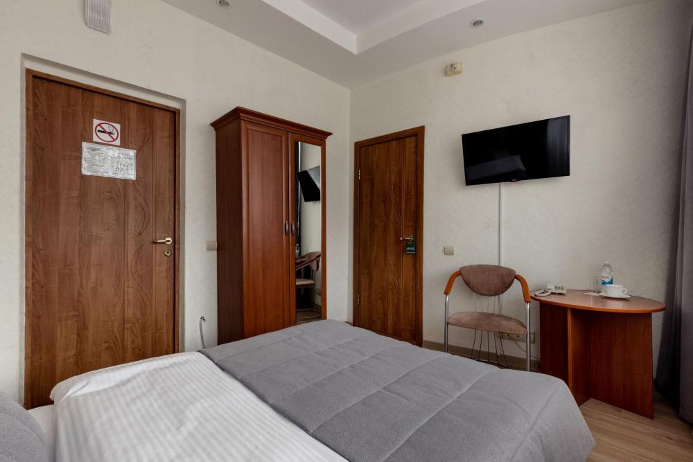 Однокомнатный номер с двуспальной кроватью, письменным столом и необходимой мебелью. Во всех номерах есть телевизор, холодильник, шкаф‑купе для одежды. Полностью укомплектованная ванная комната. Площадь номера: 24 кв.м.