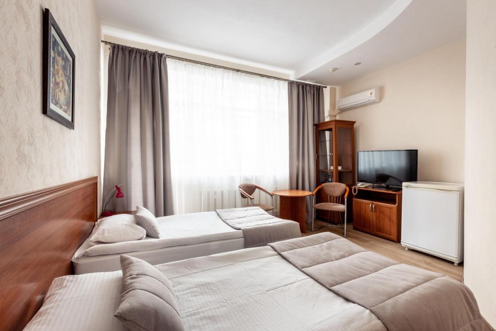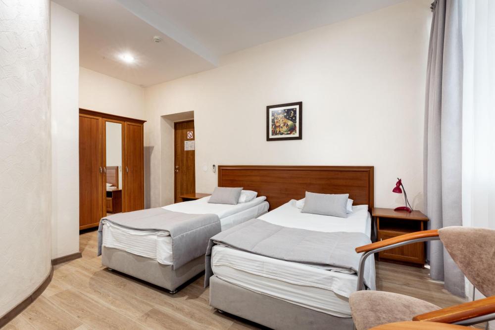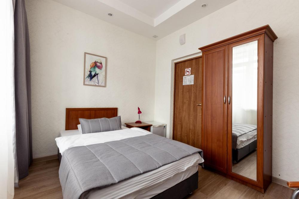Однокомнатный номер с двумя односпальными кроватями, письменным столом и необходимой мебелью. Во всех номерах есть телевизор, холодильник, шкаф‑купе для одежды. Полностью укомплектованная ванная комната. Площадь номера: 18‑24 кв.м.