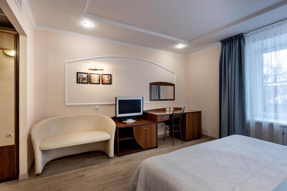 Однокомнатный номер с двуспальной кроватью, письменным столом и необходимой мебелью. Во всех номерах есть телевизор, холодильник, шкаф‑купе для одежды. Полностью укомплектованная ванная комната. Площадь номера: 18‑24 кв.м.
