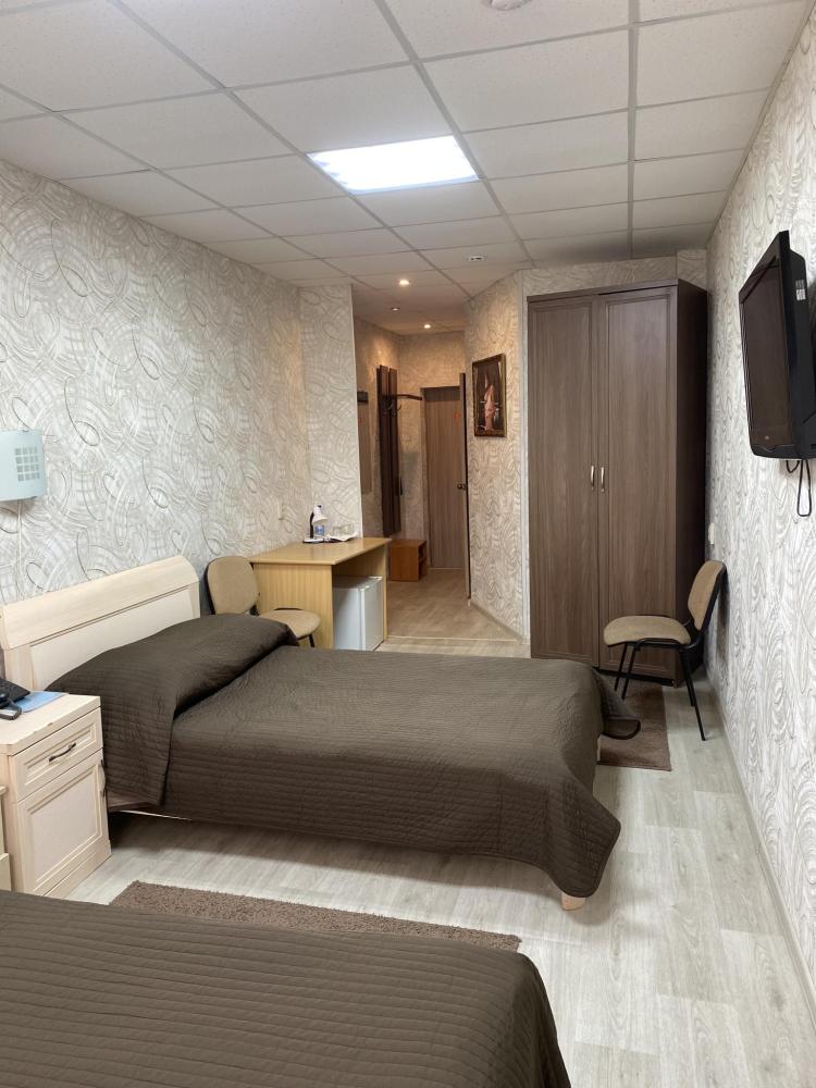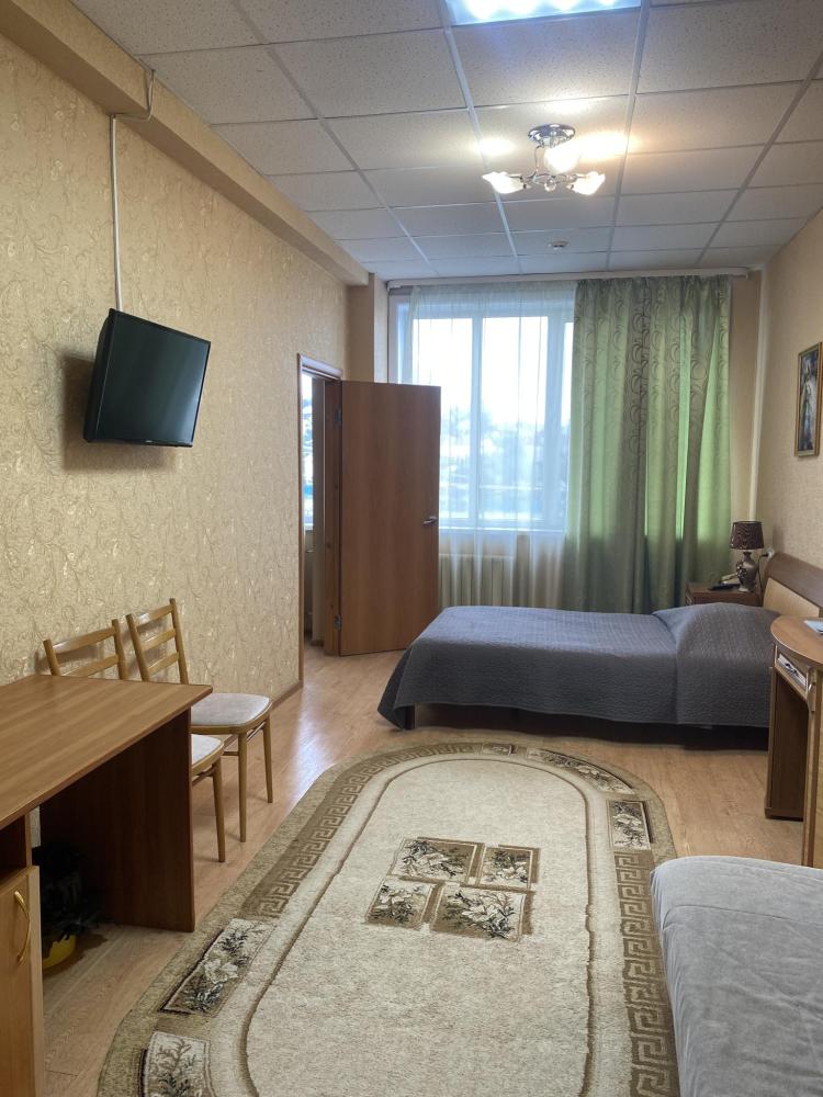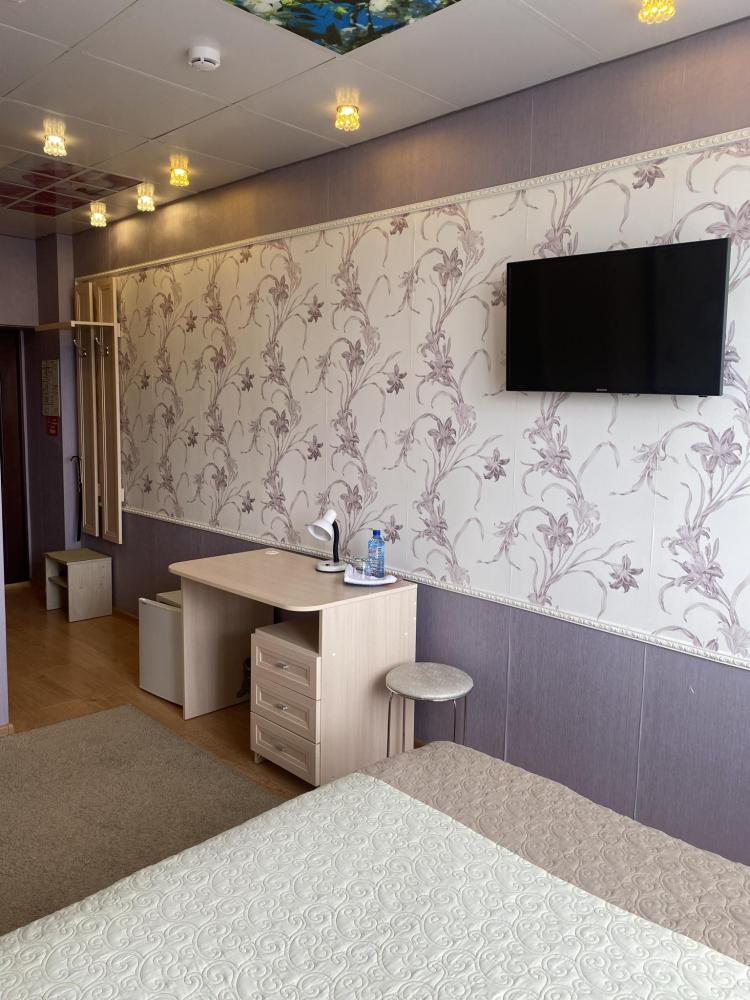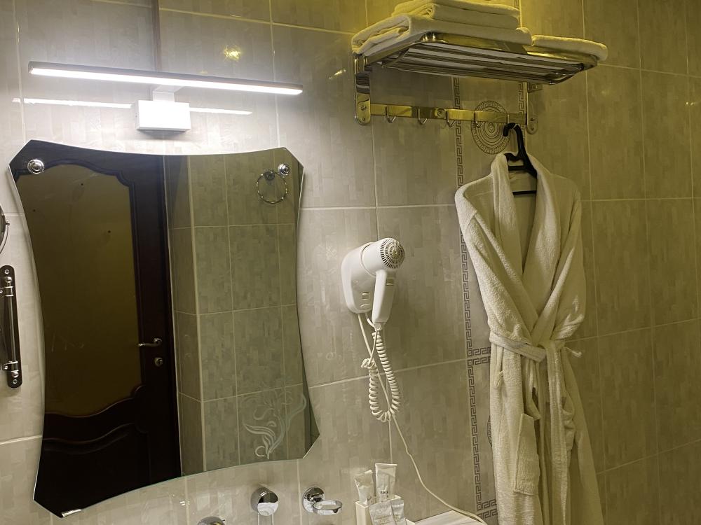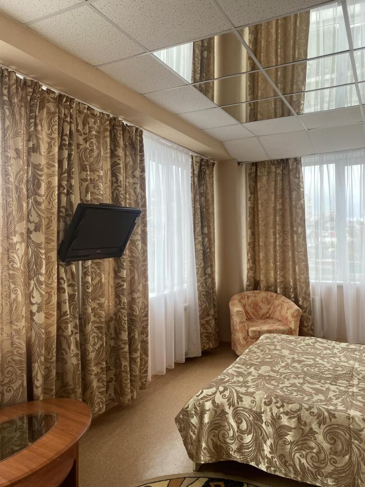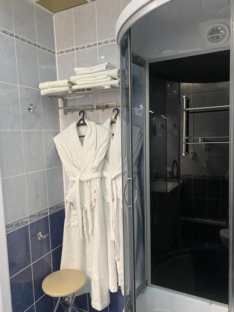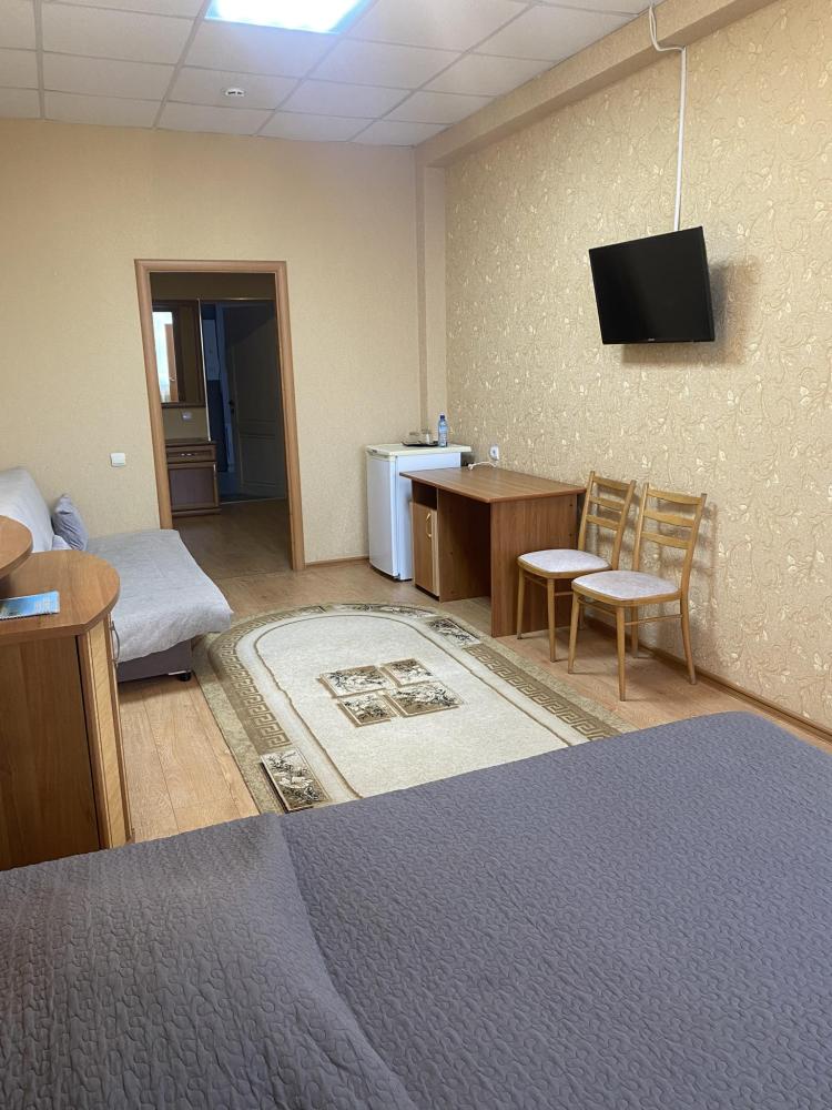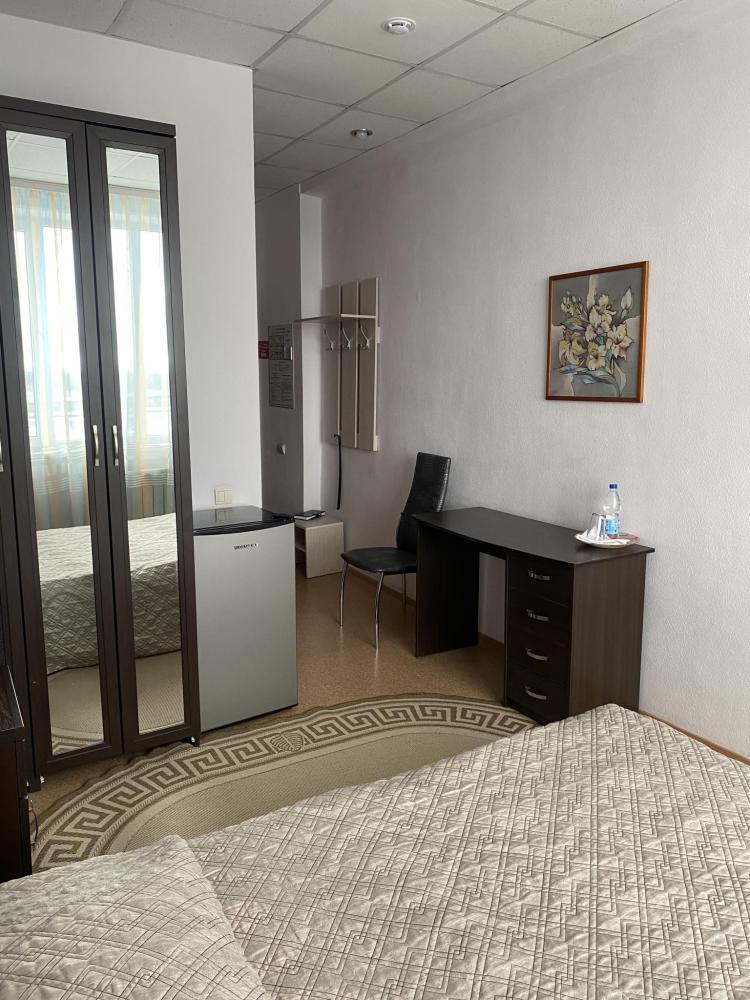 В номере: 2 кровати, 2 Тумбы, платяной шкаф, ЖК Телевизор, рабочий стол, журнальный столик, холодильник, санитарный узел с душевой кабиной, средства гигиены, набор полотенец, фен.