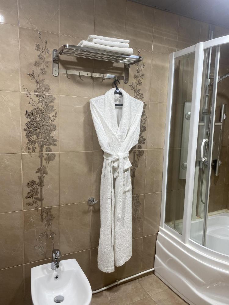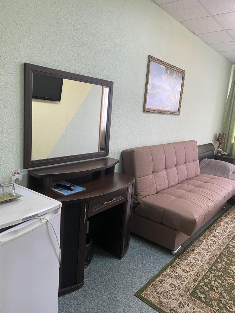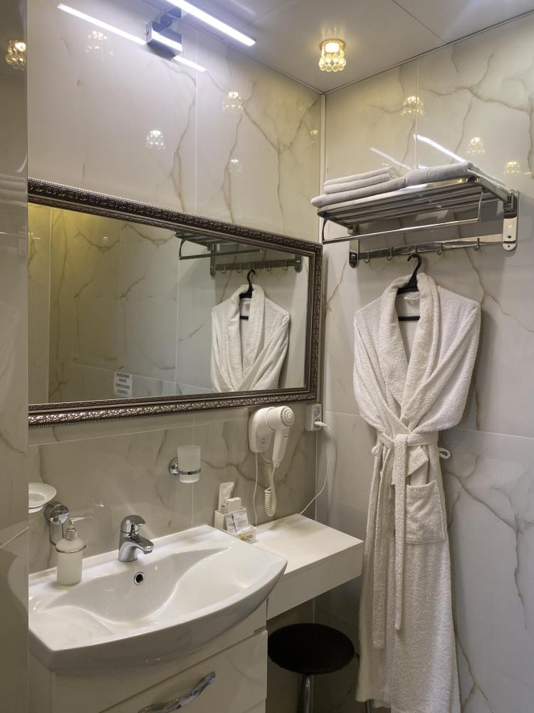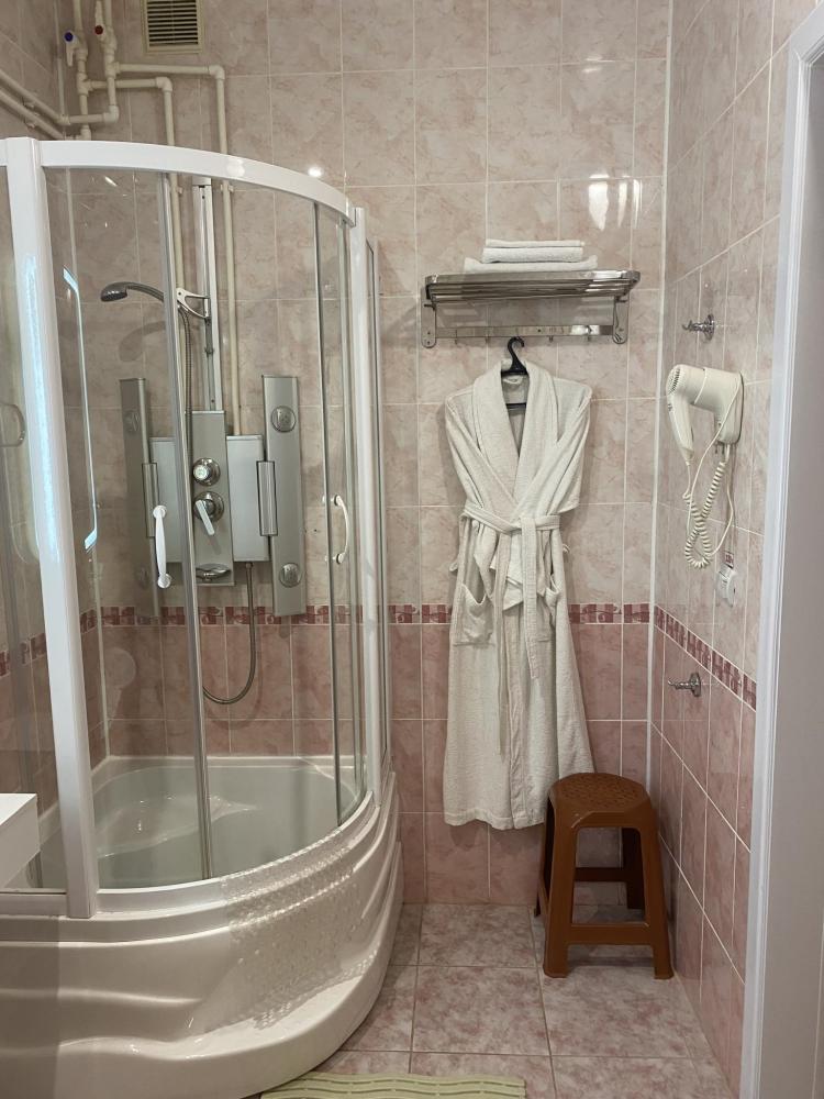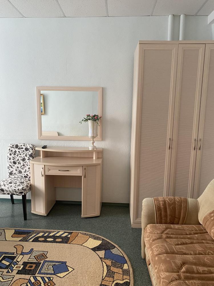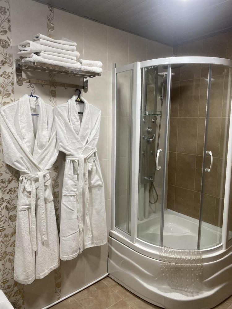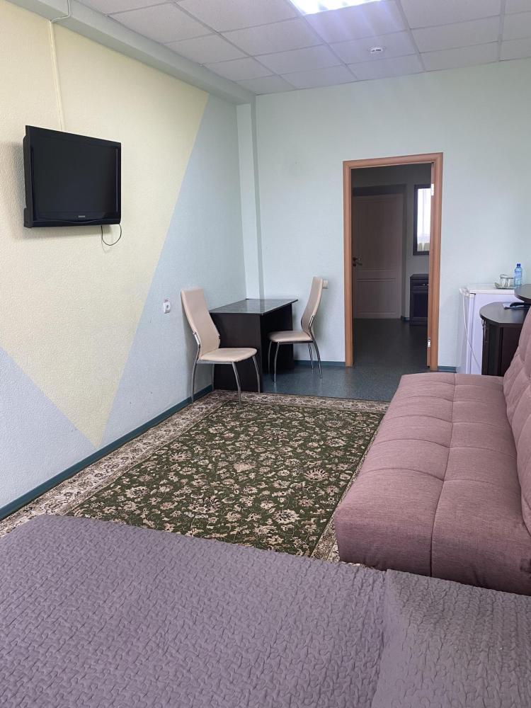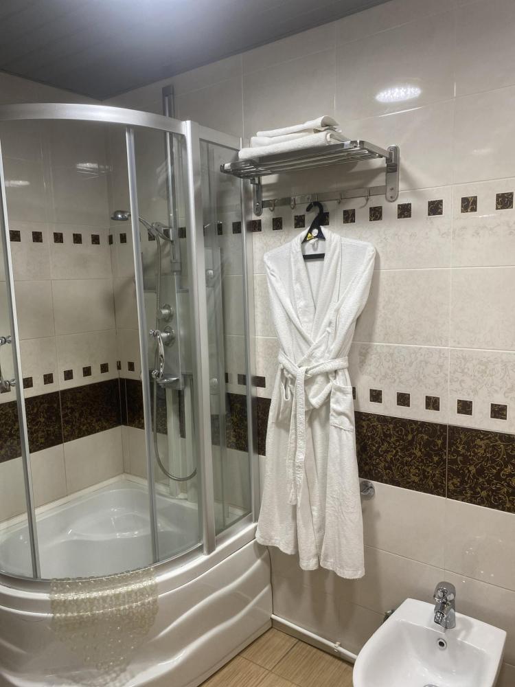 В номере: 2 кровати, 2 Тумбы, платяной шкаф, ЖК Телевизор, рабочий стол, журнальный столик, холодильник, санитарный узел с душевой кабиной, средства гигиены, набор полотенец, фен.