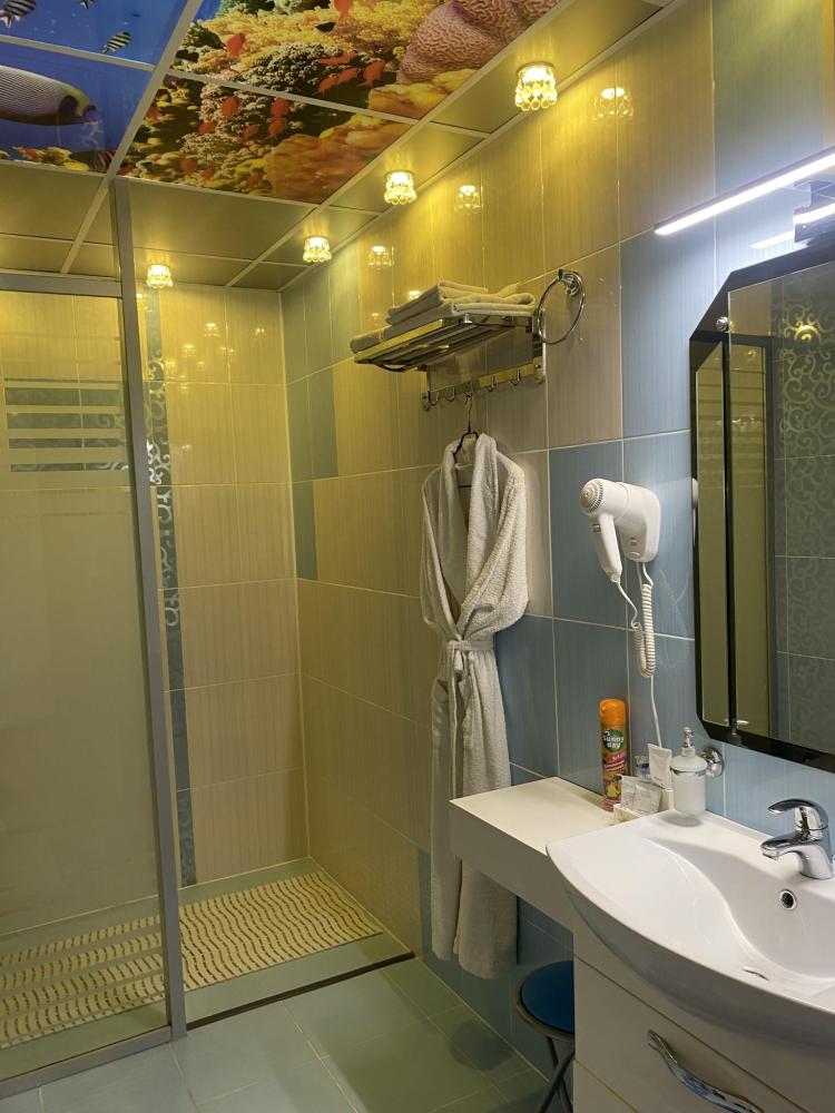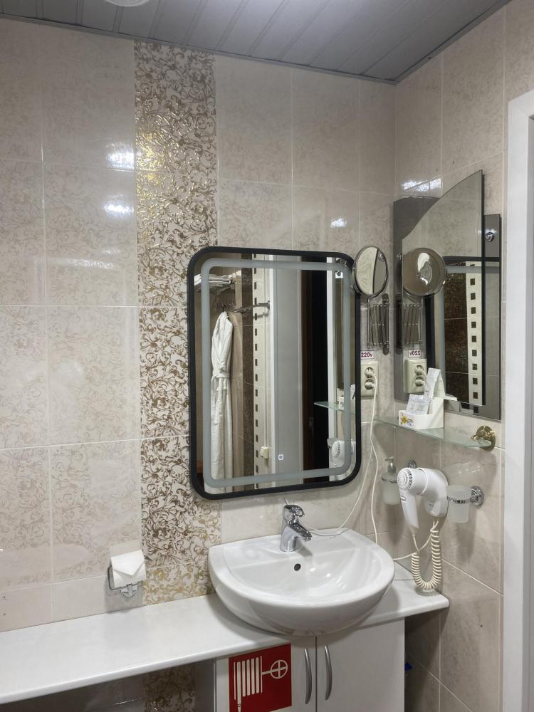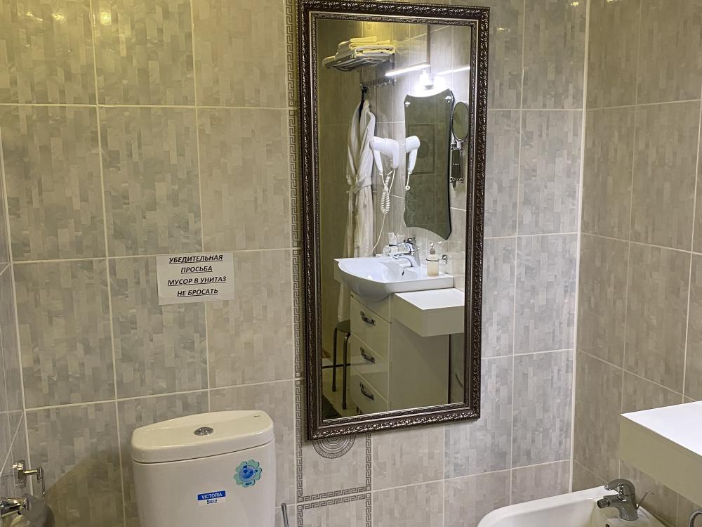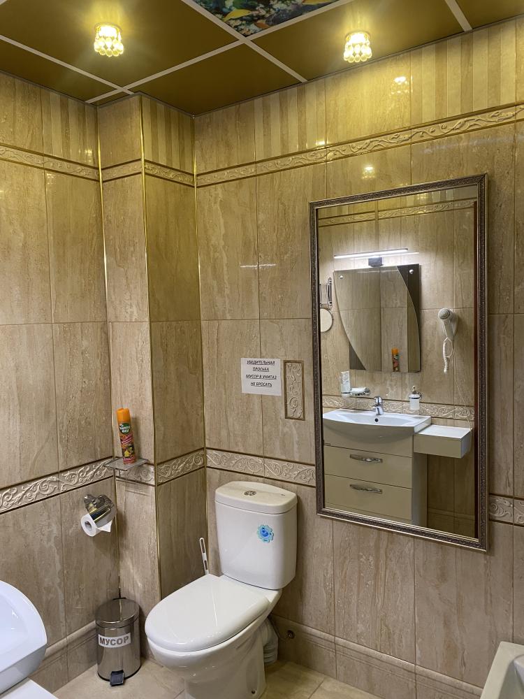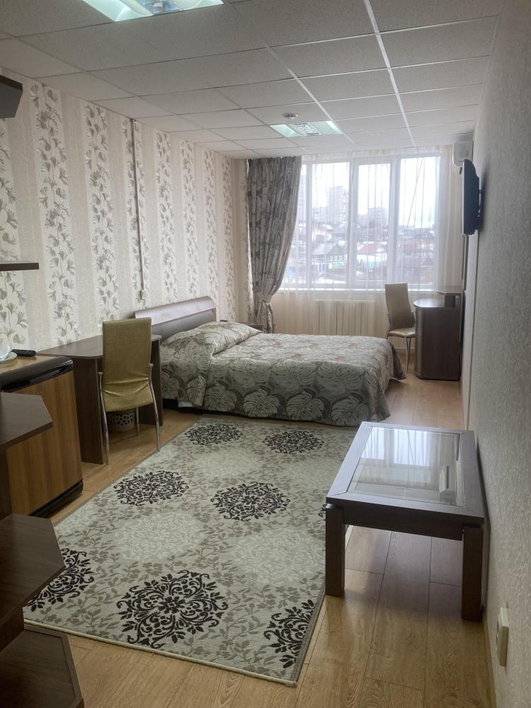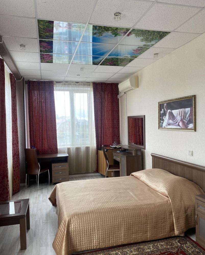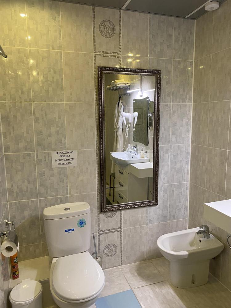 В номере: 2 кровати, 2 Тумбы, платяной шкаф, ЖК Телевизор, рабочий стол, журнальный столик, холодильник, санитарный узел с душевой кабиной, средства гигиены, набор полотенец, фен.