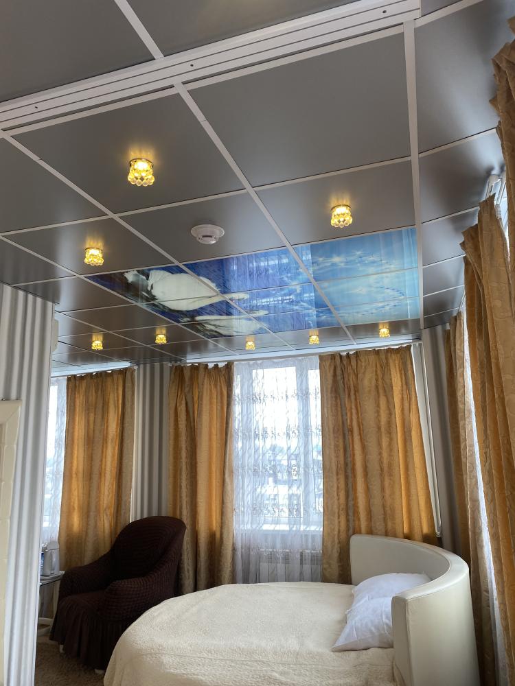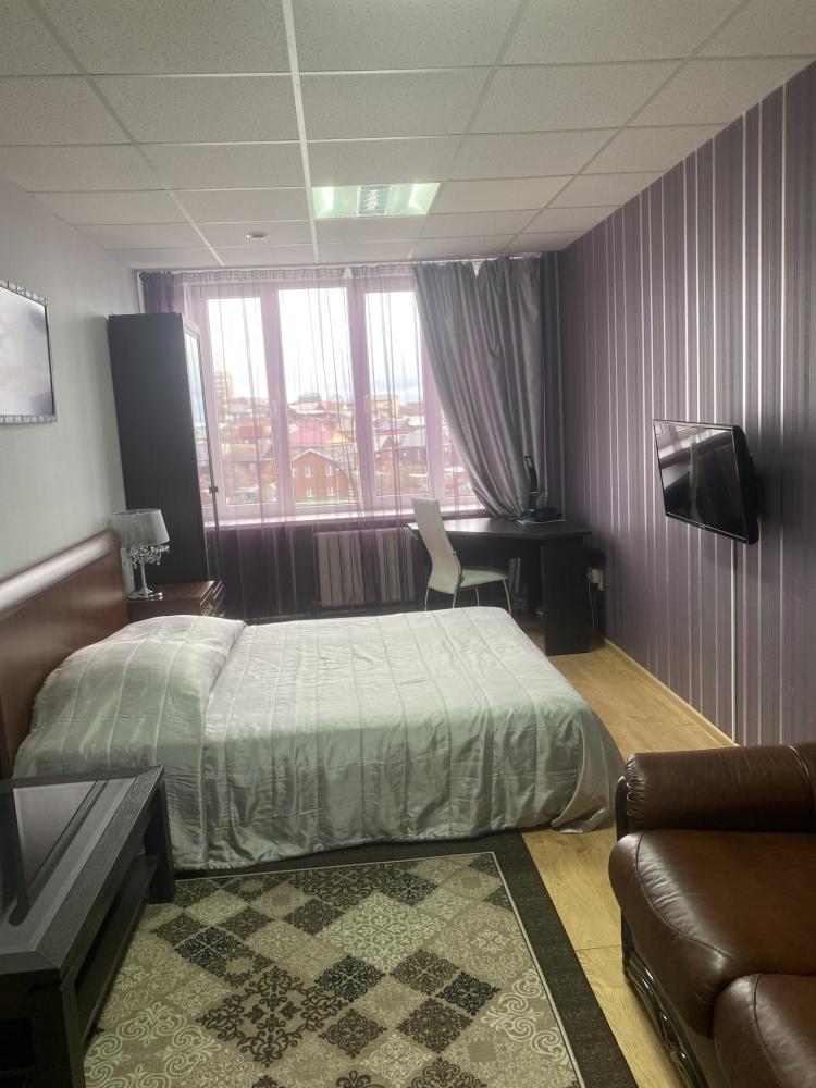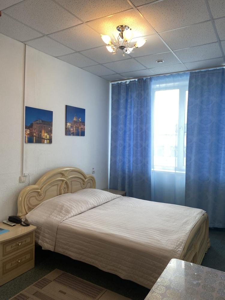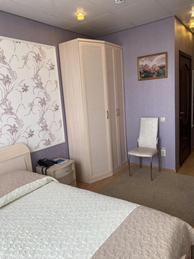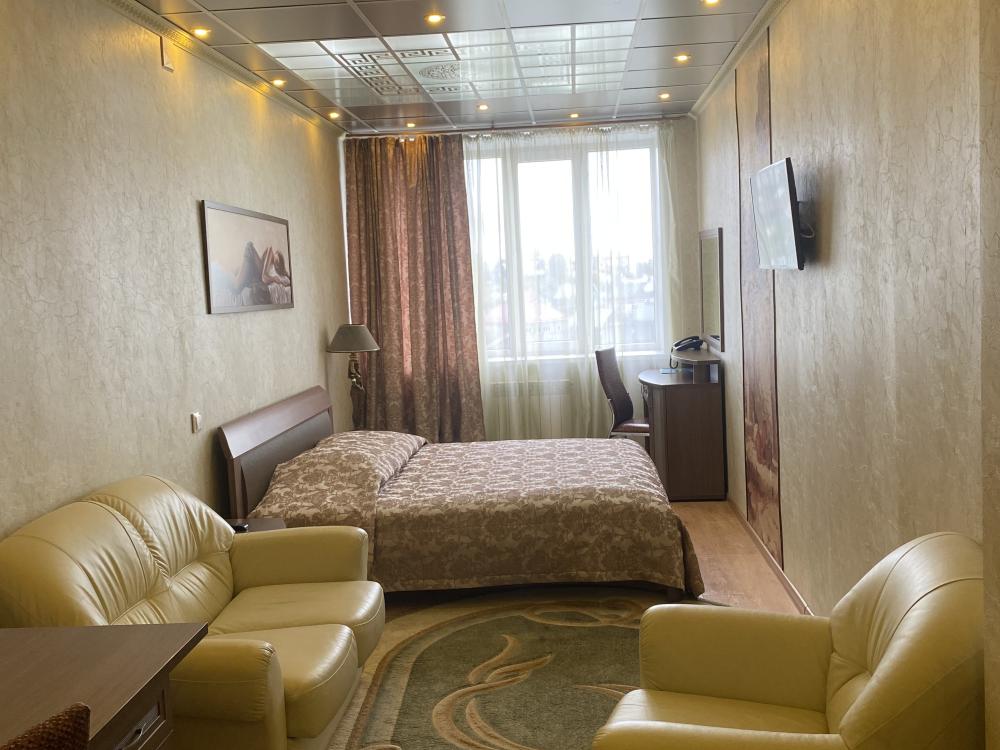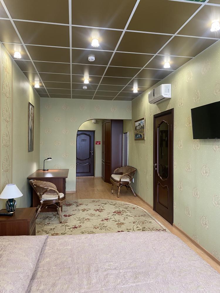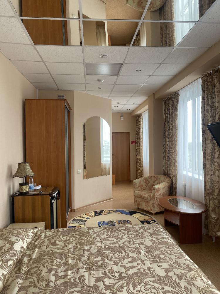 В номере: двуспальная кровать, тумба, платяной шкаф, кресла, стул, рабочий стол, светильник, ЖК Телевизор, холодильник, санитарный узел с душевой кабиной, средства гигиены, набор полотенец, фен. Завтрак включен в стоимость номера.