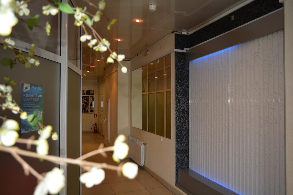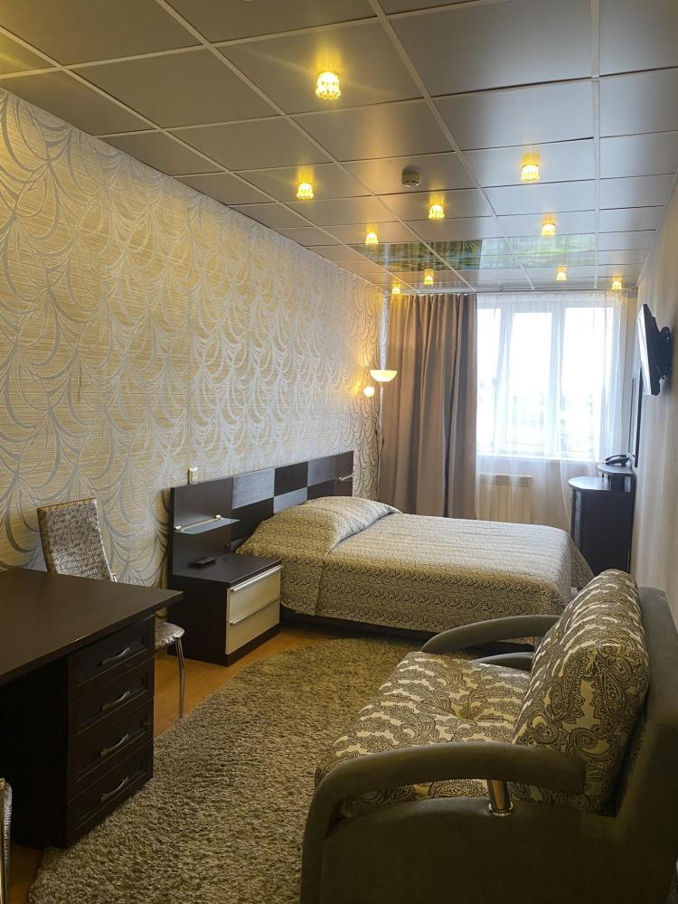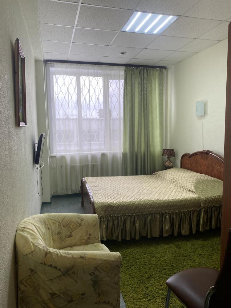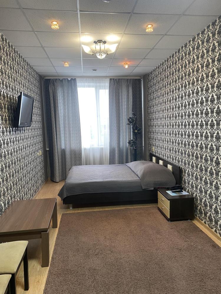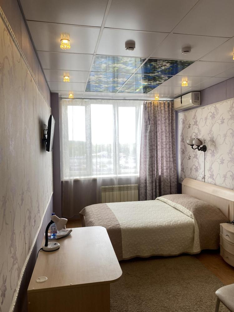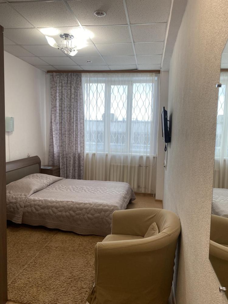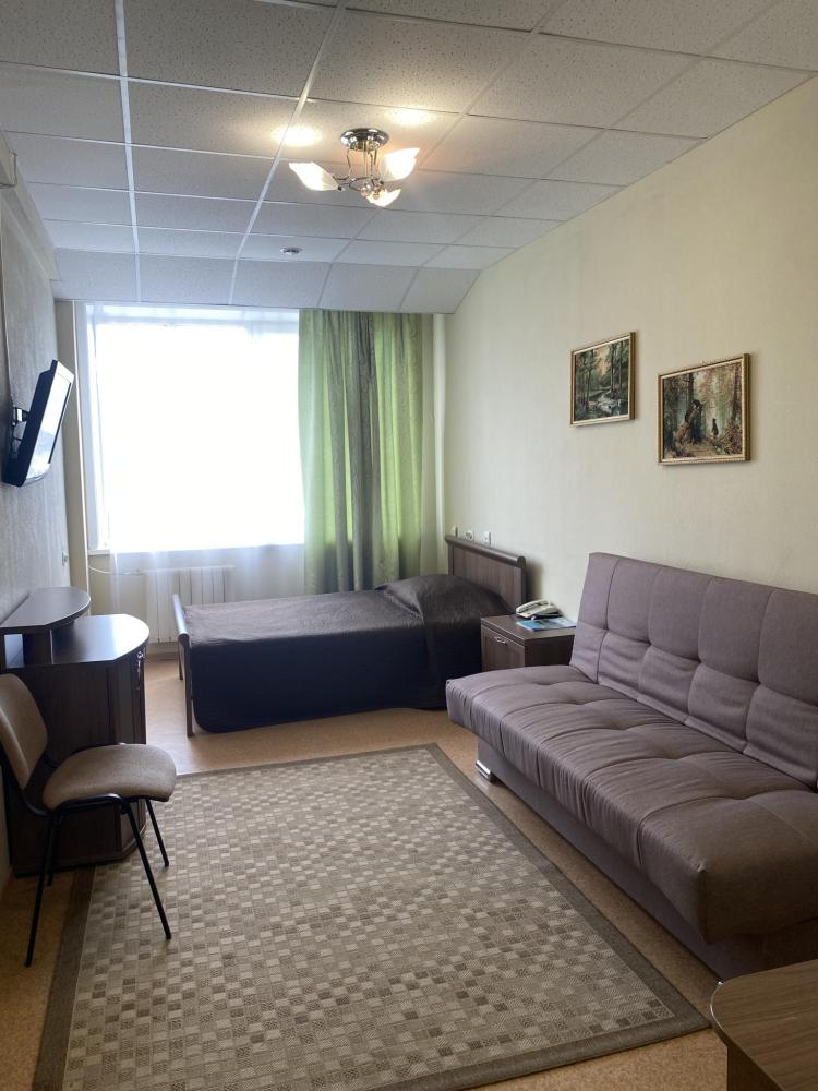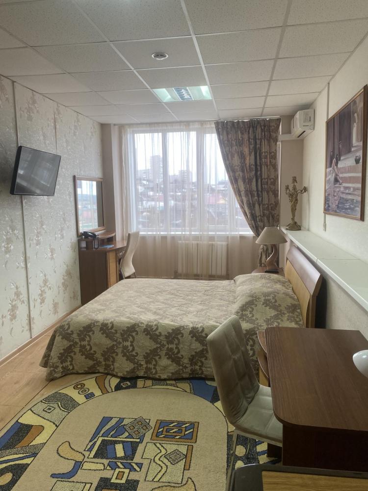 В номере: кровать, тумба, платяной шкаф, кресло, стул, рабочий стол, светильник, ЖК Телевизор, холодильник, санитарный узел с душевой кабиной, средства гигиены, набор полотенец, фен.
