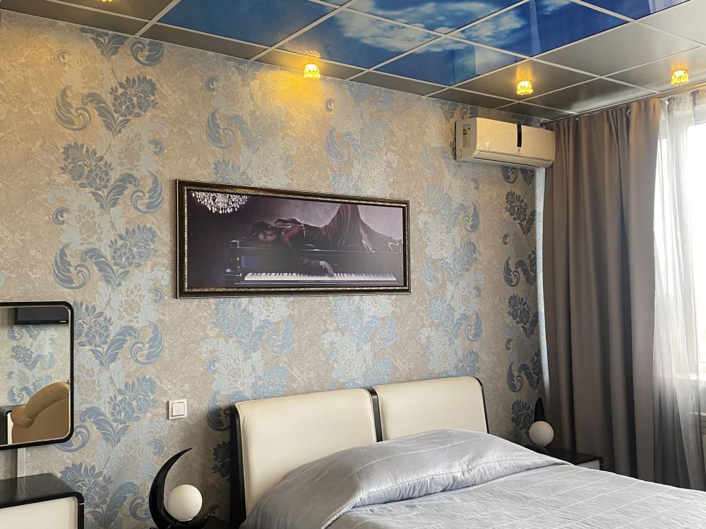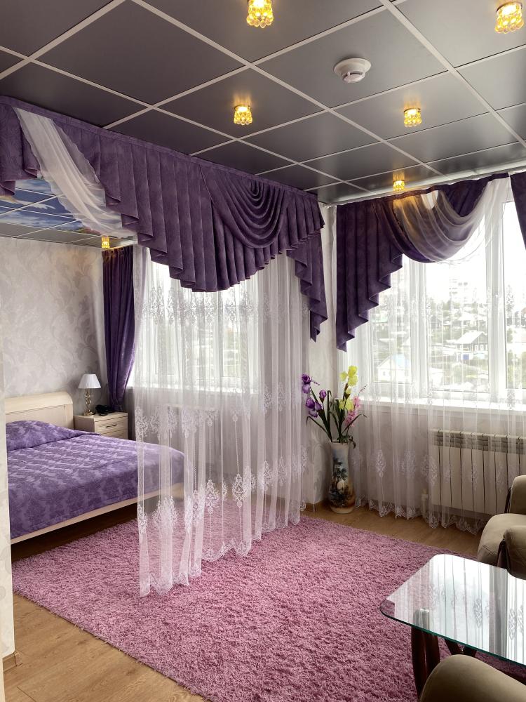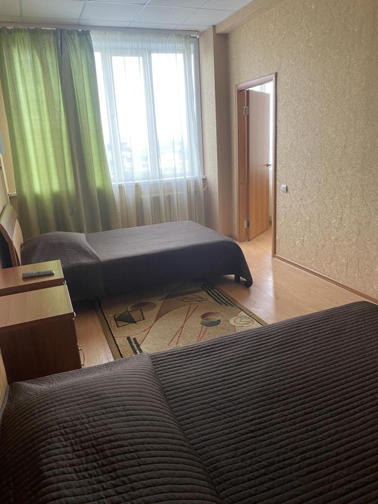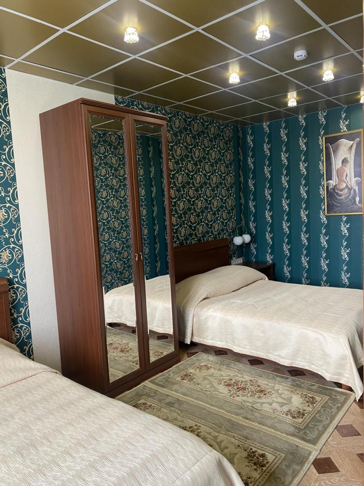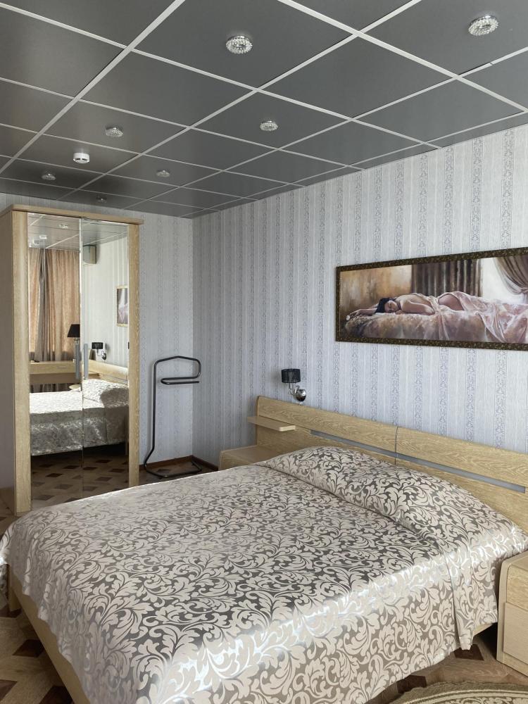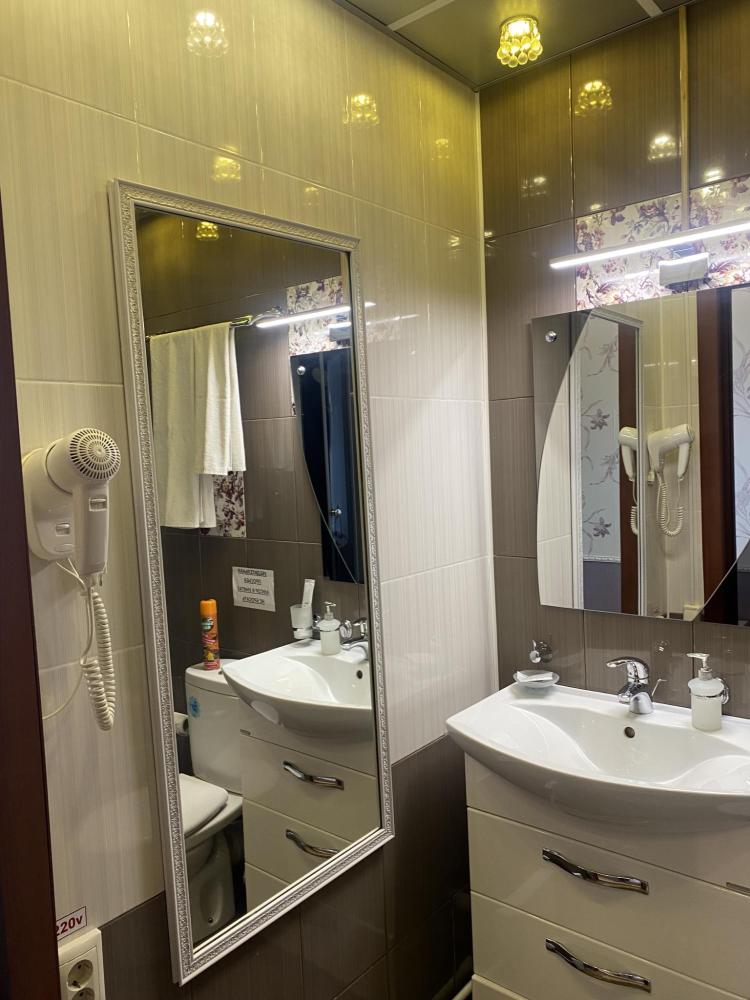 В номере: 2 Двуспальных кровати, 2 Тумбы, платяной шкаф, ЖК Телевизор, рабочий стол, журнальный столик, холодильник, санитарный узел с душевой кабиной, средства гигиены, набор полотенец, фен.