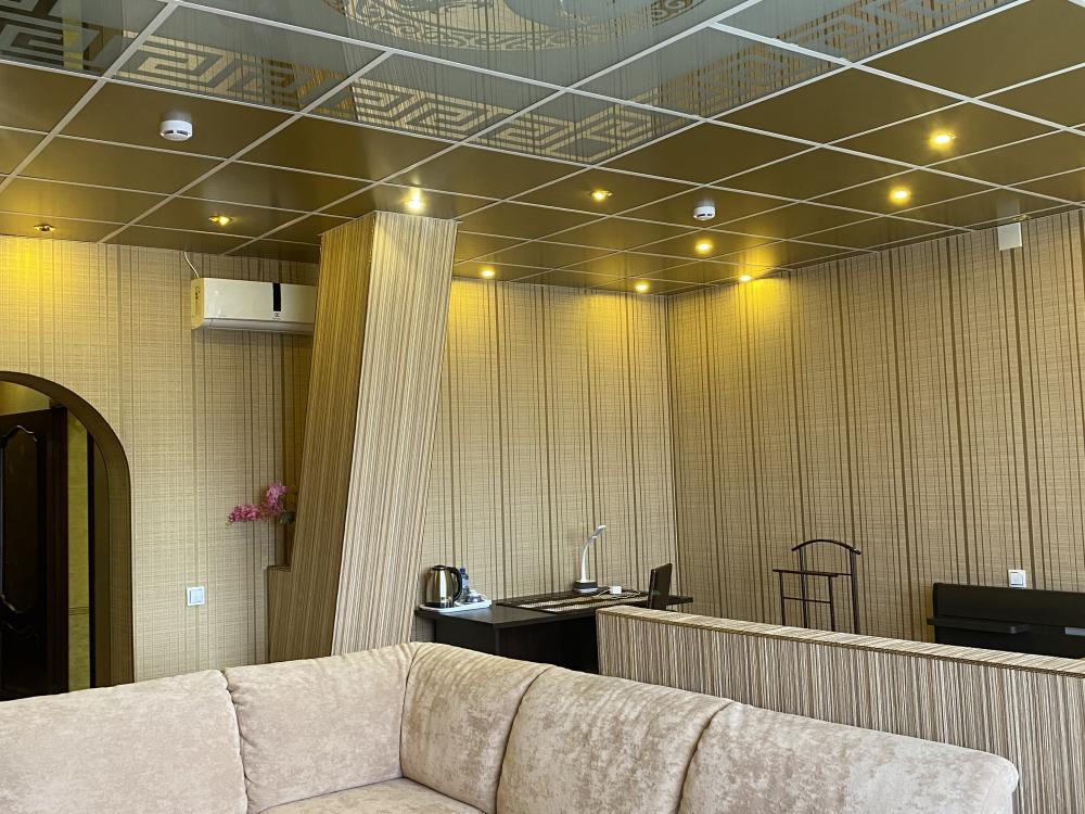 В номере: кровать, шкаф-купе, туалетный столик, раскладной диван, кресло, ЖК Телевизор, сейф, кондиционер, холодильник, средства гигиены, набор полотенец, санитарный узел с душевой кабиной, фен, халат, тапочки.