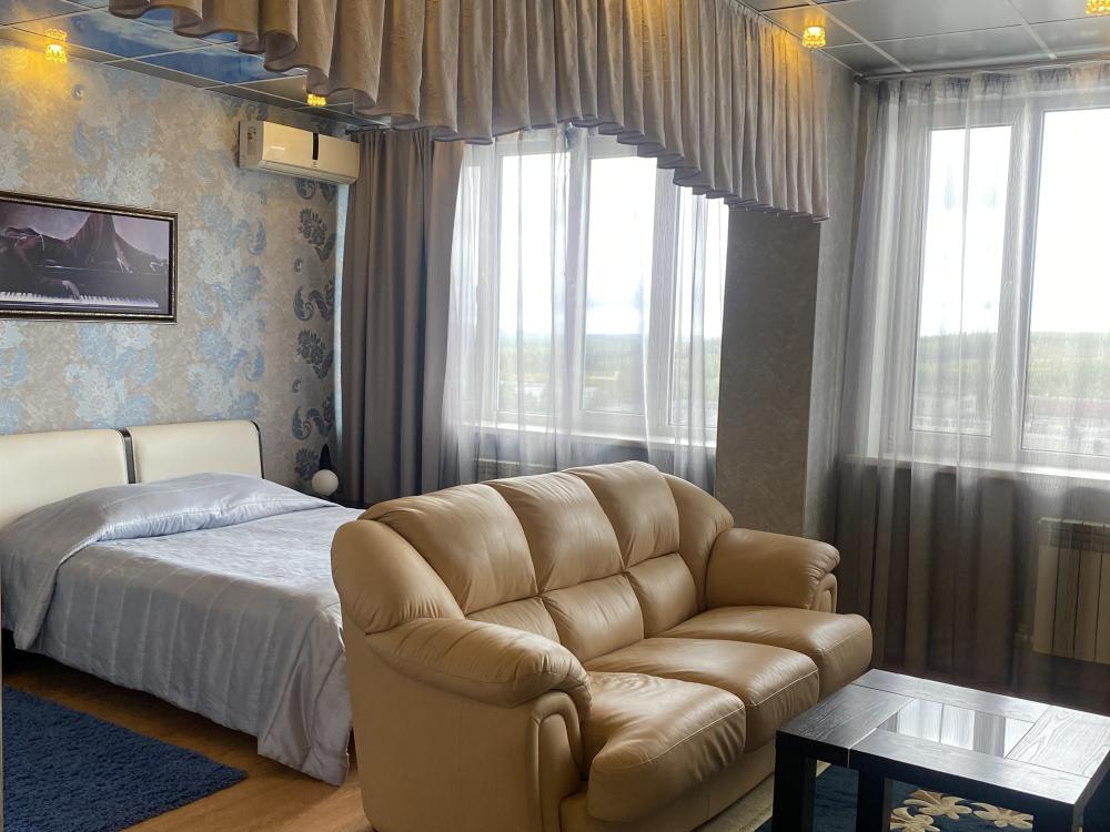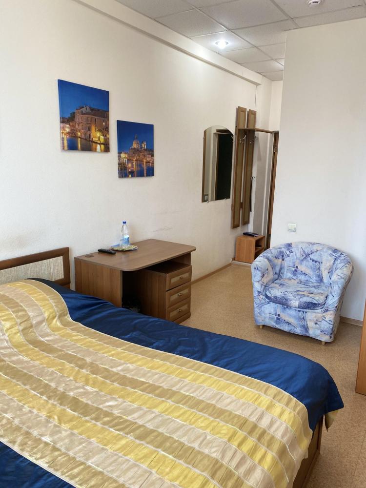 В номере: односпальная кровать, 2 Тумбы, 2 Светильника, туалетный столик, рабочий стол, диван, ЖК Телевизор, платяной шкаф, холодильник, стул, кондиционер, санитарный узел с душевой кабиной, средства гигиены, набор полотенец, фен, халат, тапочки, сейф.