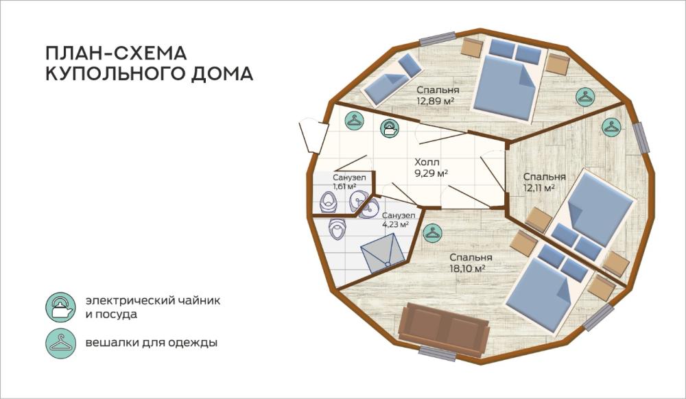 Купольный дом общей площадью 60 м2; В каждом купольном доме – 3 номера (2-3-х местные) и 2 общих санузла. Оснащение номера: 2-3 односпальные кровати с ортопедическими матрацами, тумбы/полки для хранения вещей, зеркало. Отопление/водоснабжение/канализация - централизованное. Купольные дома постройки: 2019 - 2020 г., модульные дома постройки: 2024 г., материал - экологичный и энергоэффективный пенополиуретан, рекомендованный для строительства детских и медицинских учреждений. Централизованное отопление, водоснабжение, канализация, электричество. Wi-FI.