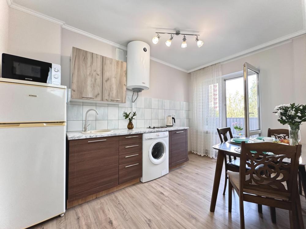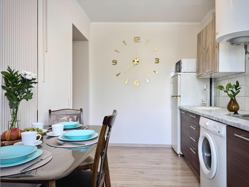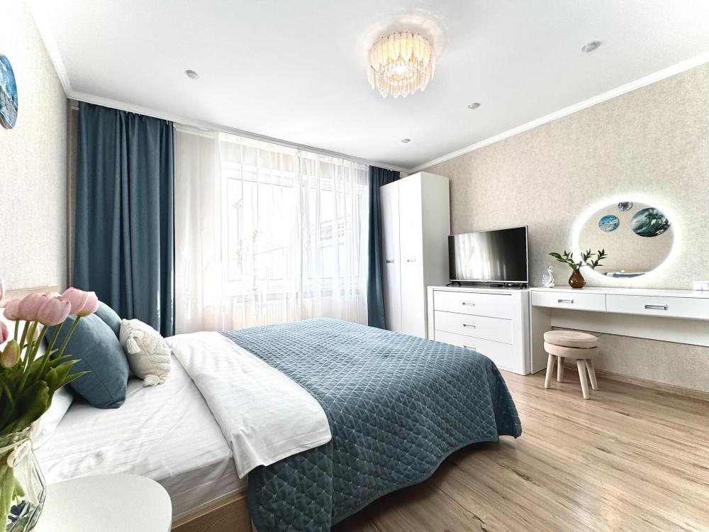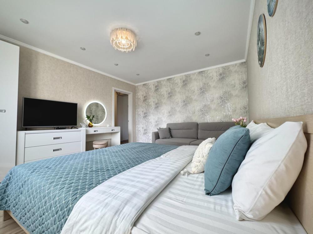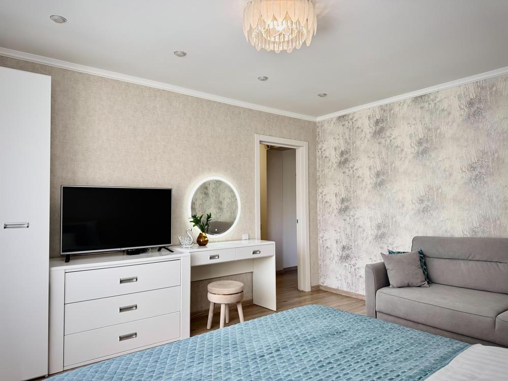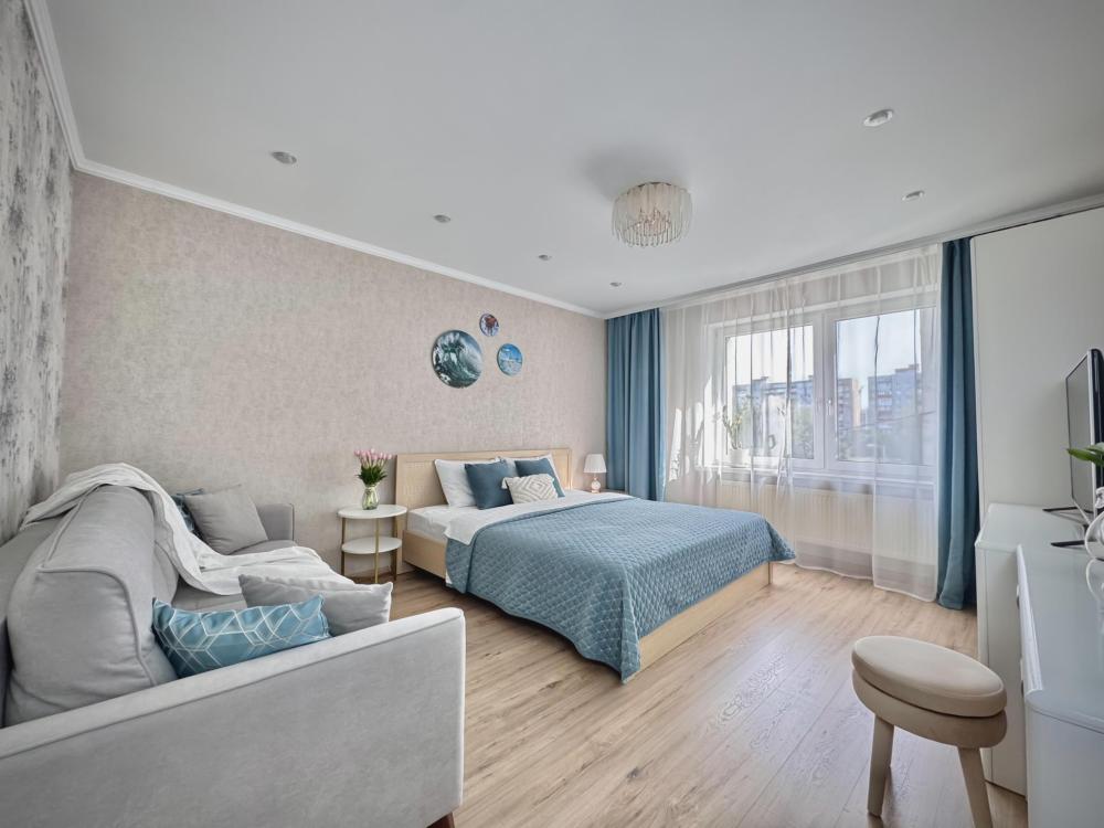 Однокомнатные апартаменты для 4 гостей. Спальные места: диван и двуспальная кровать. В квартире есть все необходимое для комфортного проживания: мебель и бытовая техника, чистое постельное бельё, посуда, WiFi, электроплита, СВЧ печь, холодильник, домофон, электрический чайник, утюг с гладильной доской, телевизор, большая кровать 180x200 см., двуспальный диван, полотенца.