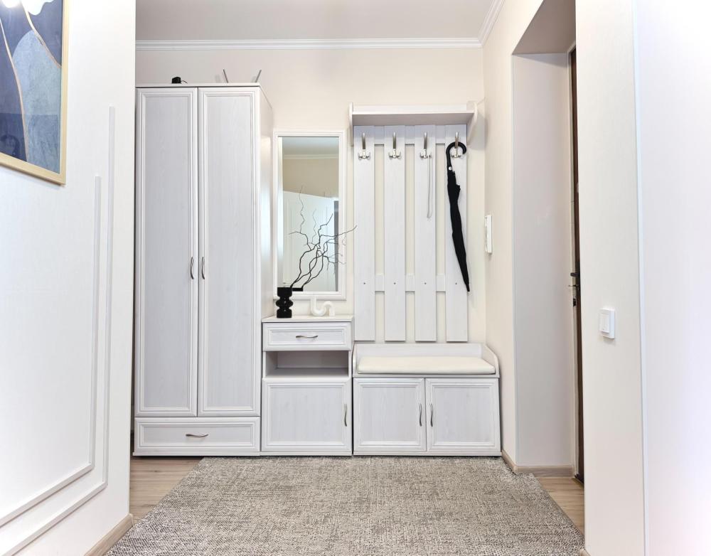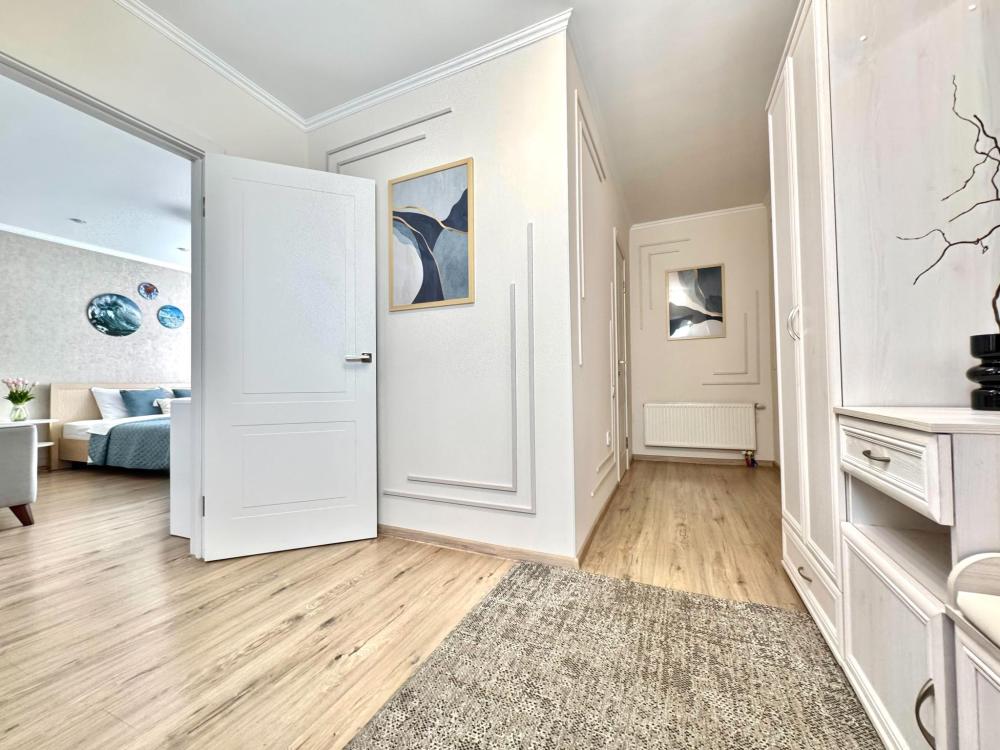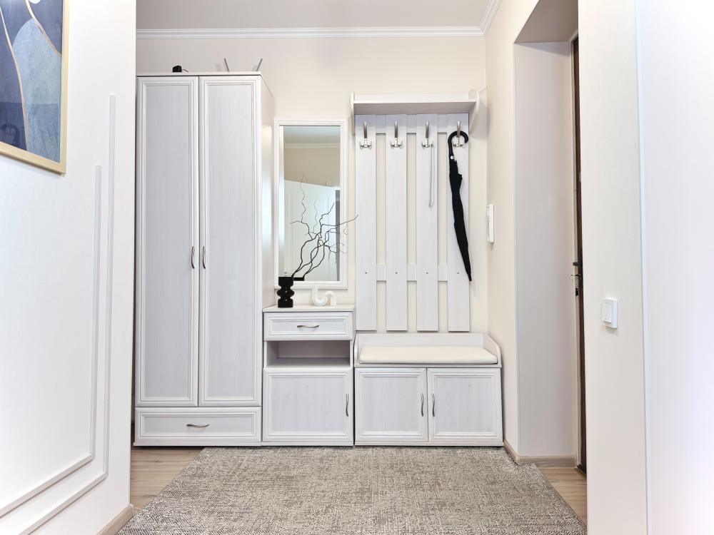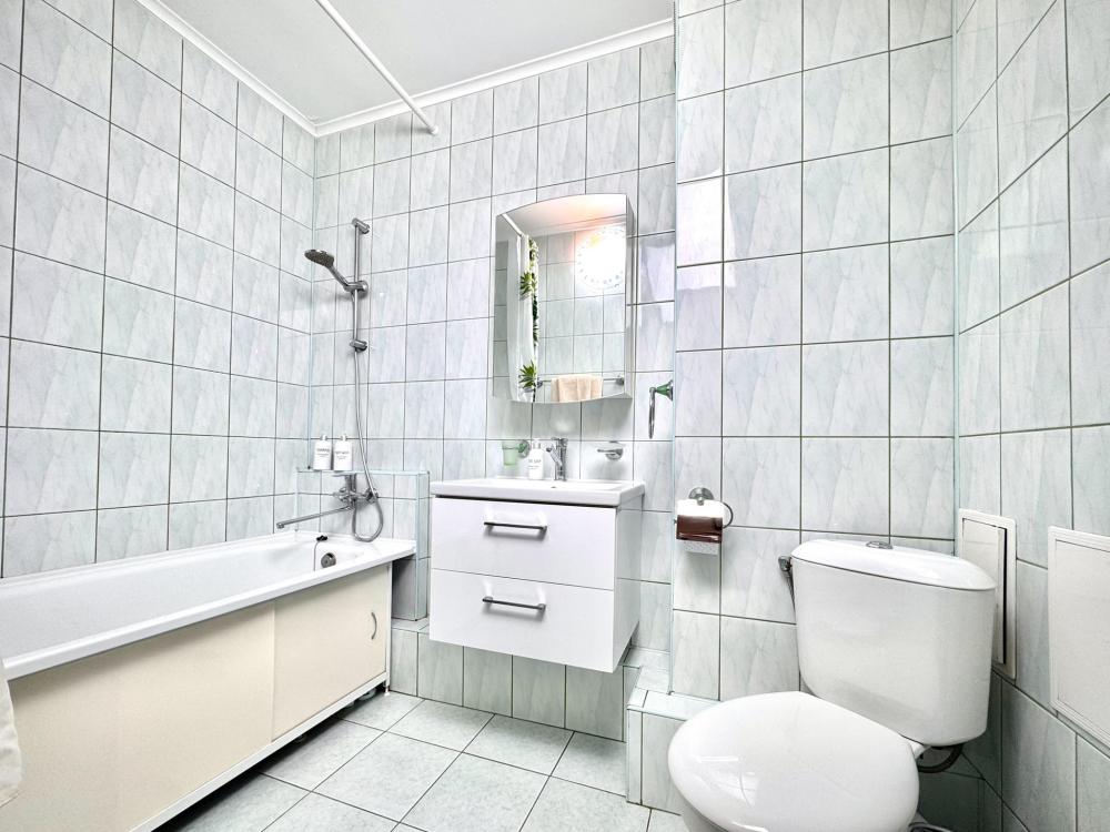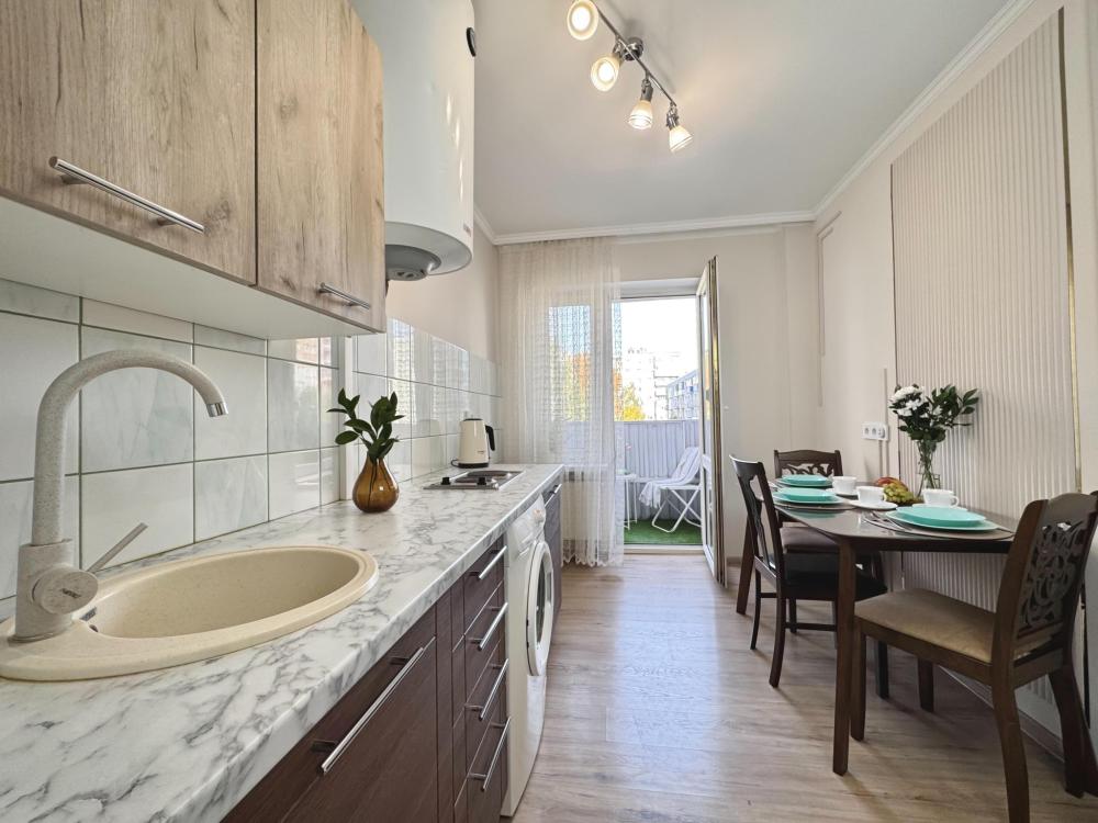 Однокомнатные апартаменты для 4 гостей. Спальные места: диван и двуспальная кровать. В квартире есть все необходимое для комфортного проживания: мебель и бытовая техника, чистое постельное бельё, посуда, WiFi, электроплита, СВЧ печь, холодильник, домофон, электрический чайник, утюг с гладильной доской, телевизор, большая кровать 180x200 см., двуспальный диван, полотенца.