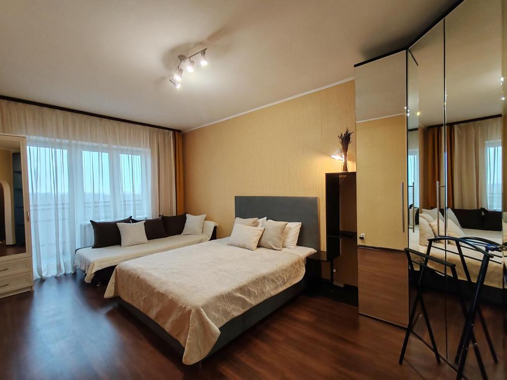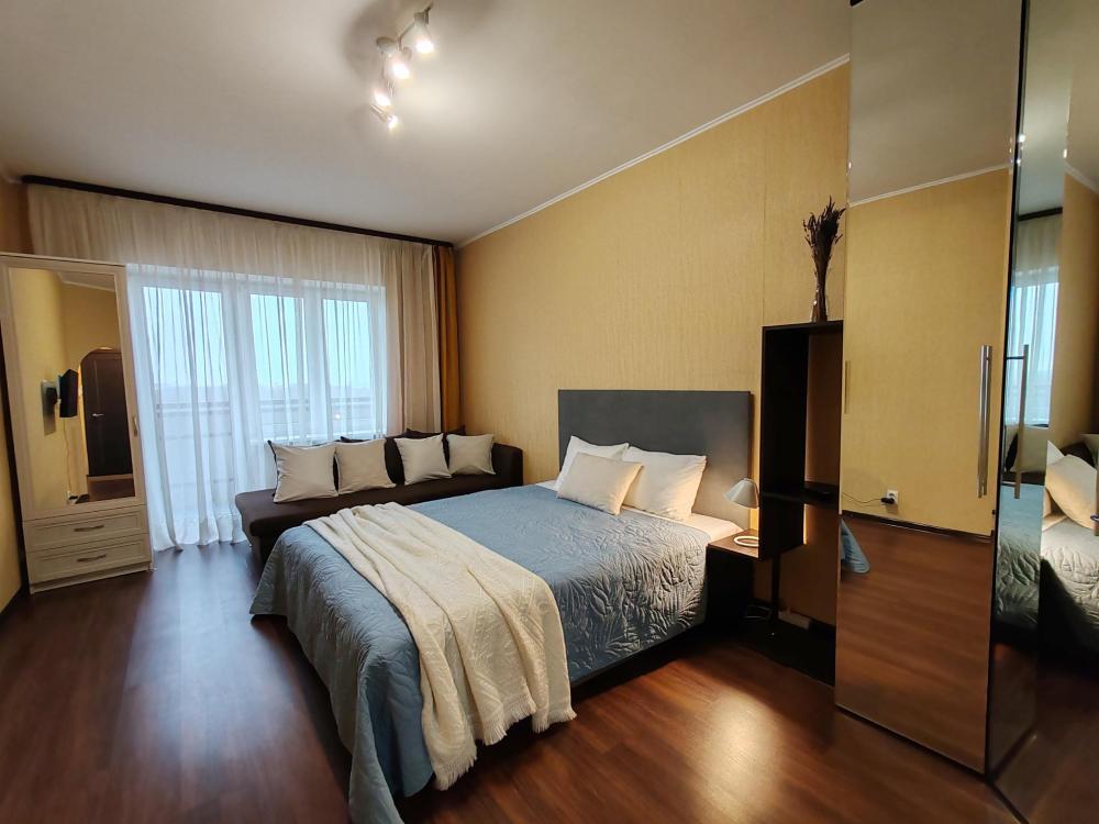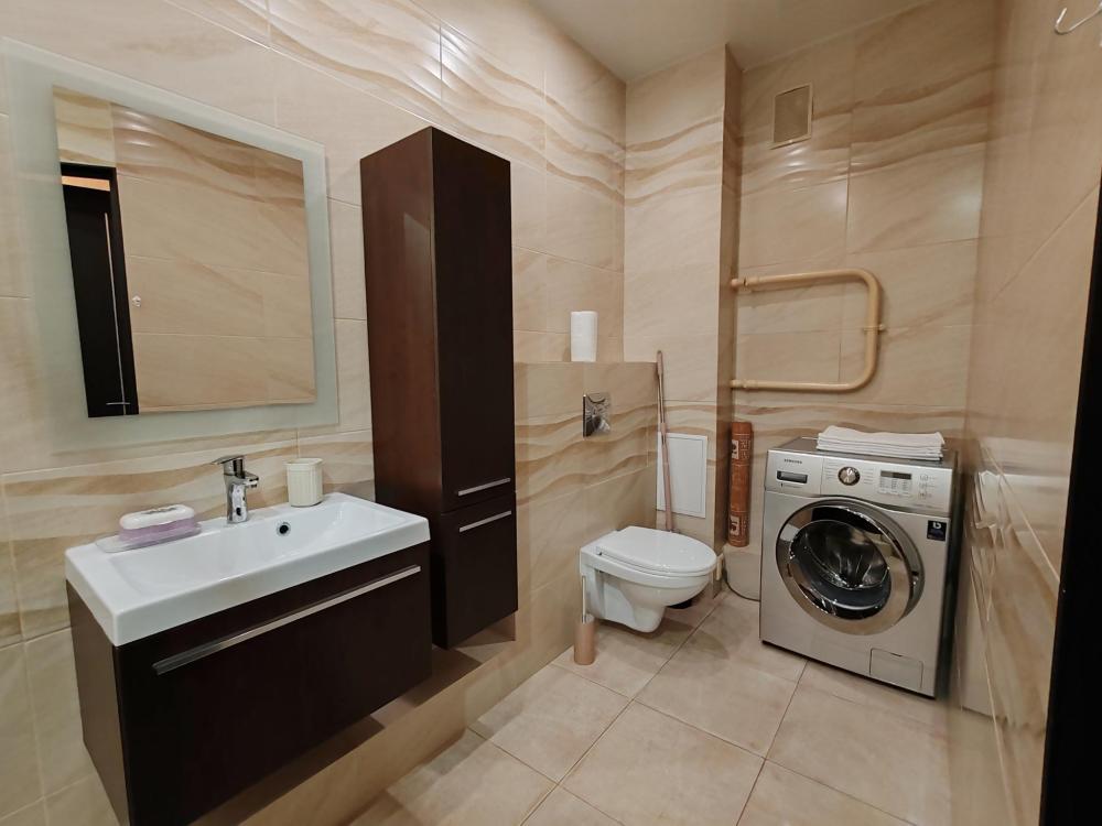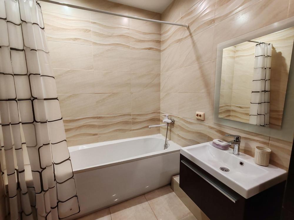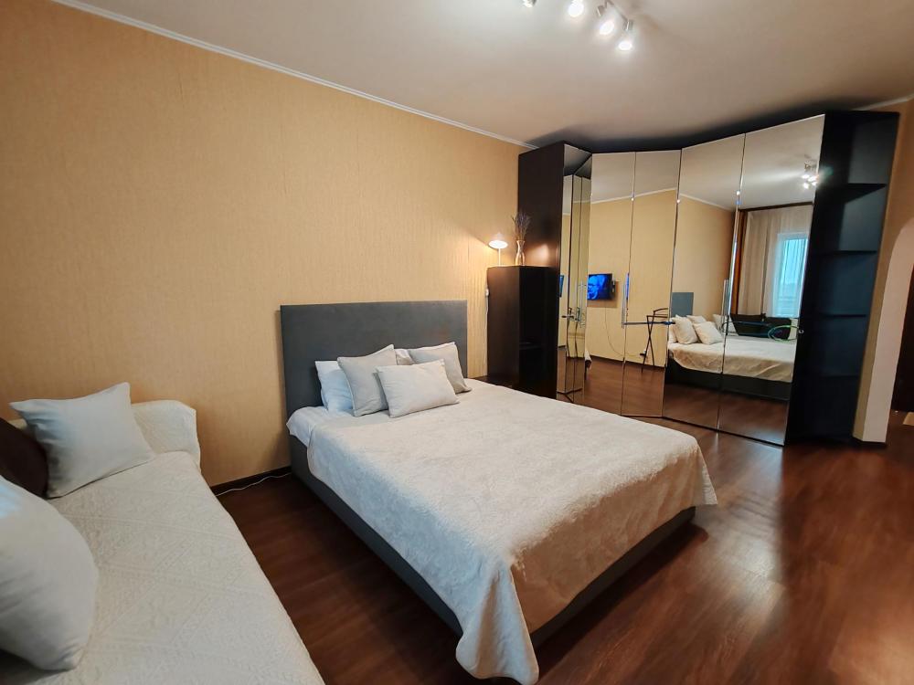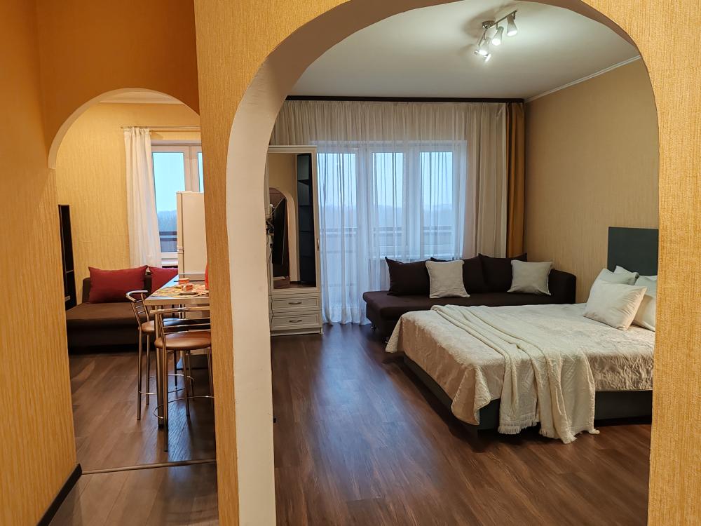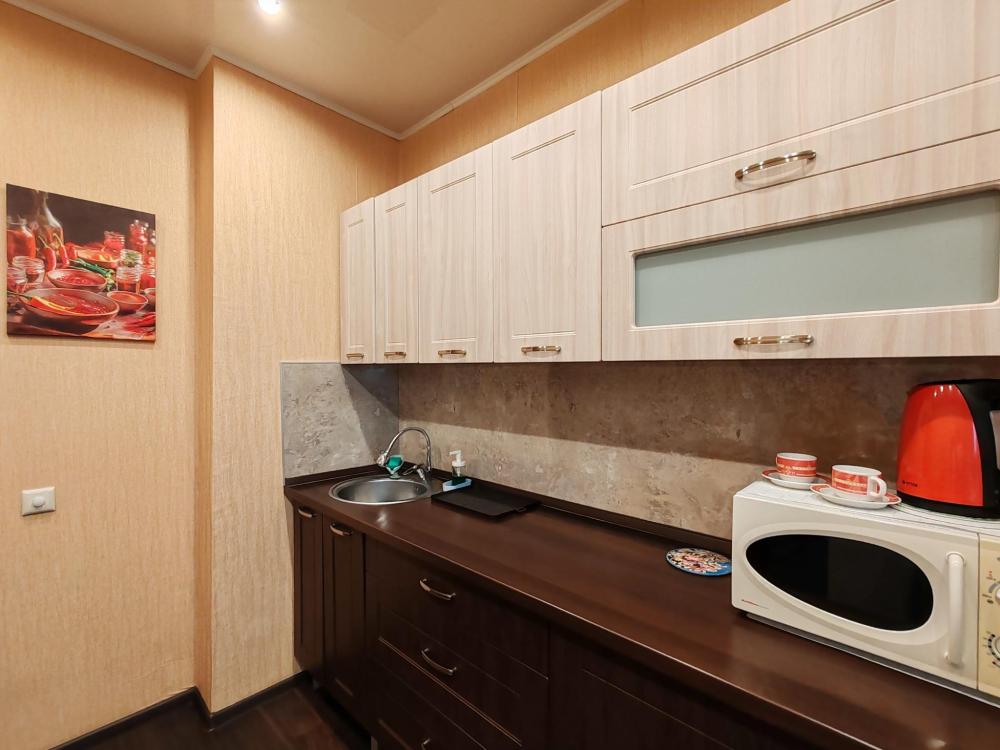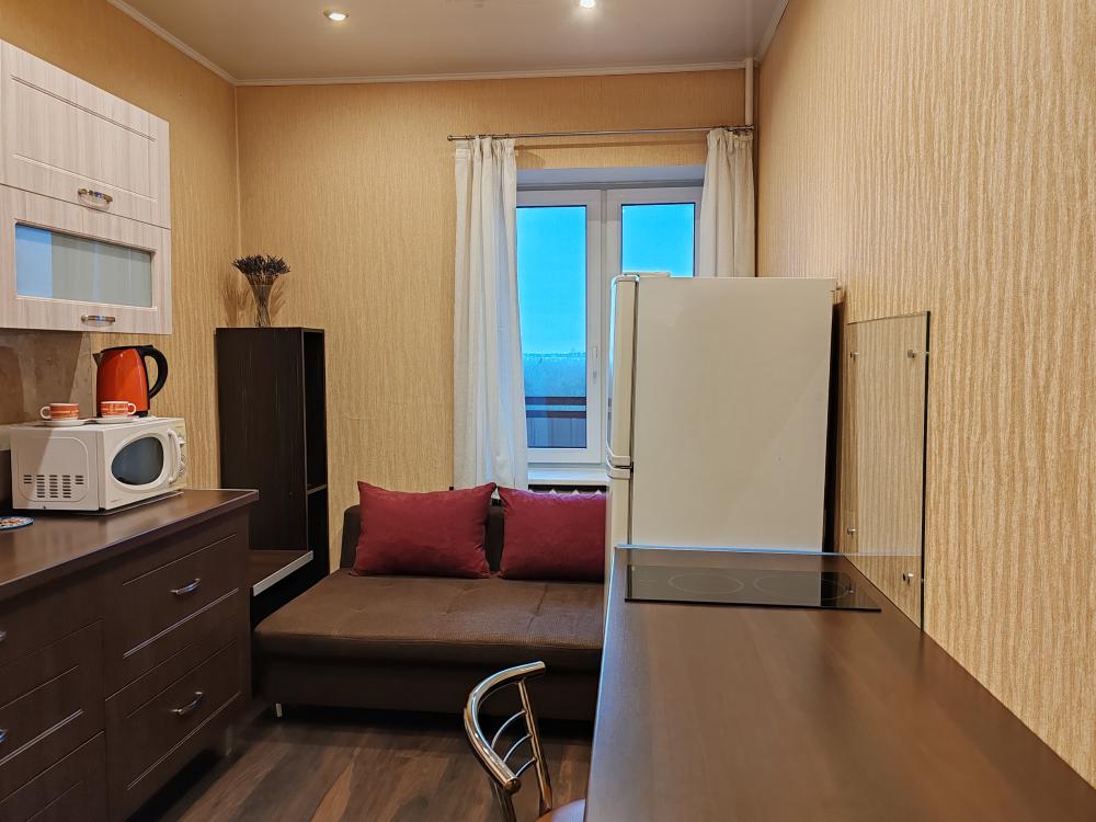 В апартаментах возможно размещение 2 человек. Спальное место: раскладной диван. Кухня оборудована необходимой посудой и техникой: электрическая плита, холодильник, чайник, микроволновая печь. К услугам гостей также wi-fi, телевизор, стиральная машина, фен, постельное белье, полотенца, средства личной гигиены.
